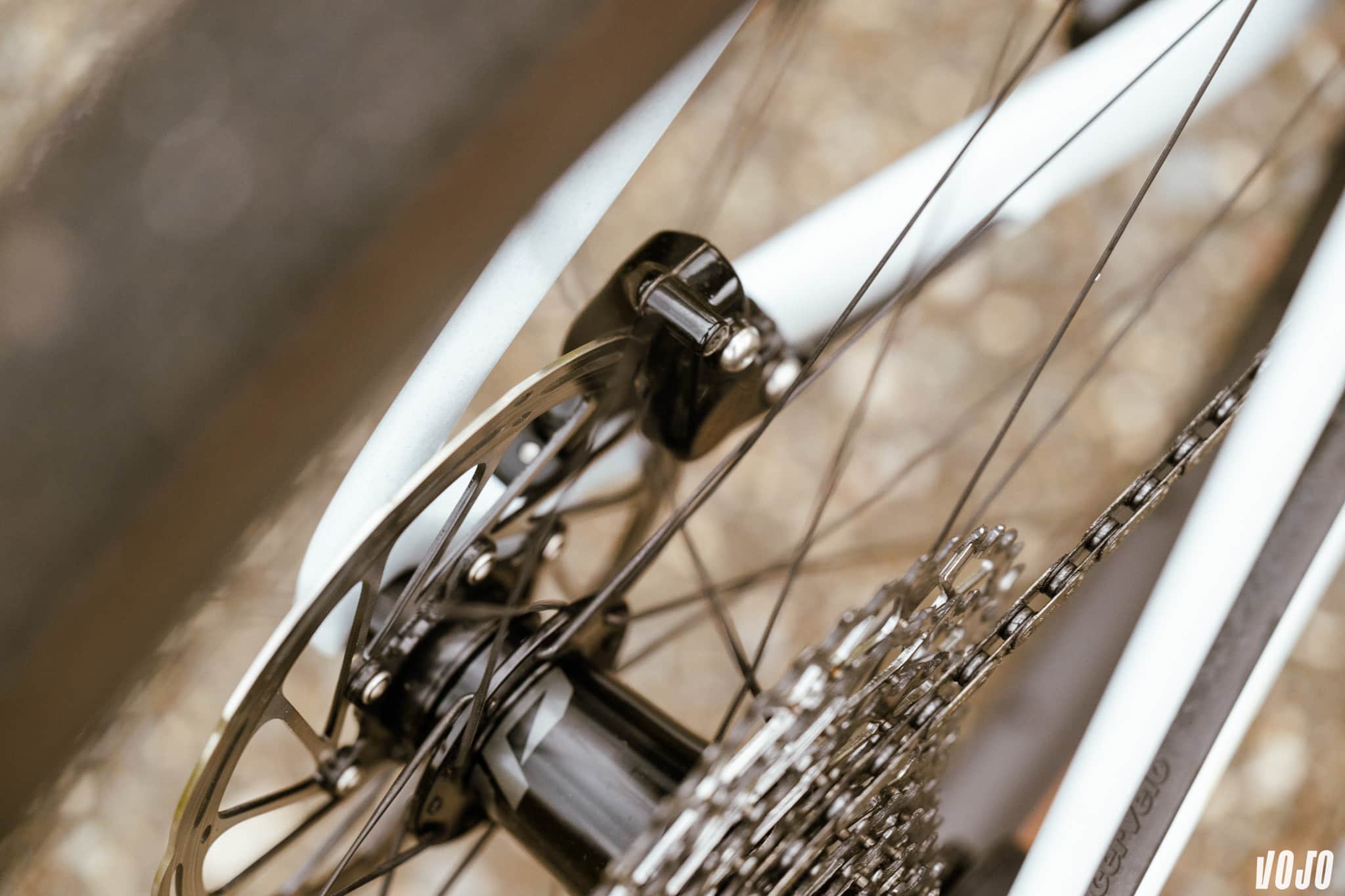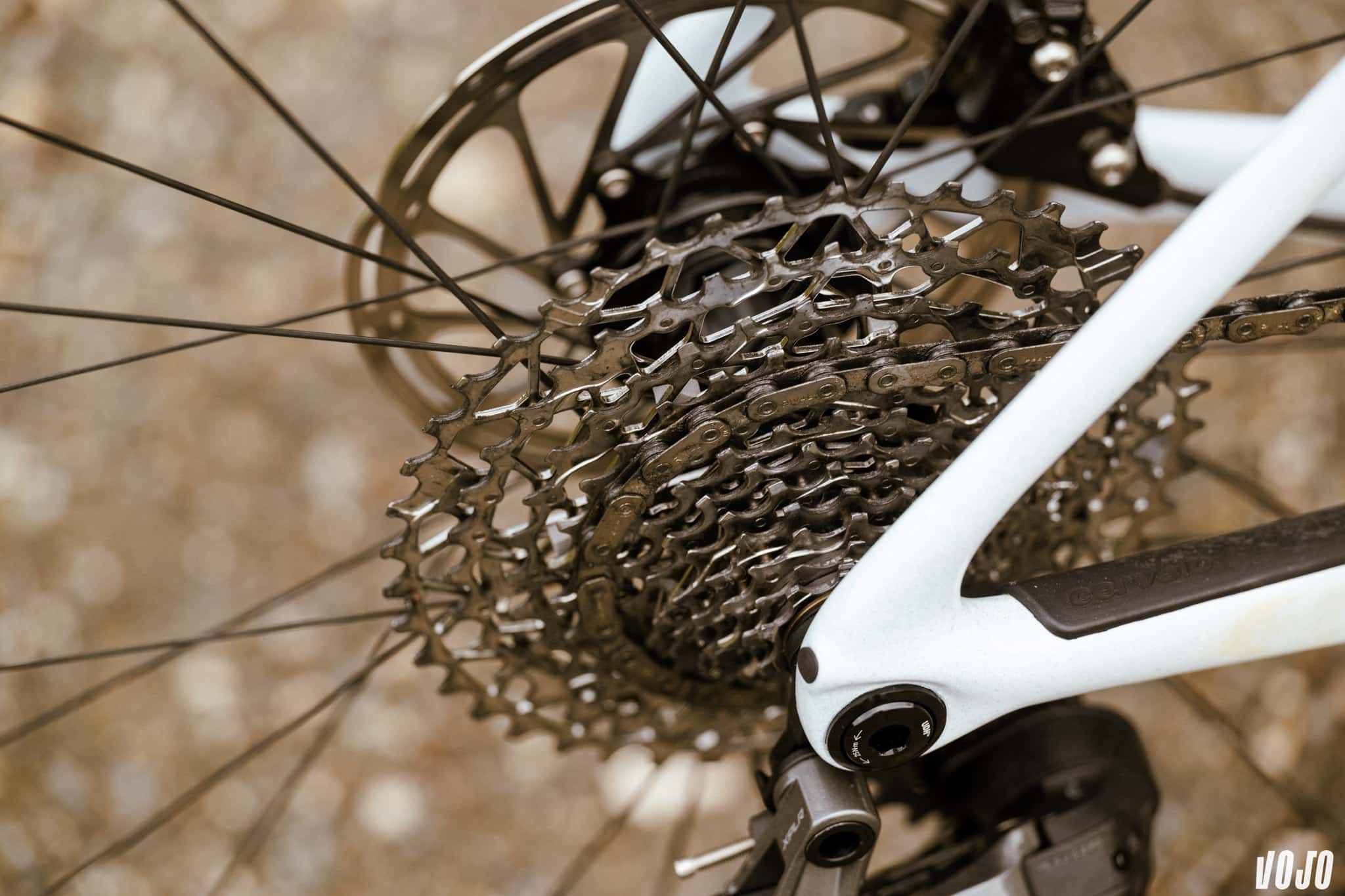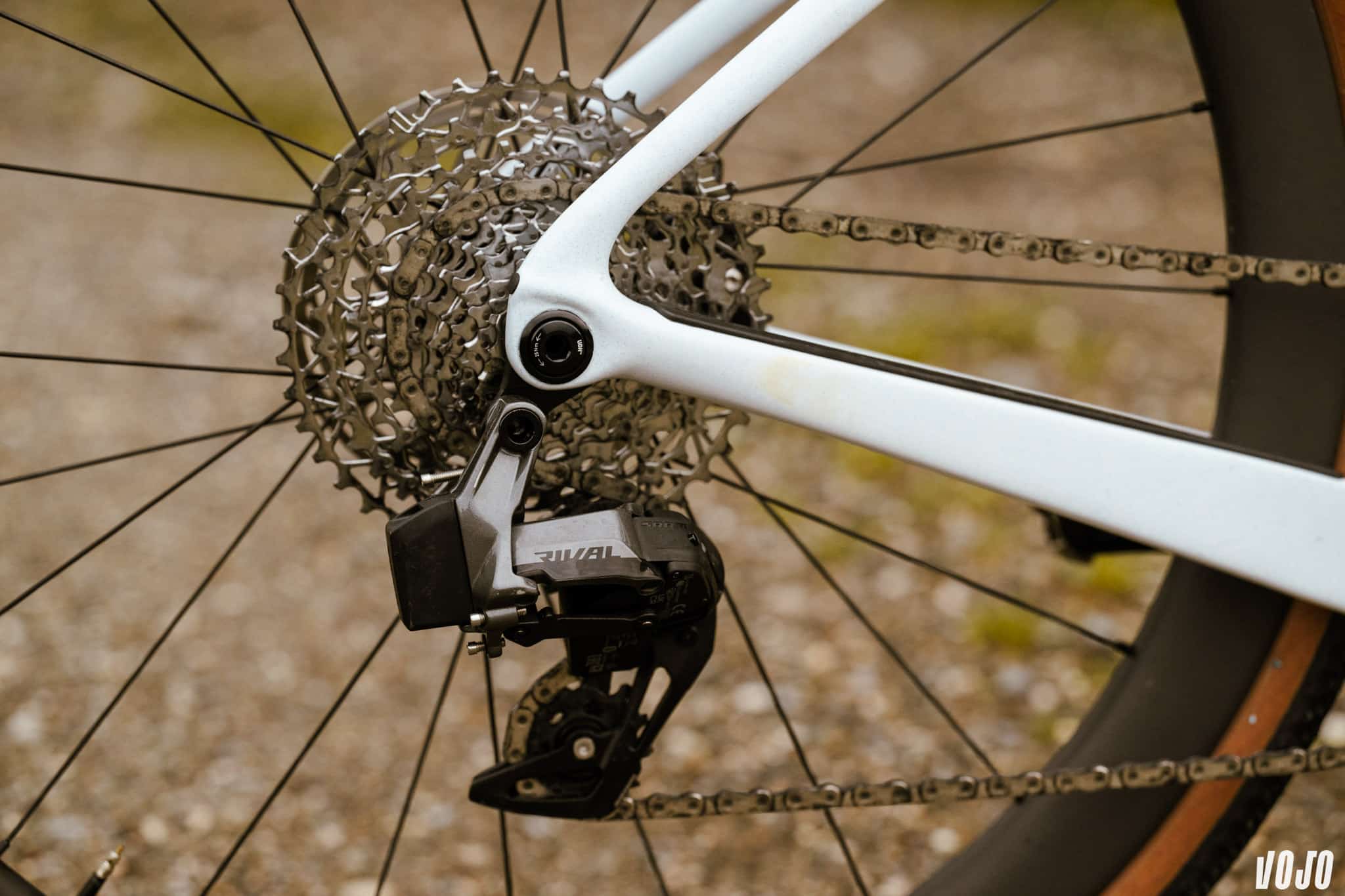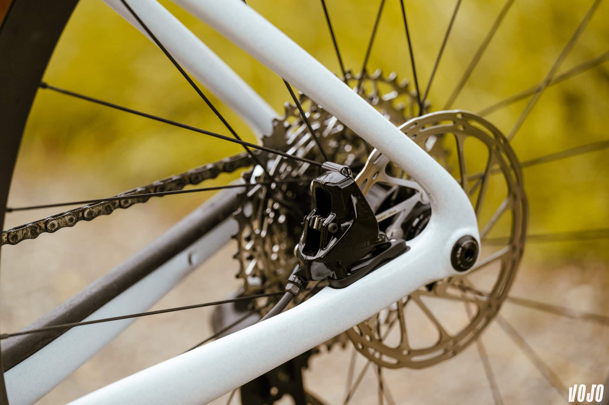 Dans cette version Sram Rival XPLR, l’Áspero s’est montré sur le papier très cohérent et cela ne diffère pas sur le terrain. La transmission est optimisée pour le gravel et s’est montrée adéquate avec une cassette en 10-44 et un plateau en 40 dents. Cela permet une bonne polyvalence même si dans les Alpes et hors des sentiers battus on a atteint certaines limites quand ça monte très raide. Pour les plus aventureux ou ceux désireux d’utiliser un montage en double plateau ou « mulet » avec une cassette de VTT et/ou un derailleur T-Type Sram, le cadre est compatible et on retrouve une ouverture pour le passage d’un câble si besoin.