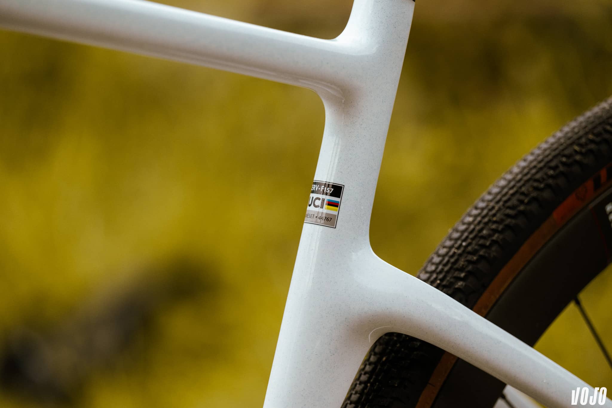 Le Cervelo Áspero est tout en carbone et on voit également les tubes s’affiner à certains endroits, notamment pour le tube inférieur. Ça devrait pouvoir permettre de gagner un peu en tolérance.
