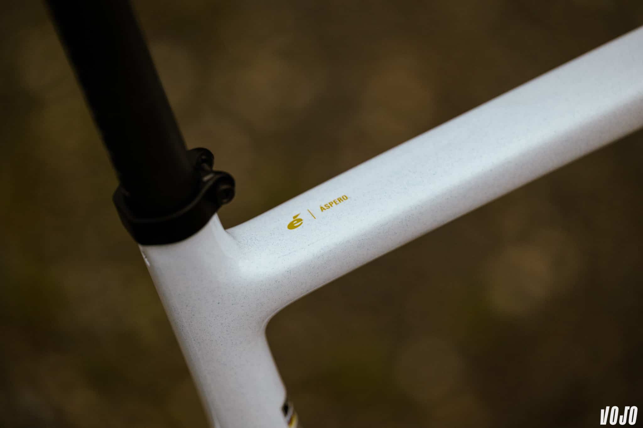 Attention à ne pas confondre l’Áspero et l’Áspero-5. Ce dernier est la version « course » du vélo et propose un cadre légèrement différent avec un triangle arrière plus court et un cadre plus léger. Côté équipements, le vélo intègre complètement les câbles et pousse sa recherche d’aérodynamisme. Les vélos, plus haut de gamme que l’Áspero, proposent des capteurs de puissance intégrés sur les montages les plus chers.