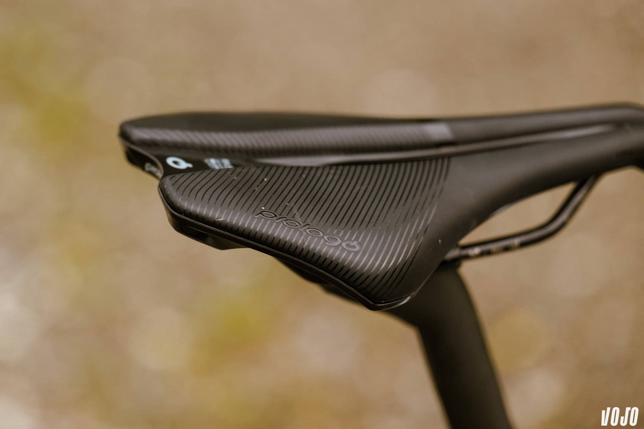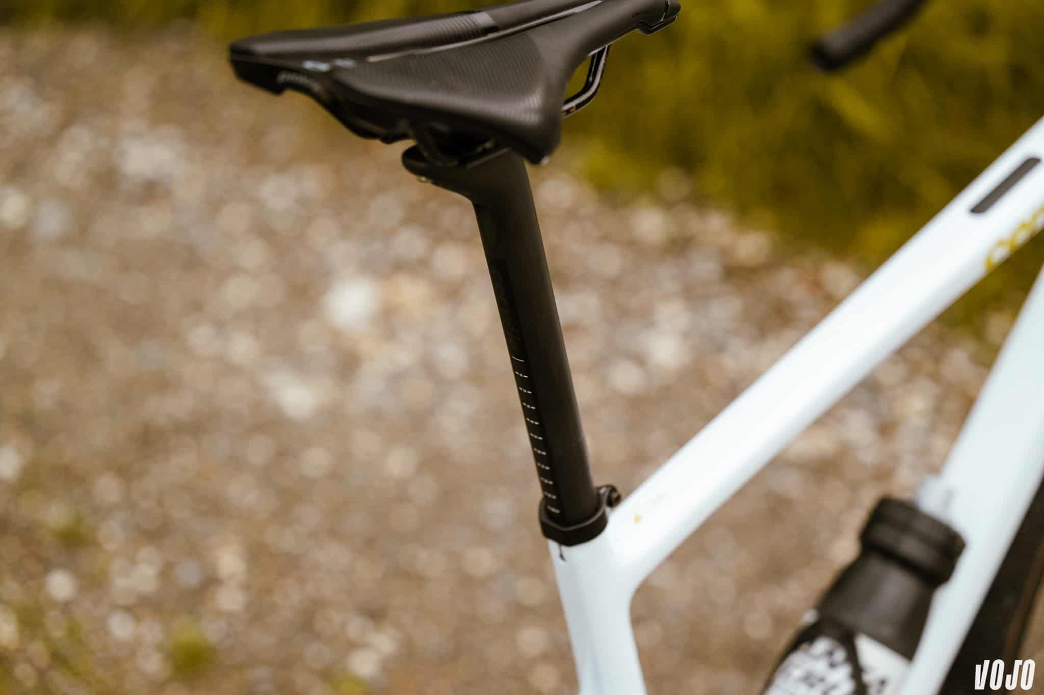 Nous n’avions pas publié de test de l’Áspero jusque-là, mais nous connaissions déjà la version qui a fait son succès. Nous ne sommes donc pas dépaysés quand on grimpe sur ce nouveau gravel. On est portés sur l’avant, la ligne d’épaule dans l’alignement de la direction, et on est parfaitement installés pour appuyer sur les pédales et produire son effort. La selle propose une assise courte et un bec plongeant, ce qui renforce cette sensation.