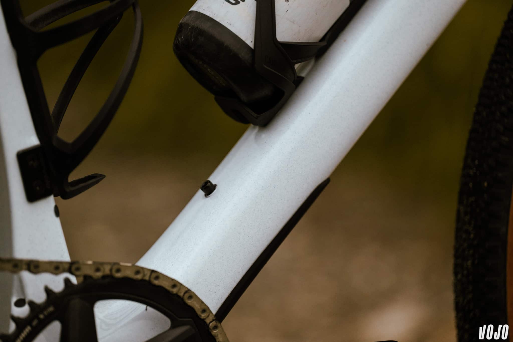 D’autres inserts sont également disséminés sur le cadre pour installer deux porte-bidons. Sur le tube diagonal, trois trous permettent d’ajuster la position du système en fonction de nos préférences, de la taille du bidon ou de la bagagerie utilisée. Enfin, deux protections sont apposées sur le cadre. Minimalistes mais efficaces, elles s’intègrent parfaitement dans l’esthétique du vélo et ont très bien rempli leur rôle pendant notre test.