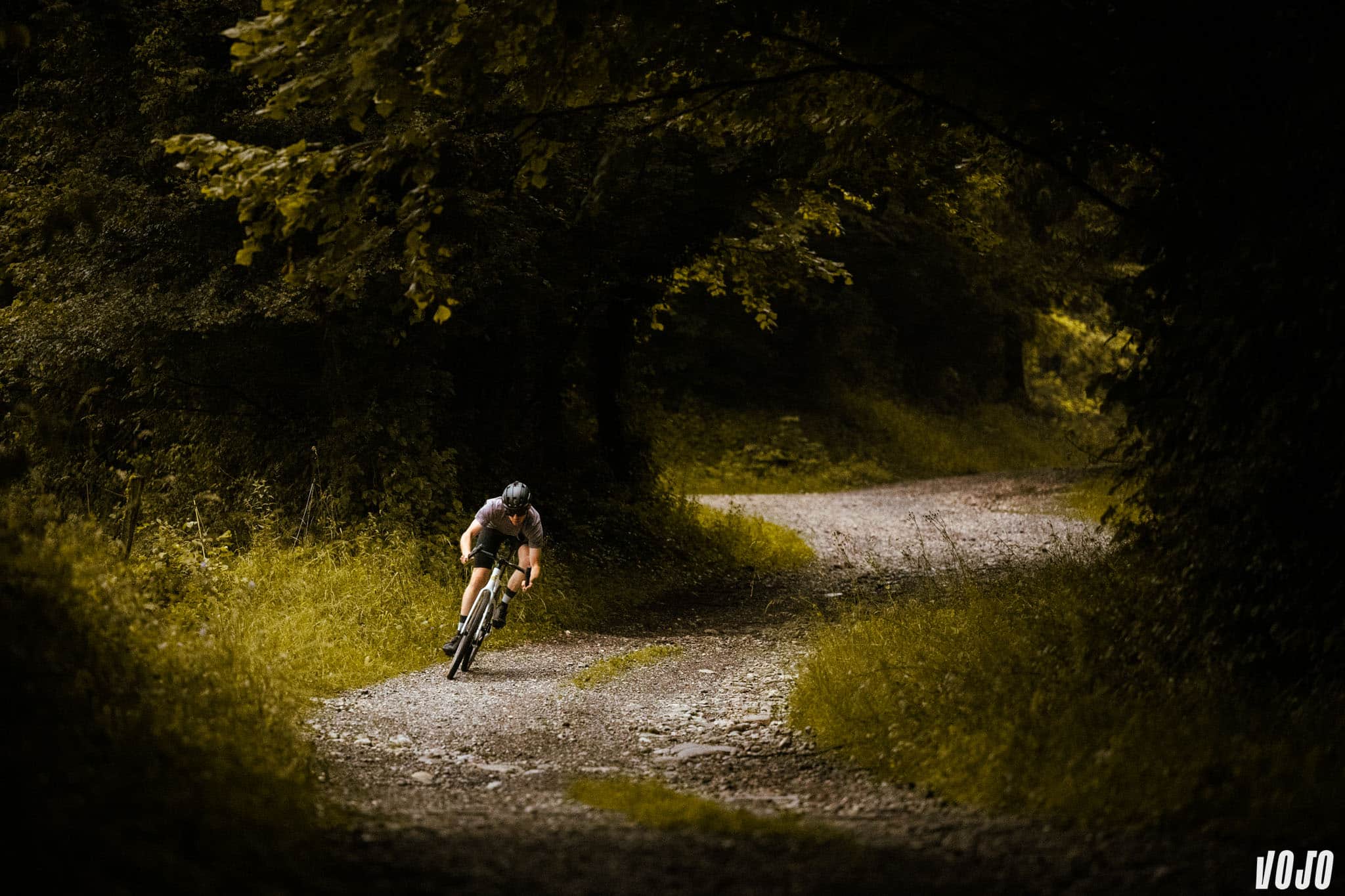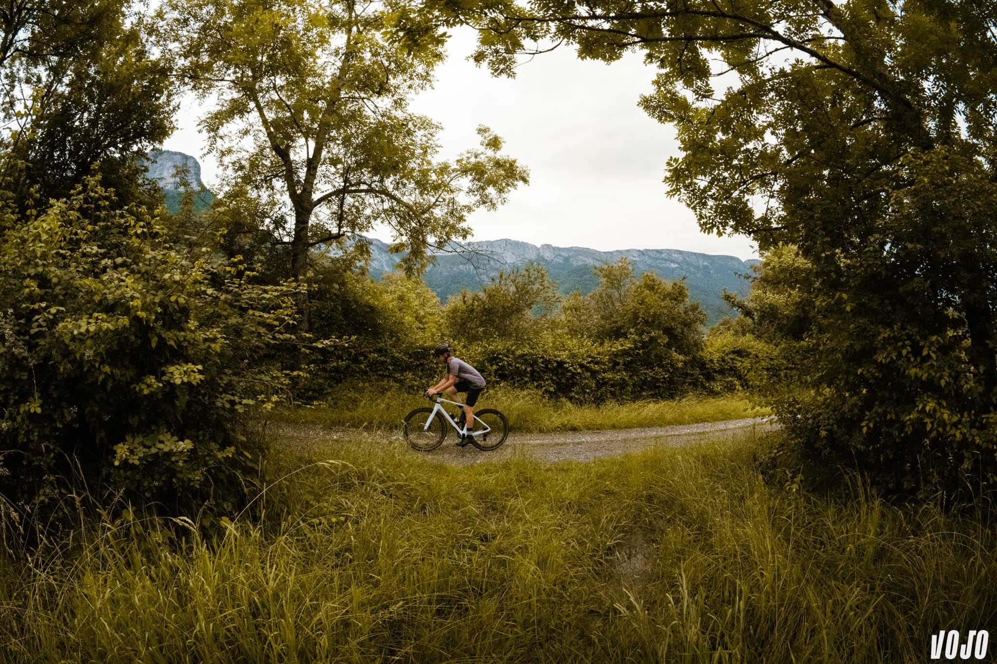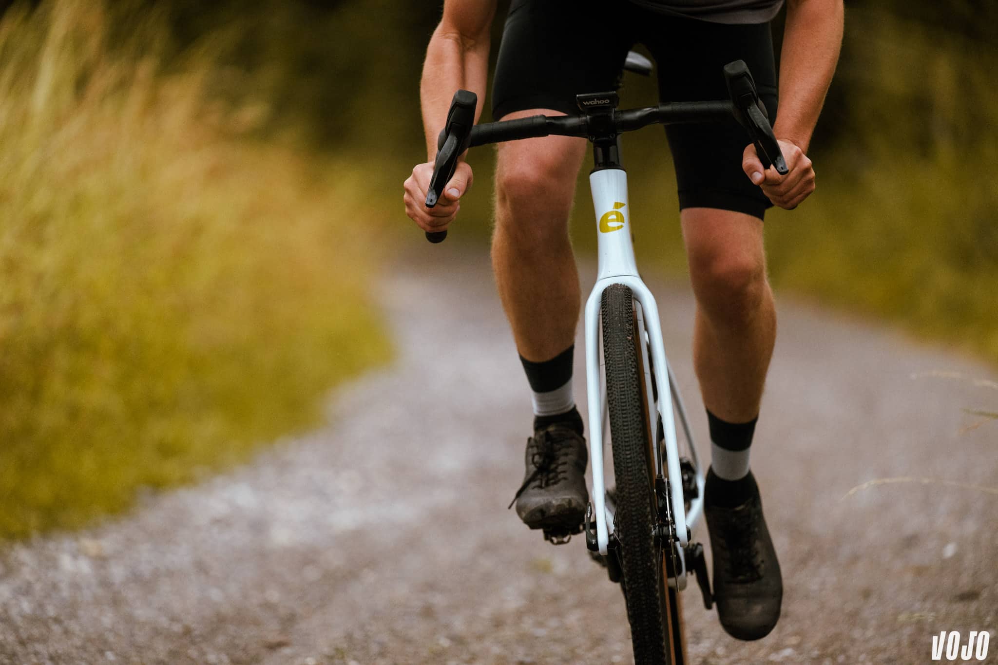 Une fois la hauteur de selle définie, il n’a pas été nécessaire d’abaisser outre mesure la potence tant l’avant est suffisamment bas. La bascule du corps sur la direction permet une bonne maitrise du pilotage, une précision dans les appuis ainsi qu’une belle efficacité au pédalage dans les montées. Ici, l’Áspero tranche nettement avec les interprétations du gravel de marques plutôt typées aventure. On est confronté à des sensations qu’on pourrait retrouver sur un vélo de route et on se surprend à prendre naturellement des positions aéro et vouloir appuyer davantage sur les pédales que notre condition physique ne nous le permet. Aux oubliettes la gestion de l’effort, ce vélo en redemande à chaque relance ! Mais il serait dommage de le réduire à un vélo de route bodybuildé.