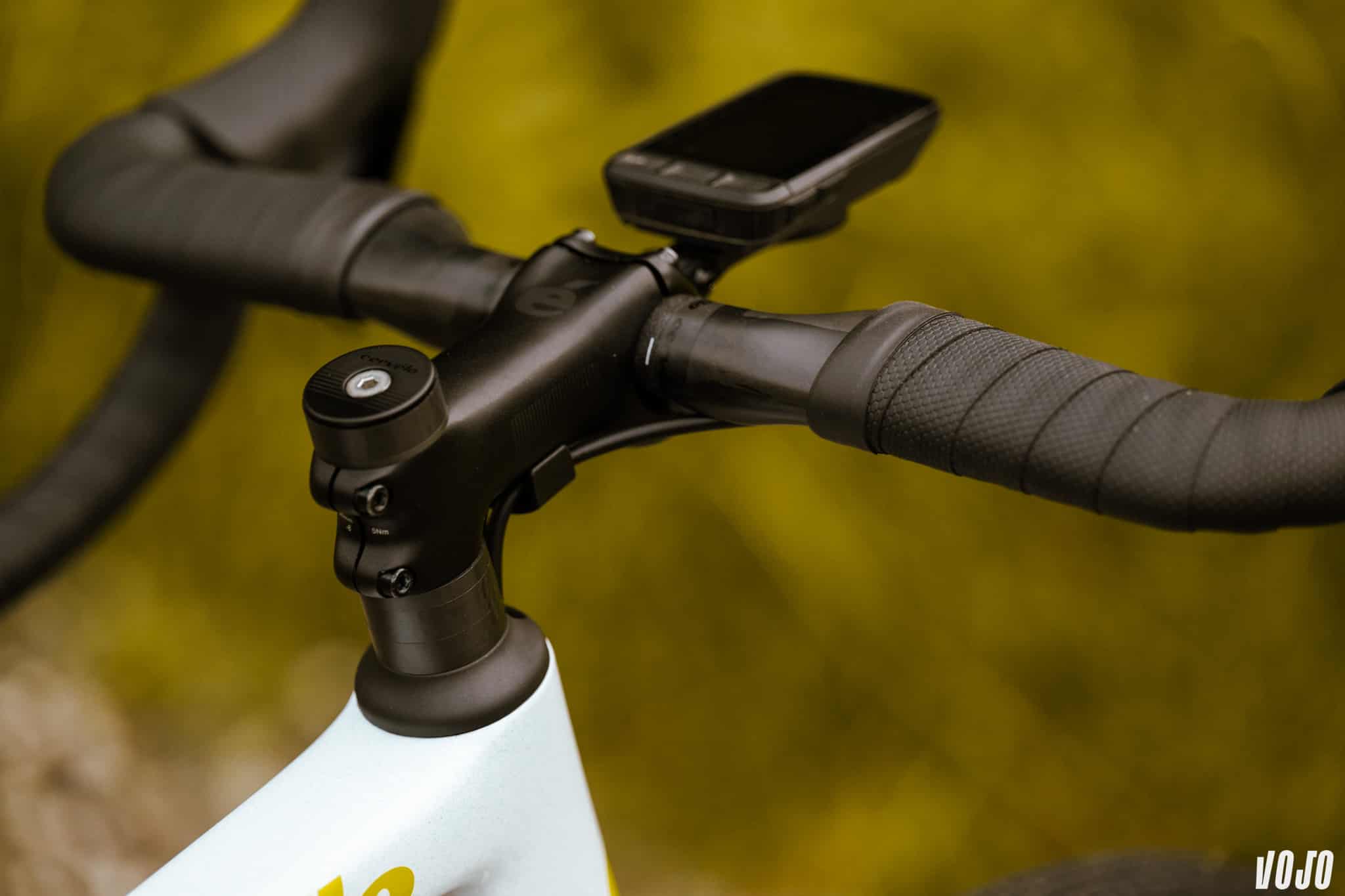 On a apprécié le cintre plat offrant un répit salvateur pour les mains, surtout après avoir été secoué de longs moments. Son flare de 16 degrés s’est avéré correct et permet un appui stable et rassurant dans les descentes, même si ce n’est pas le plus «gravel » des cintres de la catégorie. Impactant favorablement le poids de l’ensemble, sa construction carbone ne nous a pas semblé porter préjudice face à la filtration des vibrations.