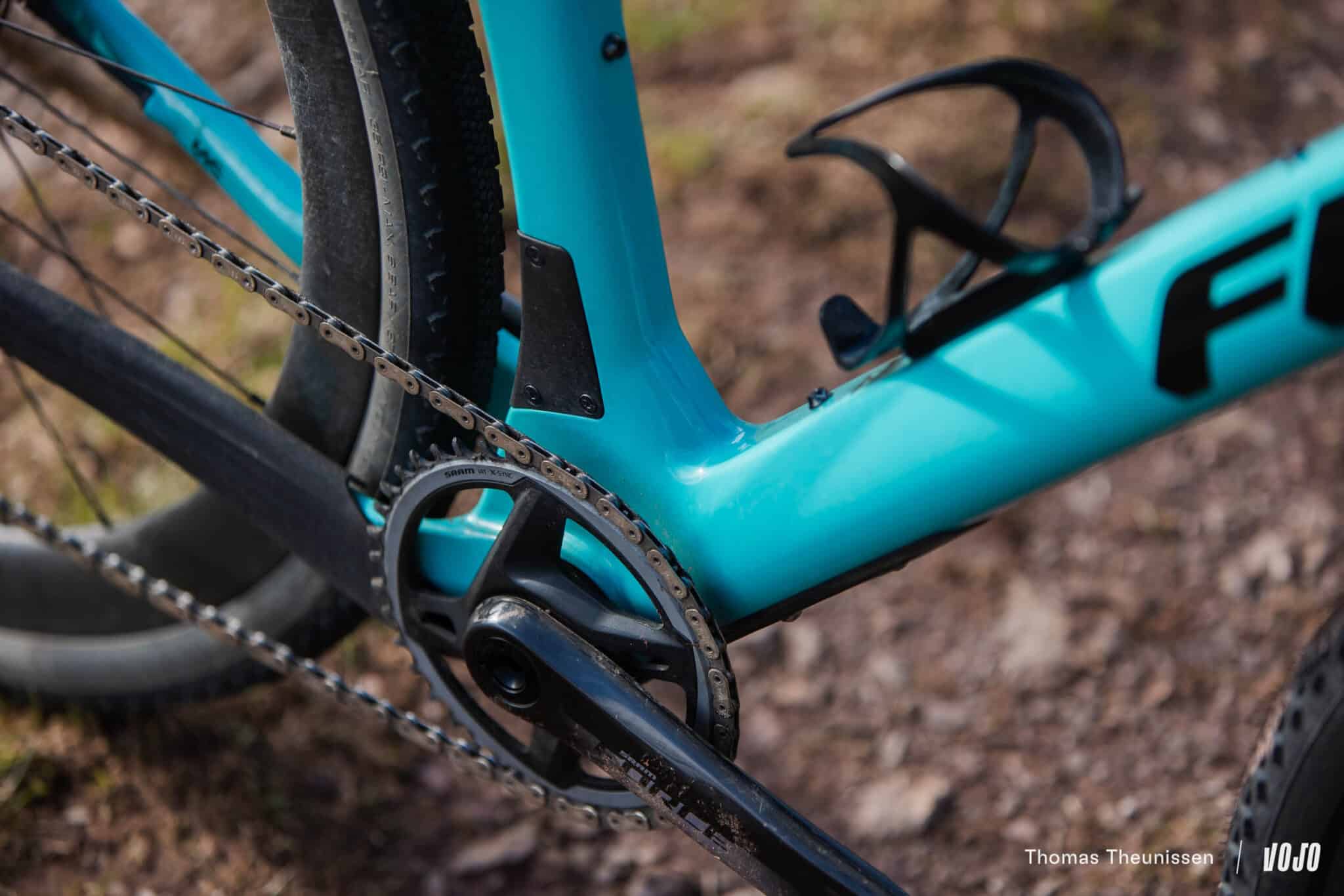 La zone du boîtier de pédalier est particulièrement imposante. Une encoche recouverte d’un cache est prévue pour accueillir un dérailleur avant en cas de montage double plateau, et on note que le boîtier de pédalier est au format T47 permettant d’accueillir des roulements plus gros dans le cadre, avec des inserts filetés, pour combiner rigidité, fiabilité et facilité d’entretien. Il peut accueillir un plateau avant jusque 52 dents en mono et un petit plateau de 44 dents en montage double.