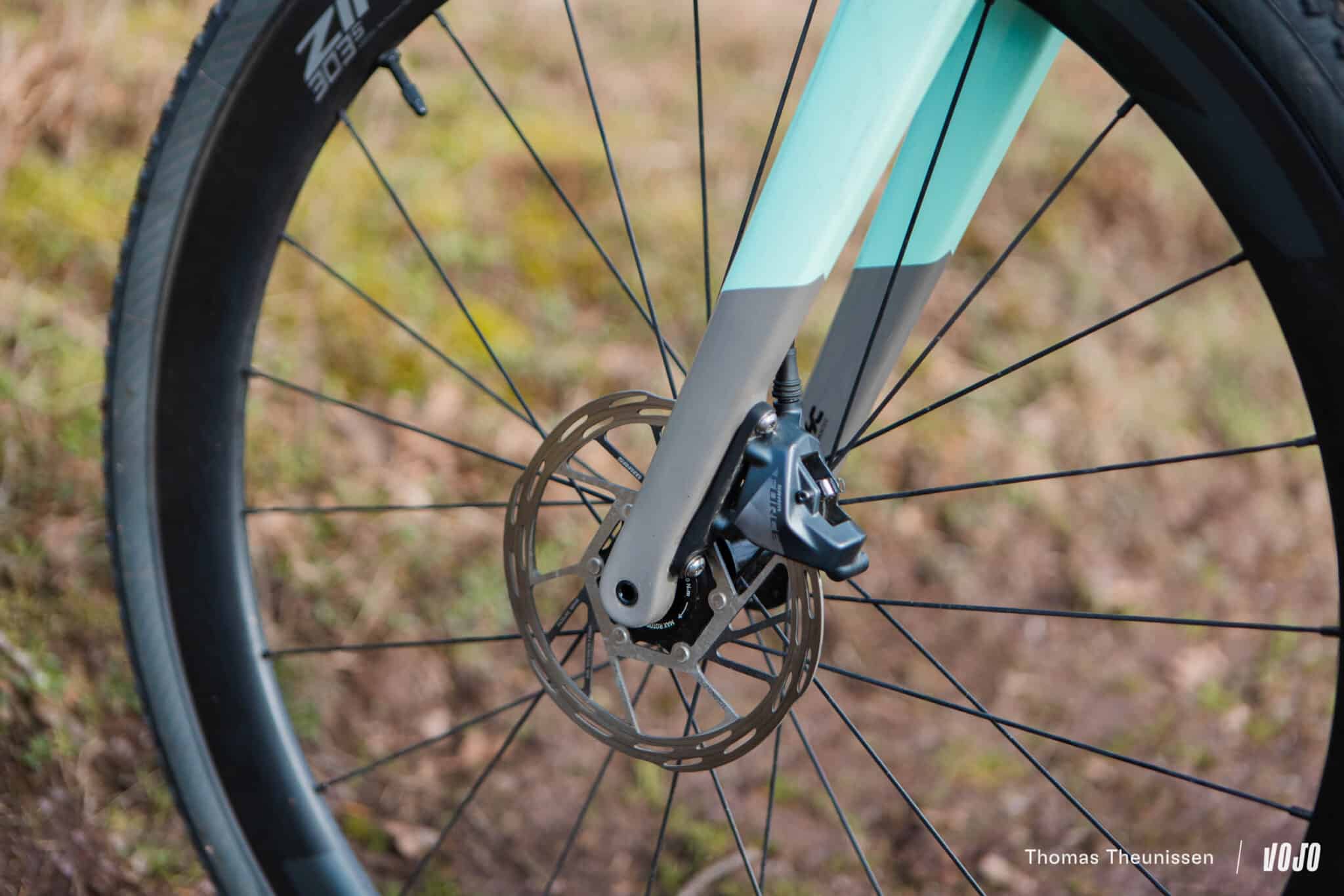 L’ergonomie des leviers Sram Force a progressé et devient plus adaptée à un usage gravel aujourd’hui, mais l’efficacité globale du freinage Sram reste un peu en retrait par rapport à Shimano selon nous. En disques de 160mm, ça freine, mais on peut faire mieux au niveau du toucher et de la résistance à la chauffe dans les longues descentes.
