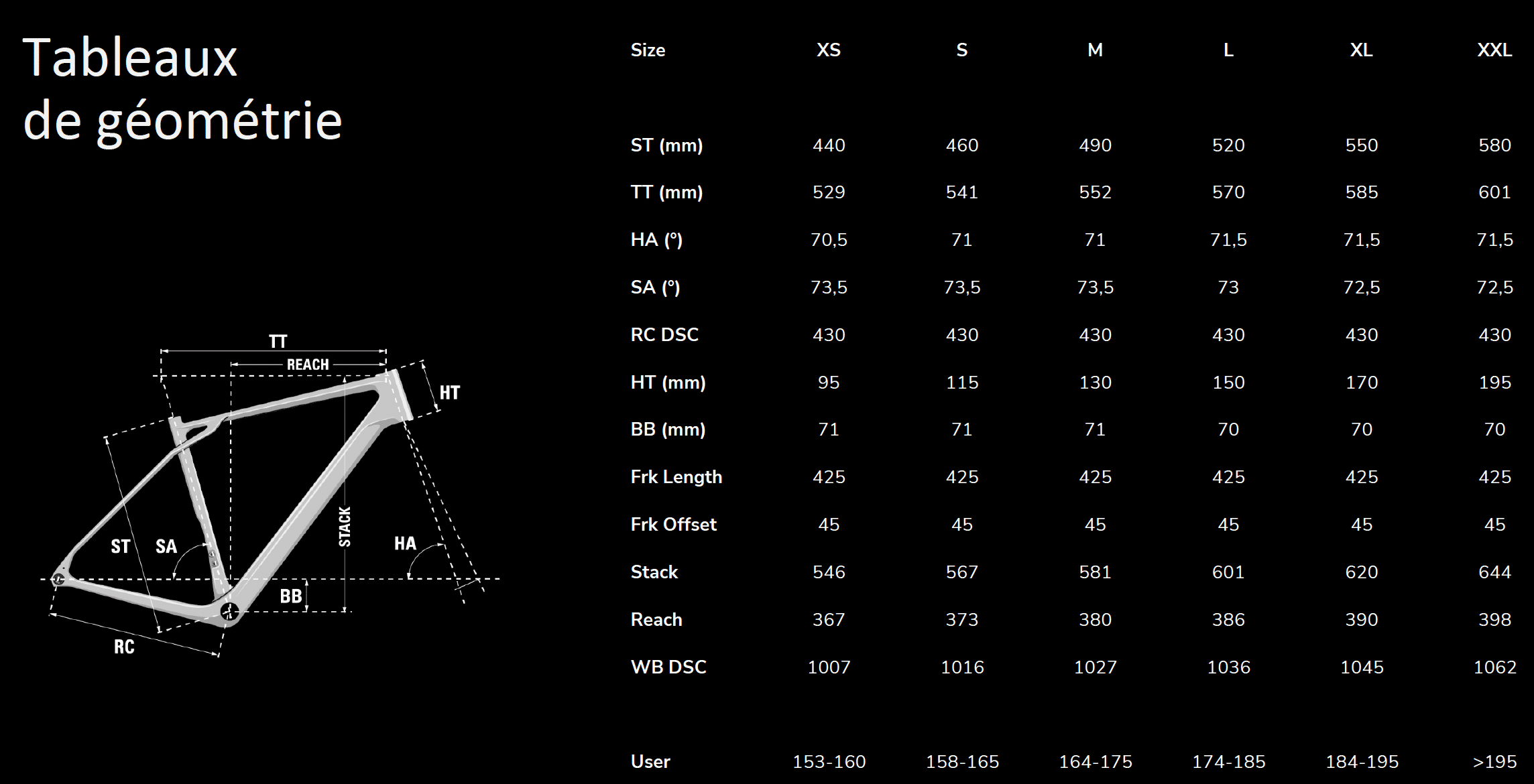 Dans la tendance actuelle qui tend à rallonger les gravel, le Lapierre Crosshill CF se distingue par une géométrie plus inspirée de la route : tube supérieur et reach courts (respectivement 552 mm et 380 mm en taille M), potence assez longue (de 80 mm en S à 110 mm en L), angle de direction entre 70,5° et 71,5°, angle de tube de selle entre 72,5 et 73,5°… Avec les bases de 430 mm, cela dessine un vélo assez nerveux et réactif.