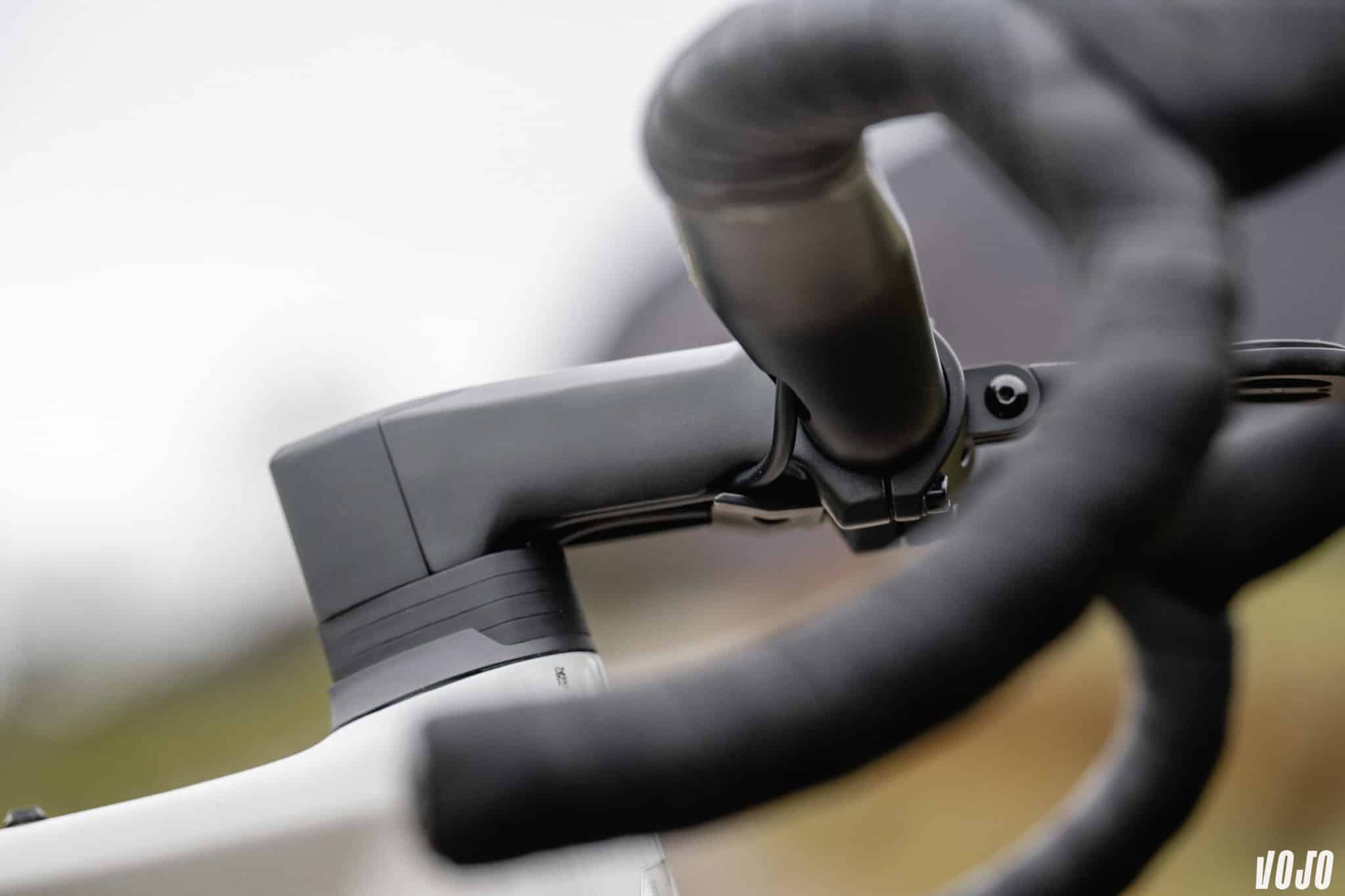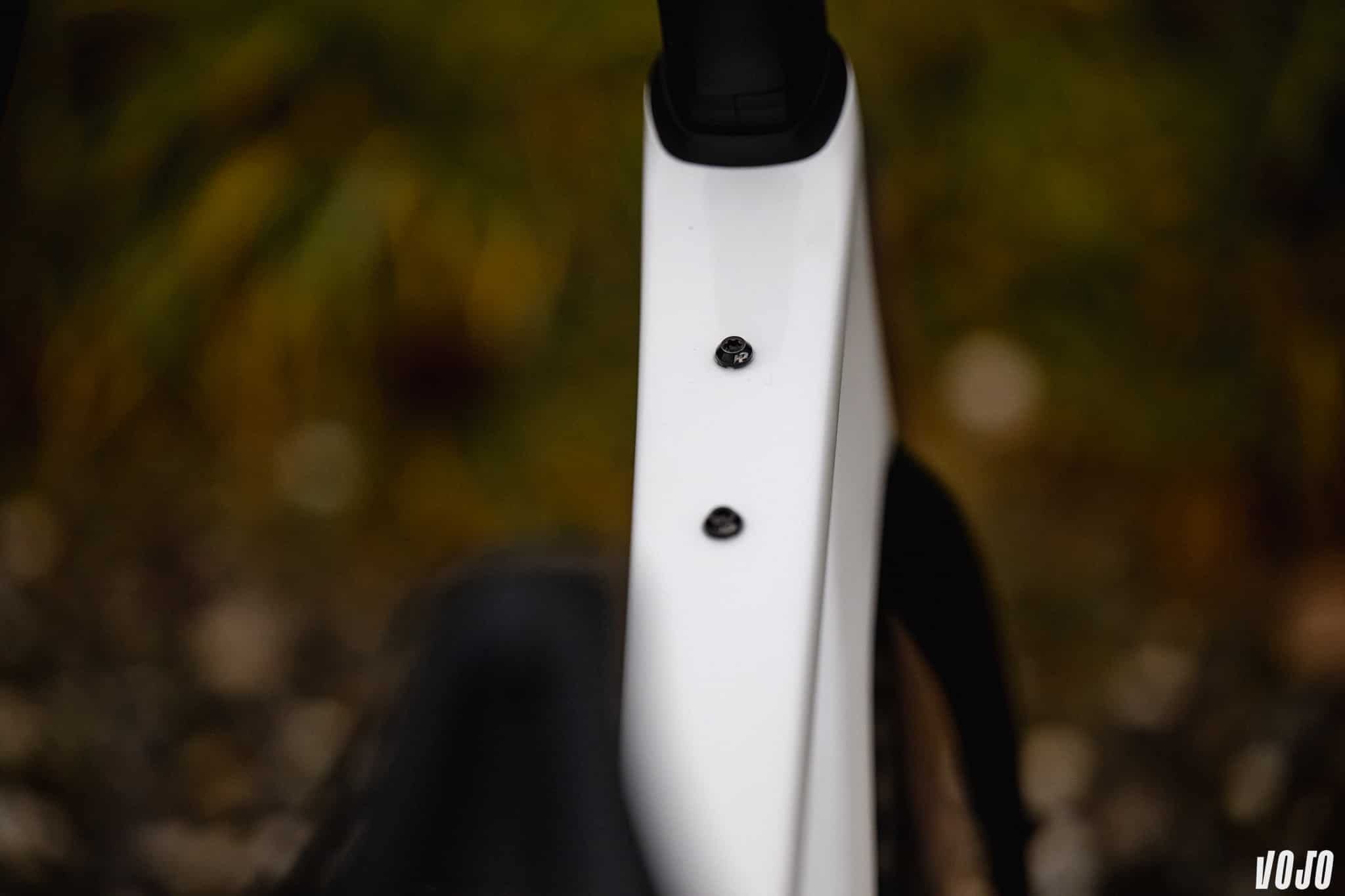 Les gaines passent en interne via le jeu de direction et il n’y a pas de protection sur le tube diagonal, comme parfois en gravel. A la place, on trouve une petite trappe qui permet d’accéder (difficilement) aux gaines mais surtout de stocker une batterie Di2 pour les transmissions électroniques Shimano.