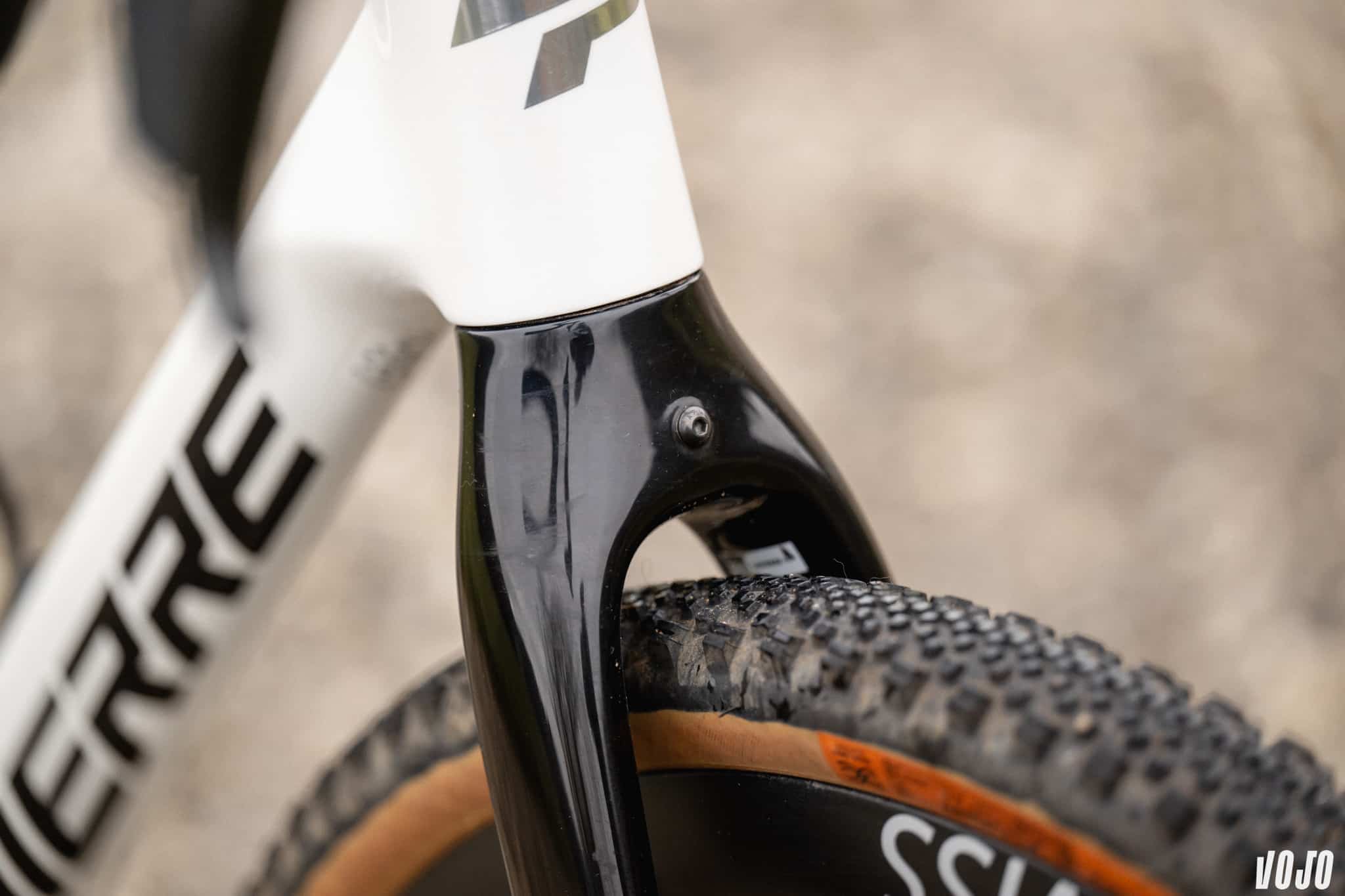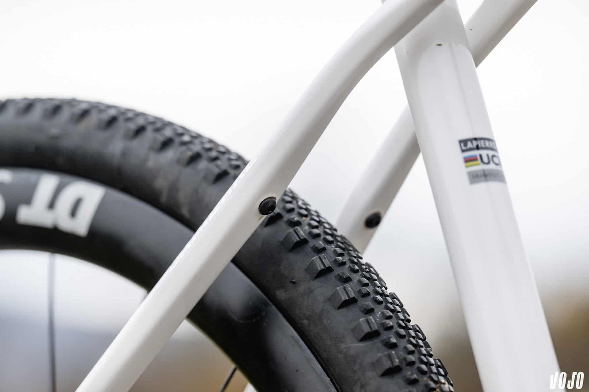 Vous aurez certainement remarqué que nos pneus ne sont pas de la même couleur. D’origine, les deux ont les flancs beige mais notre vélo est passé entre les mains d’un ambassadeur Lapierre le temps du Roc d’Azur et en est revenu avec une crevaison mal placée. La marque nous a renvoyé un pneu pour terminer l’essai et si les caractéristiques (modèle, carcasse, section) sont identiques à celui d’origine, ce n’était malheureusement pas le cas de la couleur.