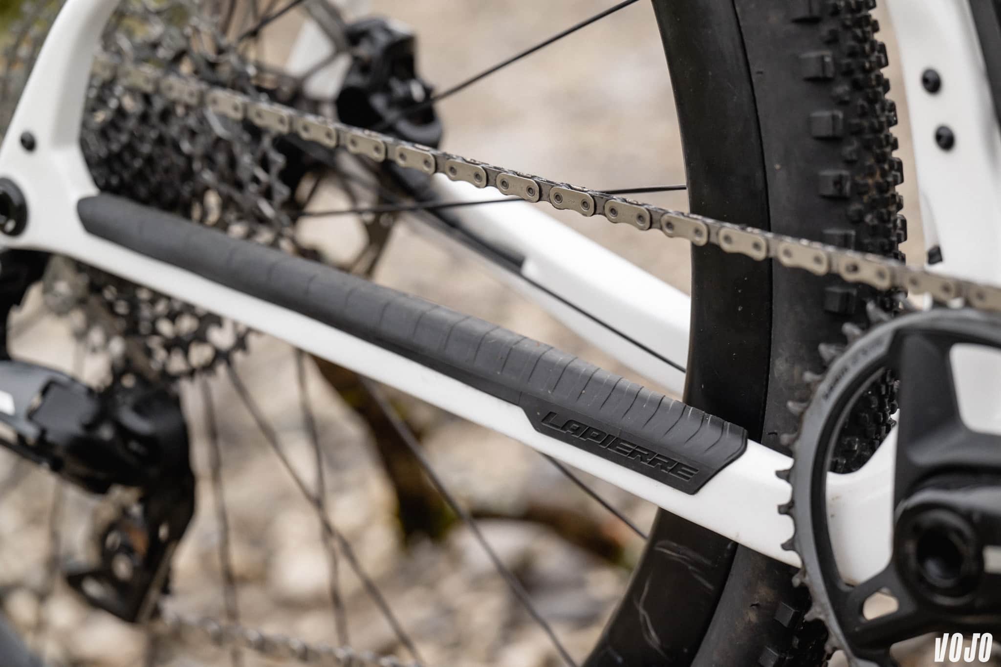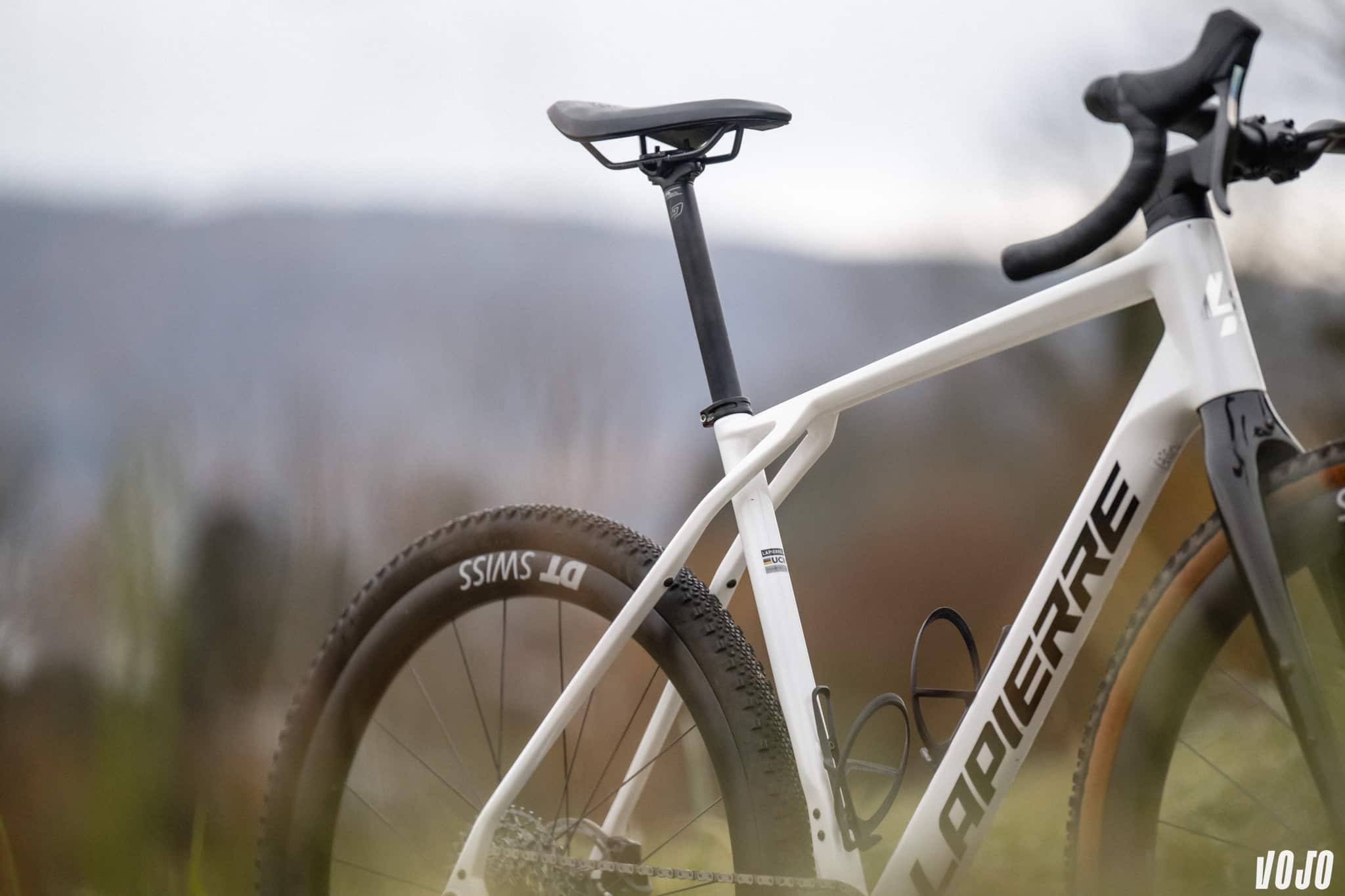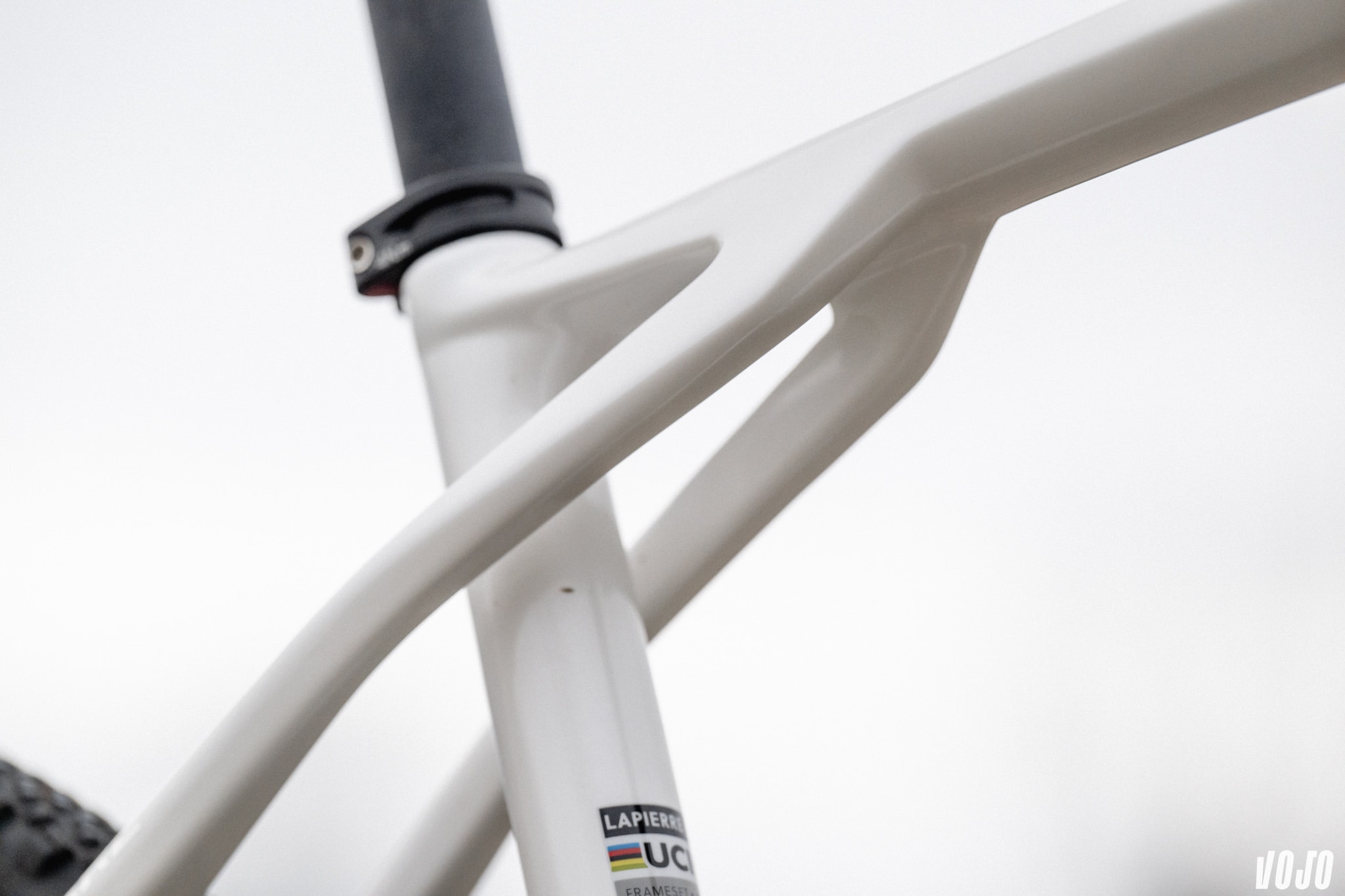 On doit ce comportement à la forme très particulière des haubans, qui ne forment pas une droite reliant directement l’axe de roue arrière au triangle avant et « sautent » en plus de ça le tube de selle pour aller s’accrocher plus loin, sur le tube horizontal. Lapierre appelle ce concept le « 3D Tubular », une signature qu’on trouve sur d’autres modèles rigides ou semi-rigides du catalogue, et annonce 12 % d’absorption des vibrations en plus à 40 km/h par rapport à une conception classique.
