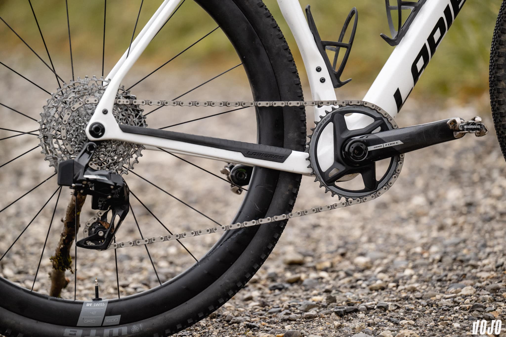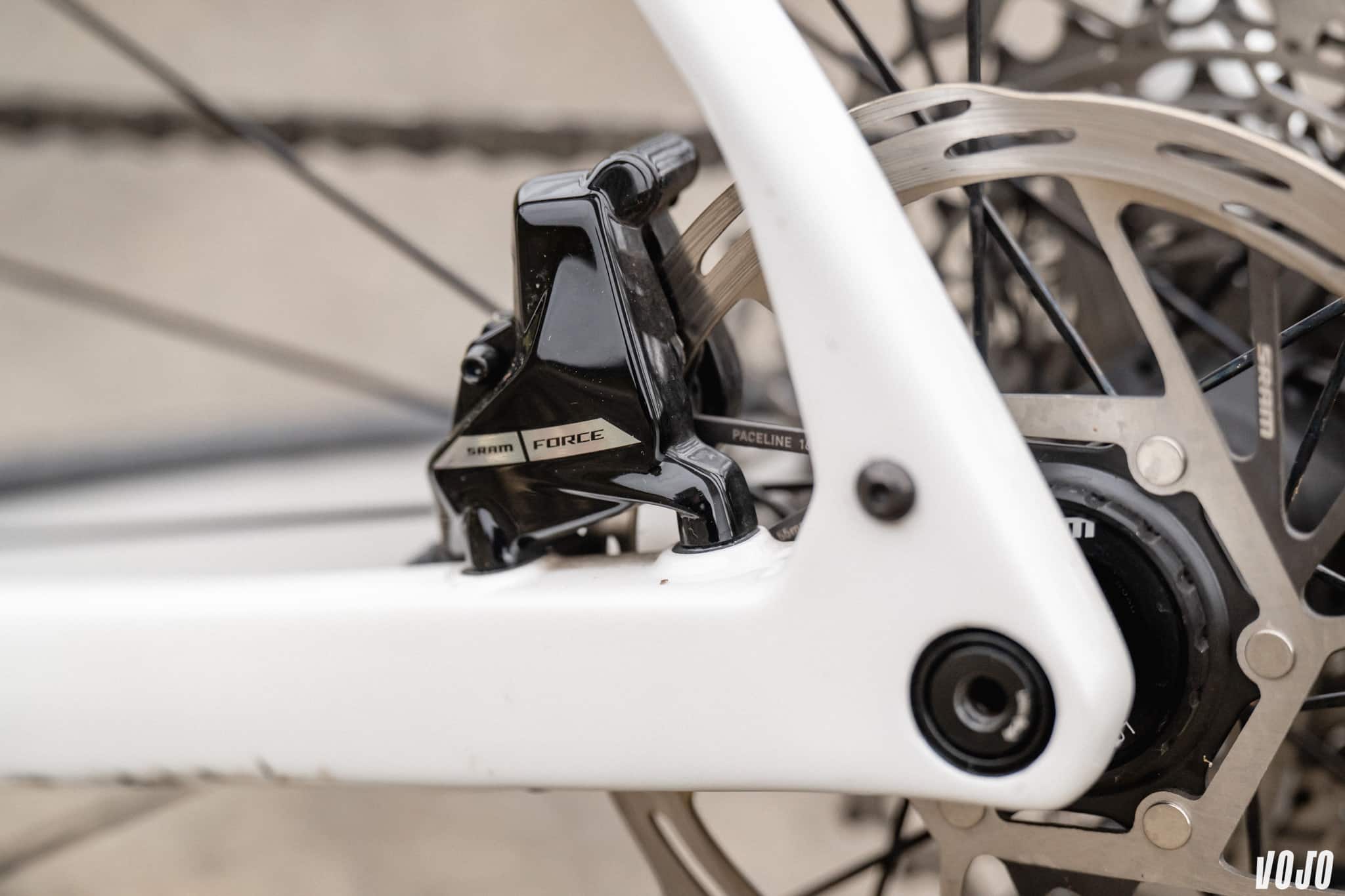 Côté freins et transmissions, c’est un groupe Force XPLR eTap AXS de Sram, avec pédalier de 40 dents, cassette 10-44 et disques de 160 mm.