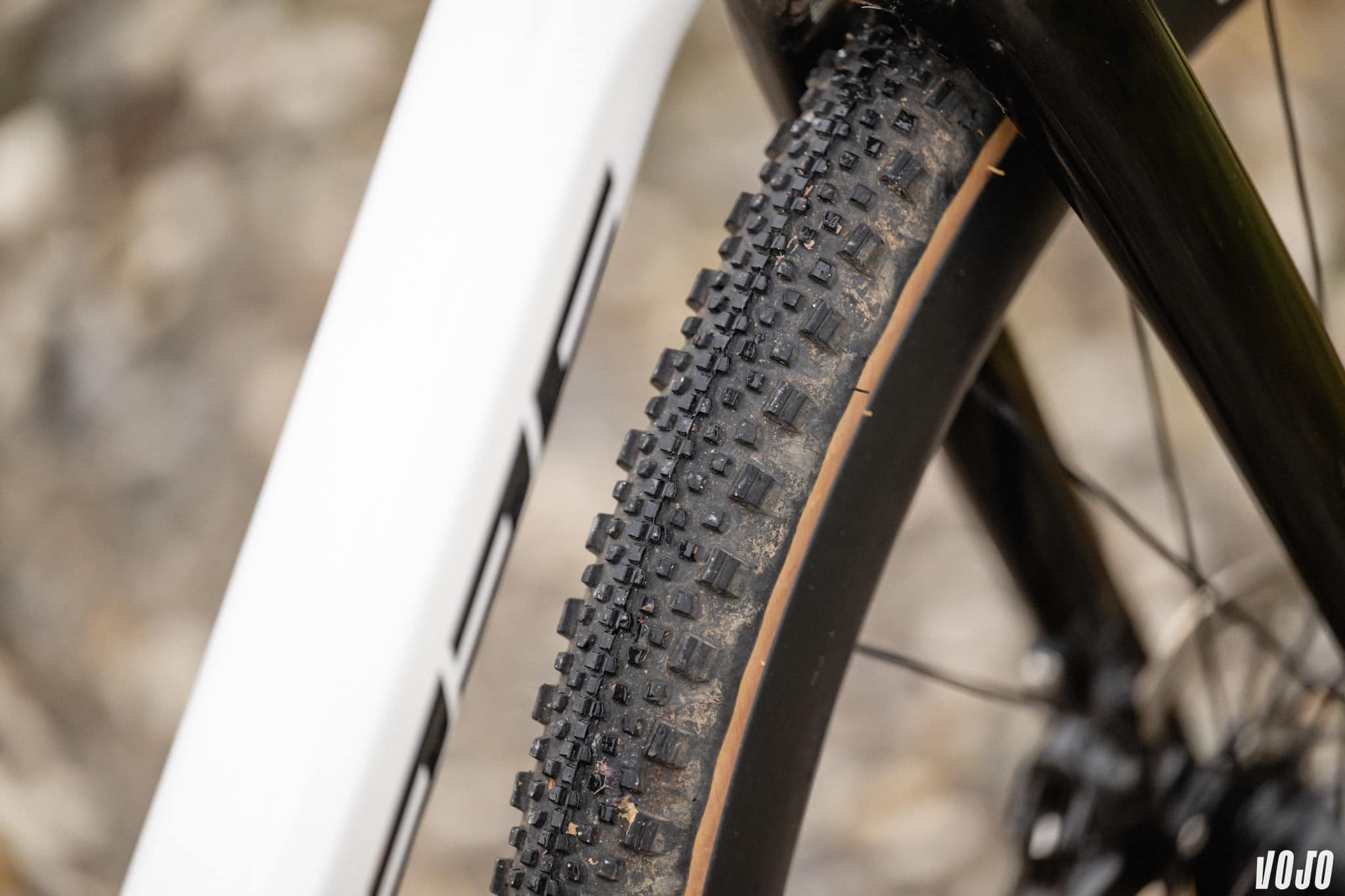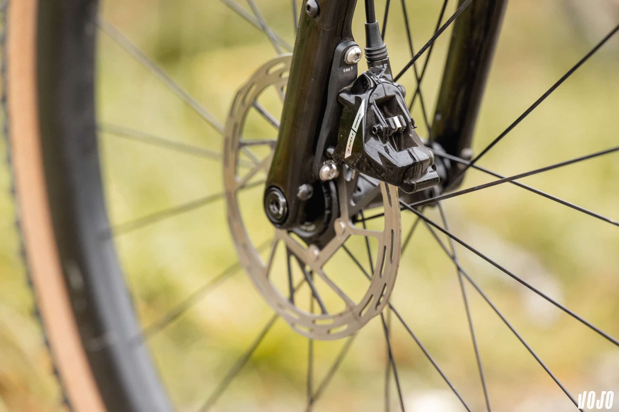 Le train roulant est composé de roues DT Swiss GRC 1600 (un modèle réservé à la première monte avec les jantes des anciennes GRC 1400 en 42 mm de haut sur des moyeux 350 plutôt que 240) chaussées des très bons pneus WTB Raddler TCS Light en 700 x 44 (mesurés à 43 mm par nos soins). Roulants et discrets sur les sols durs, rassurants au freinage et en virage, polyvalents dans les différentes conditions, solides, ces pneus font une excellente monte d’origine en gravel. On trouvera certainement plus performant dans chaque domaine mais pour viser large, c’est une référence.