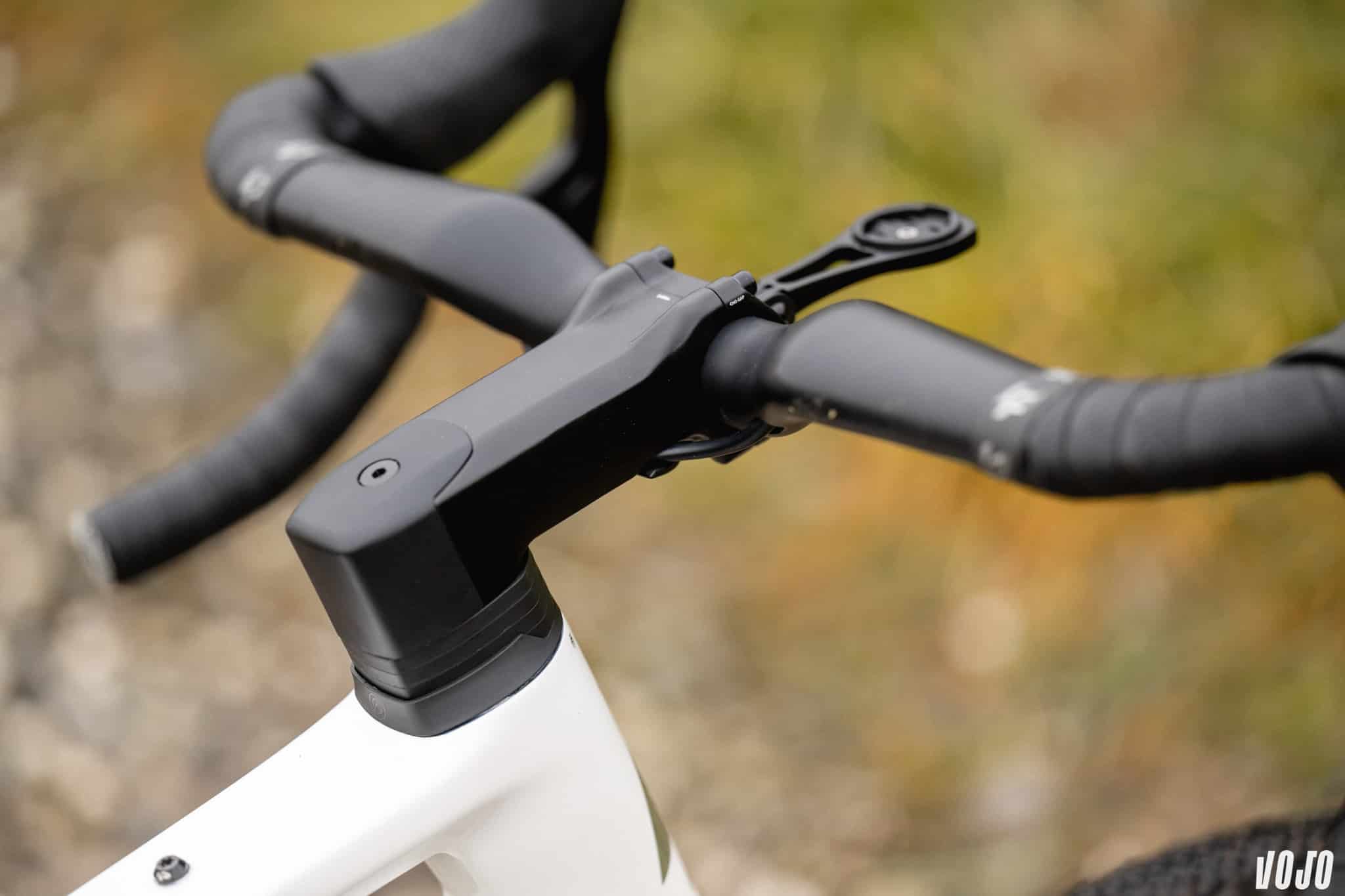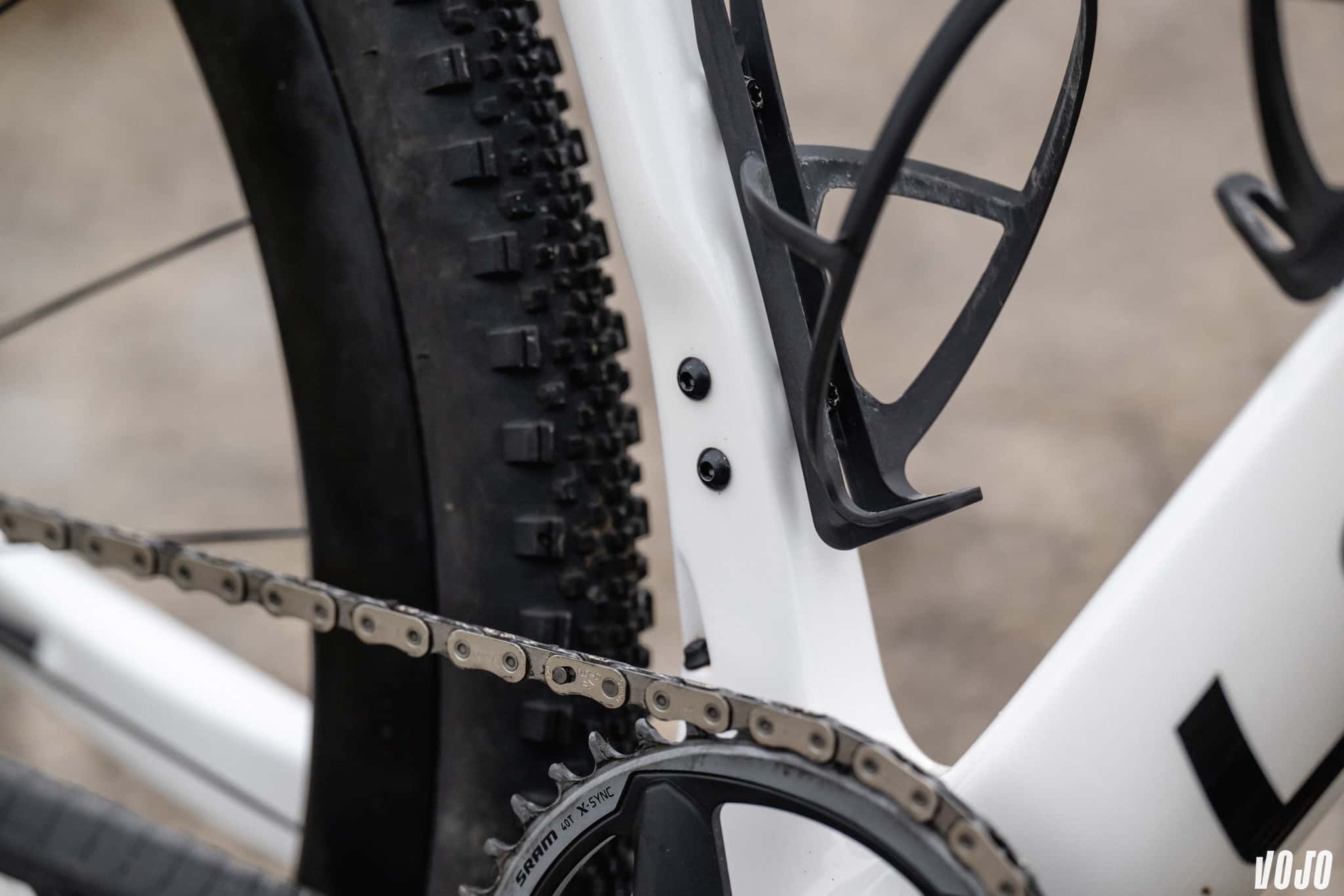 A l’inverse, le tube diagonal adopte une forme en triangle plus agressive qui rappelle les cadres aérodynamiques de route, une impression renforcée par le nom de la marque apposé de façon imposante sur la moitié inférieure de ce tube. On a quelques doutes sur l’intérêt aérodynamique d’une telle forme en gravel, surtout caché derrière un pneu de 44 mm de section, mais cela a néanmoins l’avantage de ramasser moins de boue lorsqu’on roule par temps humide.