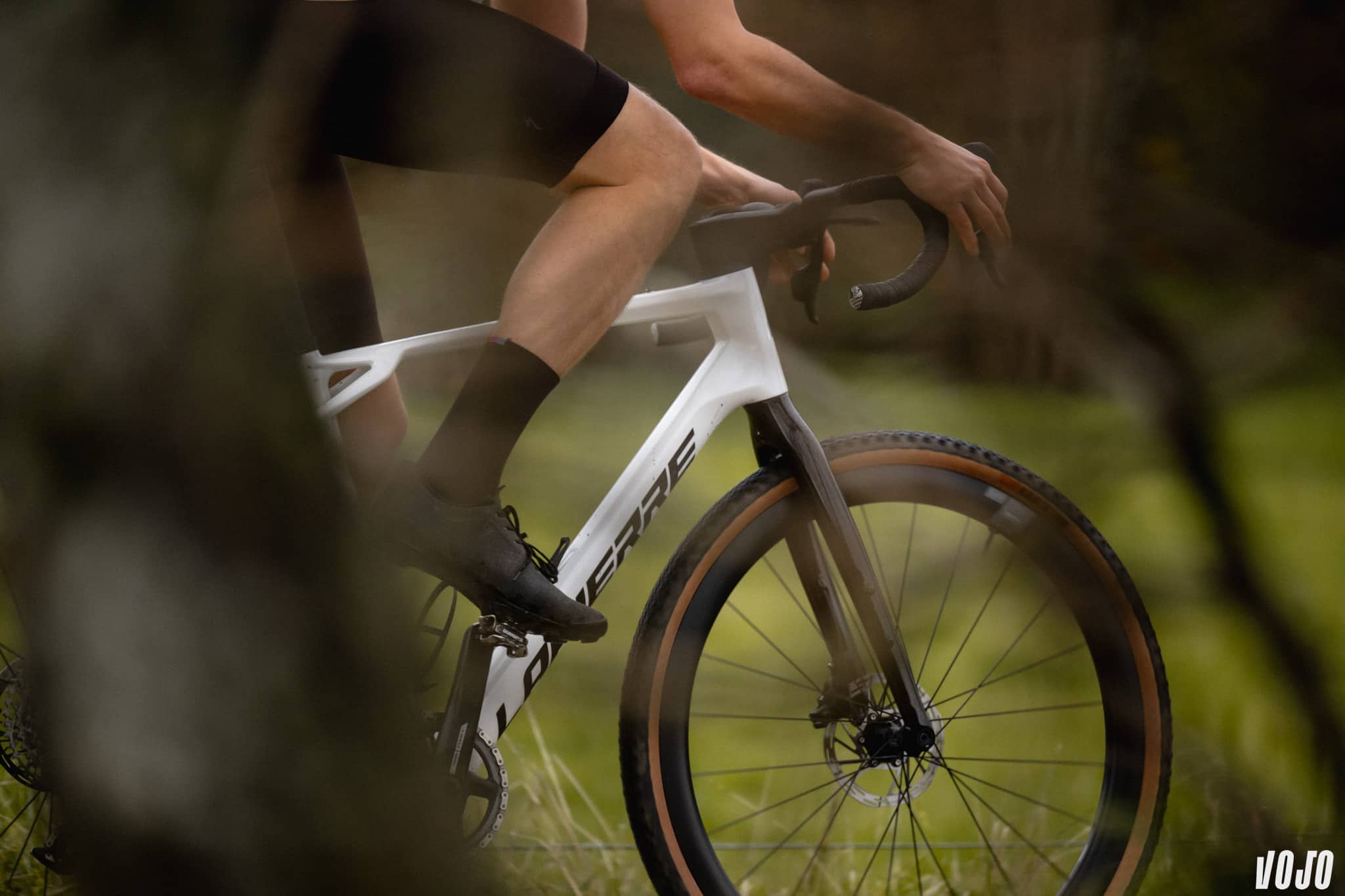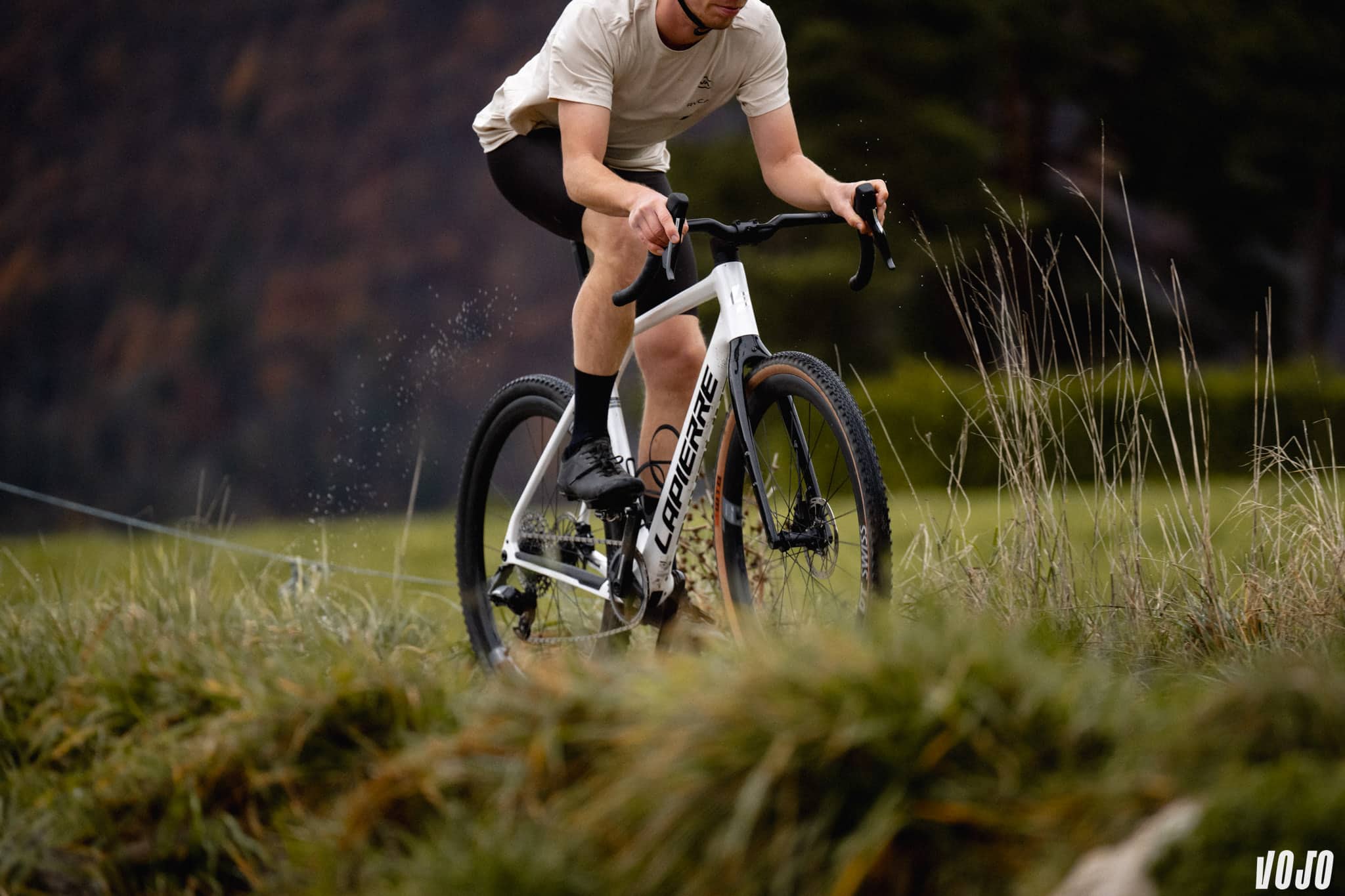 La deuxième chose qu’on remarque, c’est le confort. Lapierre n’a pas menti, il se passe réellement quelque chose et mieux encore, il n’y a pas besoin d’être à 40 km/h pour le sentir ! Même à une allure deux fois plus lente, ce qui reste tout à fait respectable pour du gravel, le Crosshill CF fait preuve de vraies capacités de filtration et c’est aussi valable à l’avant. Au-delà du confort en lui-même, qui est plus facile à juger en comparaison directe avec d’autres vélos, on note qu’on reste plus frais plus longtemps.