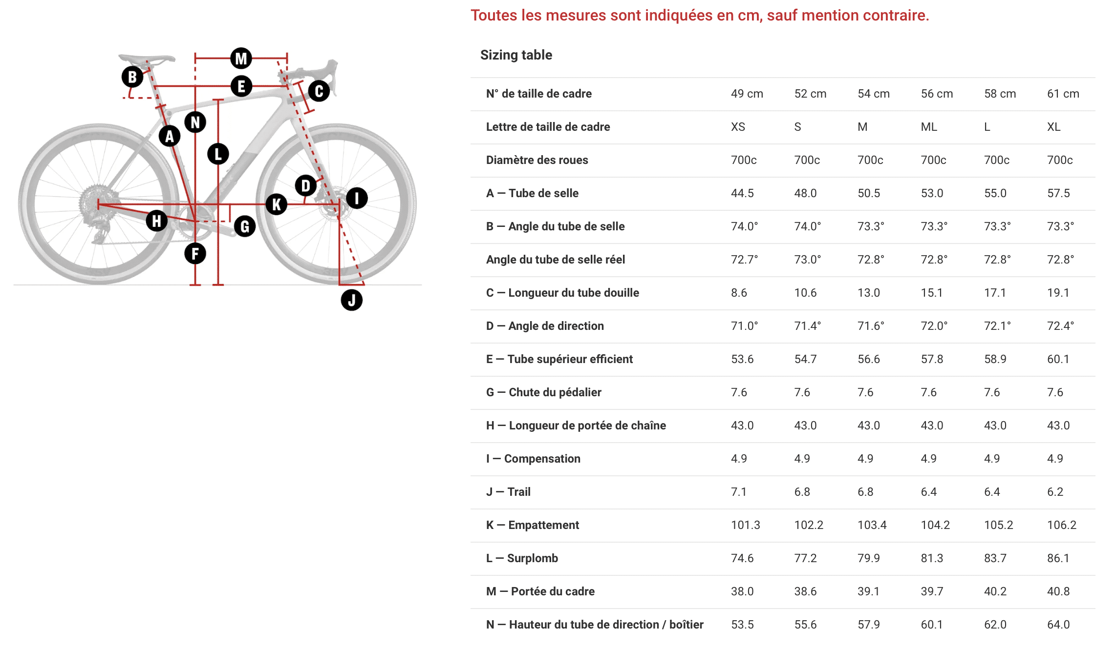 Les bases se raccourcissent ainsi de 5 mm (430 mm), le stack augmente d’environ 1 cm par taille (579 mm en taille M/54) tandis que le reach perd la même chose (391 mm en taille M/54) et au total, l’empattement perd un peu moins d’un centimètre également sur chaque taille. Les angles évoluent peu mais Trek ne communiquait pas l’angle de tube de selle effectif (ou réel) sur la précédente génération donc la comparaison est difficile. Retenez simplement que sur ce nouveau Checkpoint SL, ils sont dans la moyenne des gravel polyvalents avec une légère tendance « routière », orientant un peu plus le vélo vers les terrains roulants que d’autres modèles.