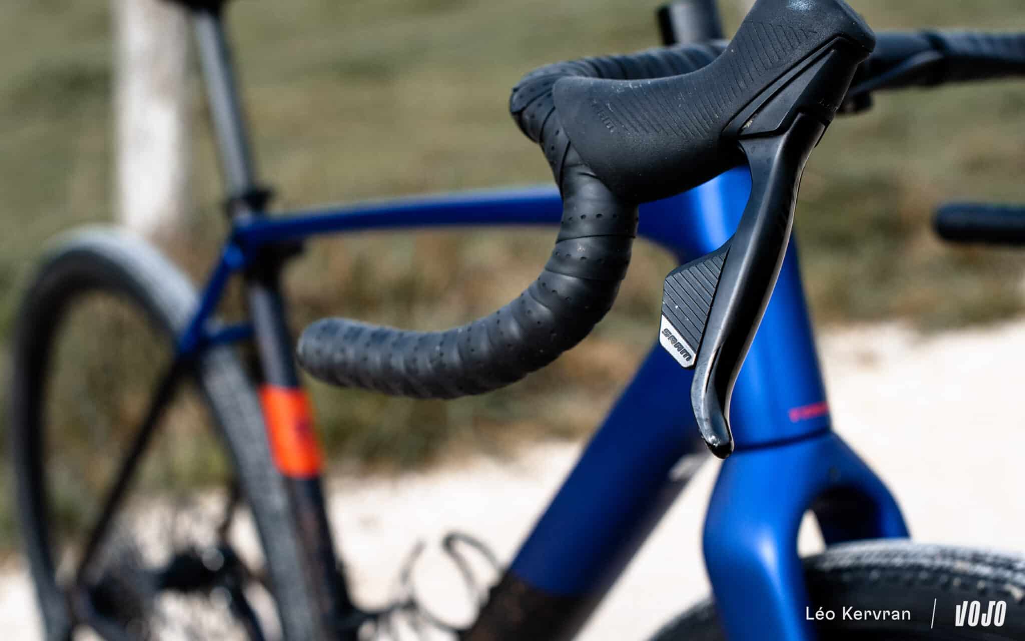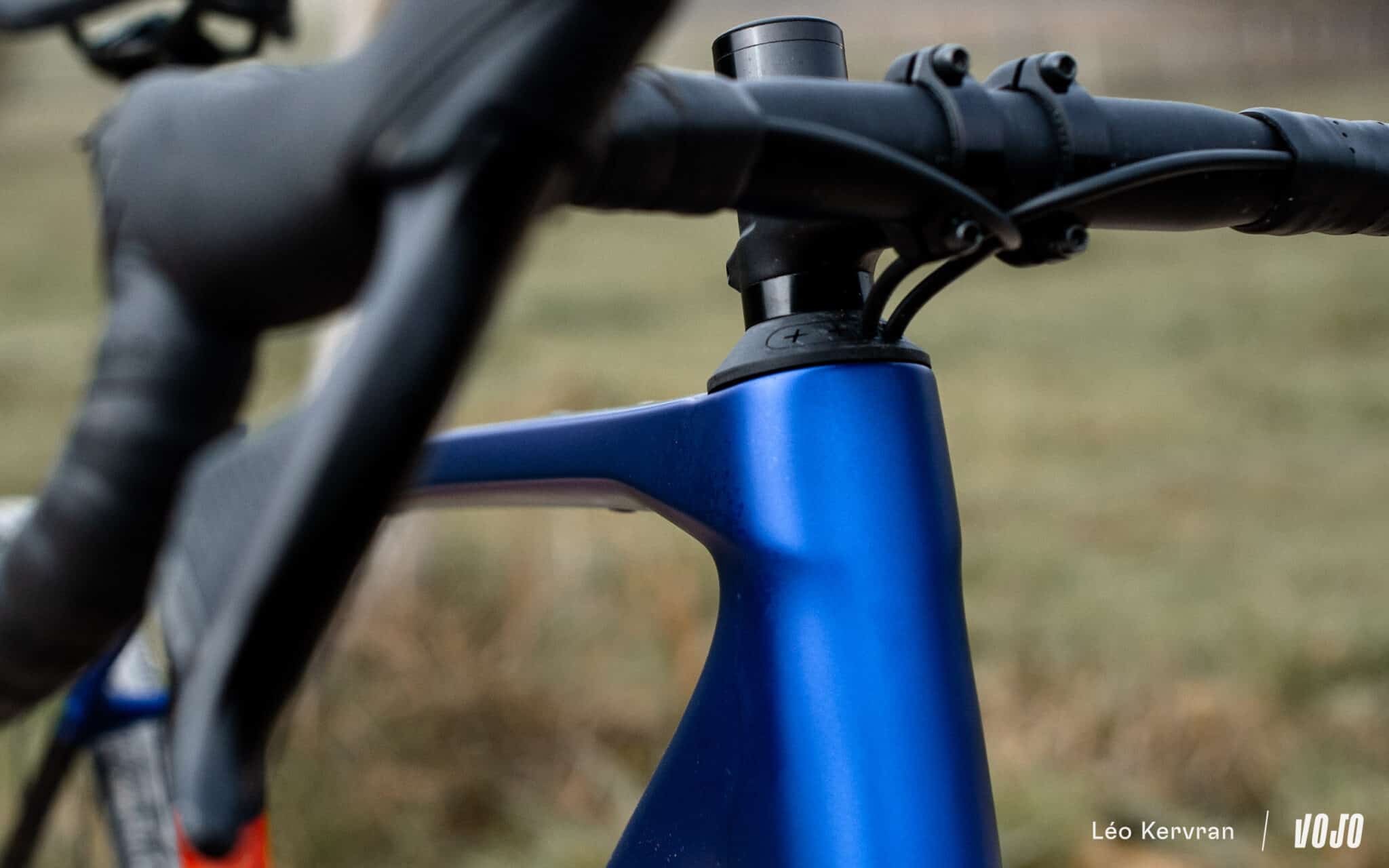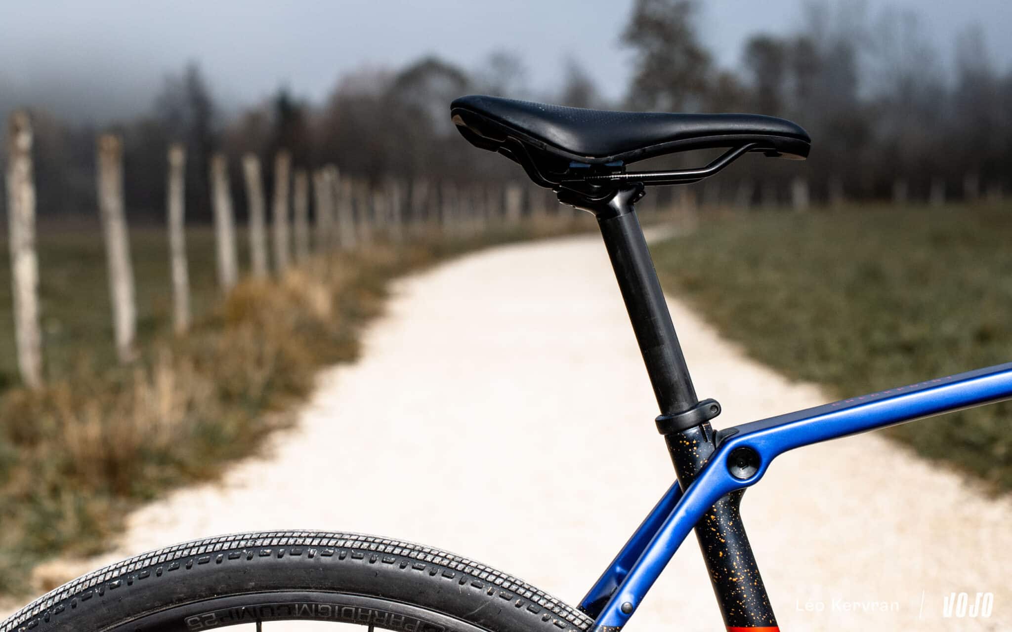 Potence (de 60 à 100 mm selon la taille) et cintre (de 40 à 46 cm, 15° de flare) sont tout ce qu’il y a de plus classique. La guidoline est moyenne en revanche, sans être la pire qu’il nous ait été donné d’essayer on a déjà vu plus flatteur. La tige de selle (27,2 mm, déport de 8 mm) est en carbone et la selle Verse Short Comp est disponible en deux largeurs, 145 et 155 mm.