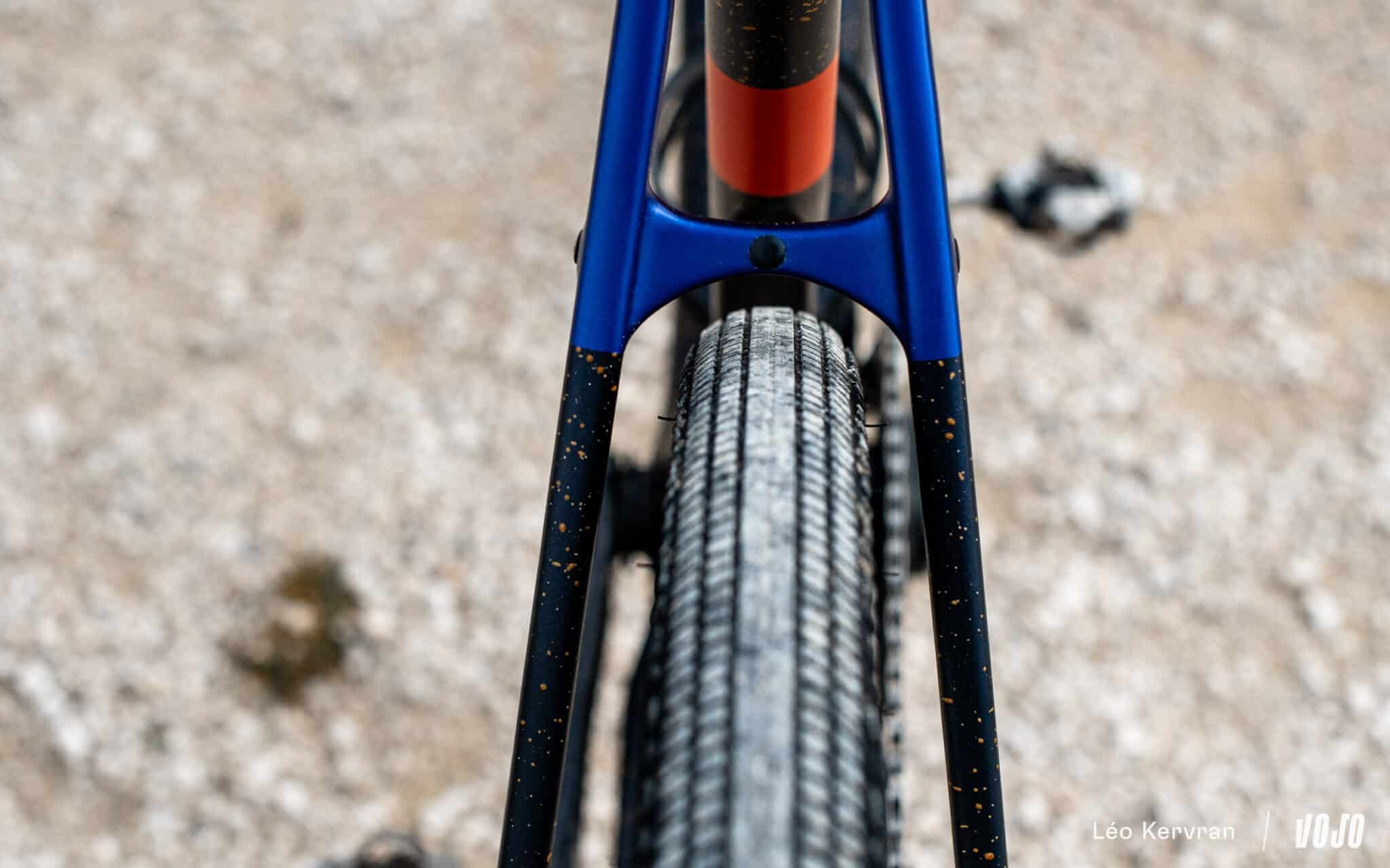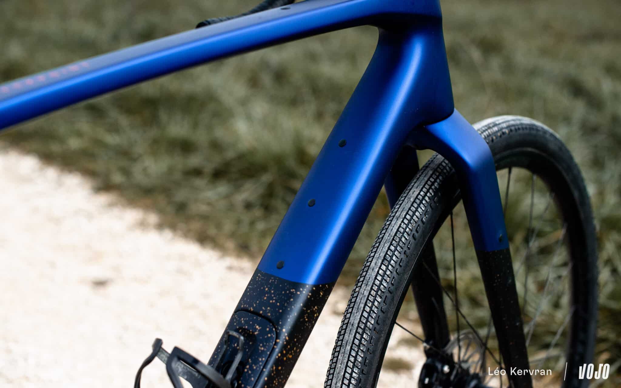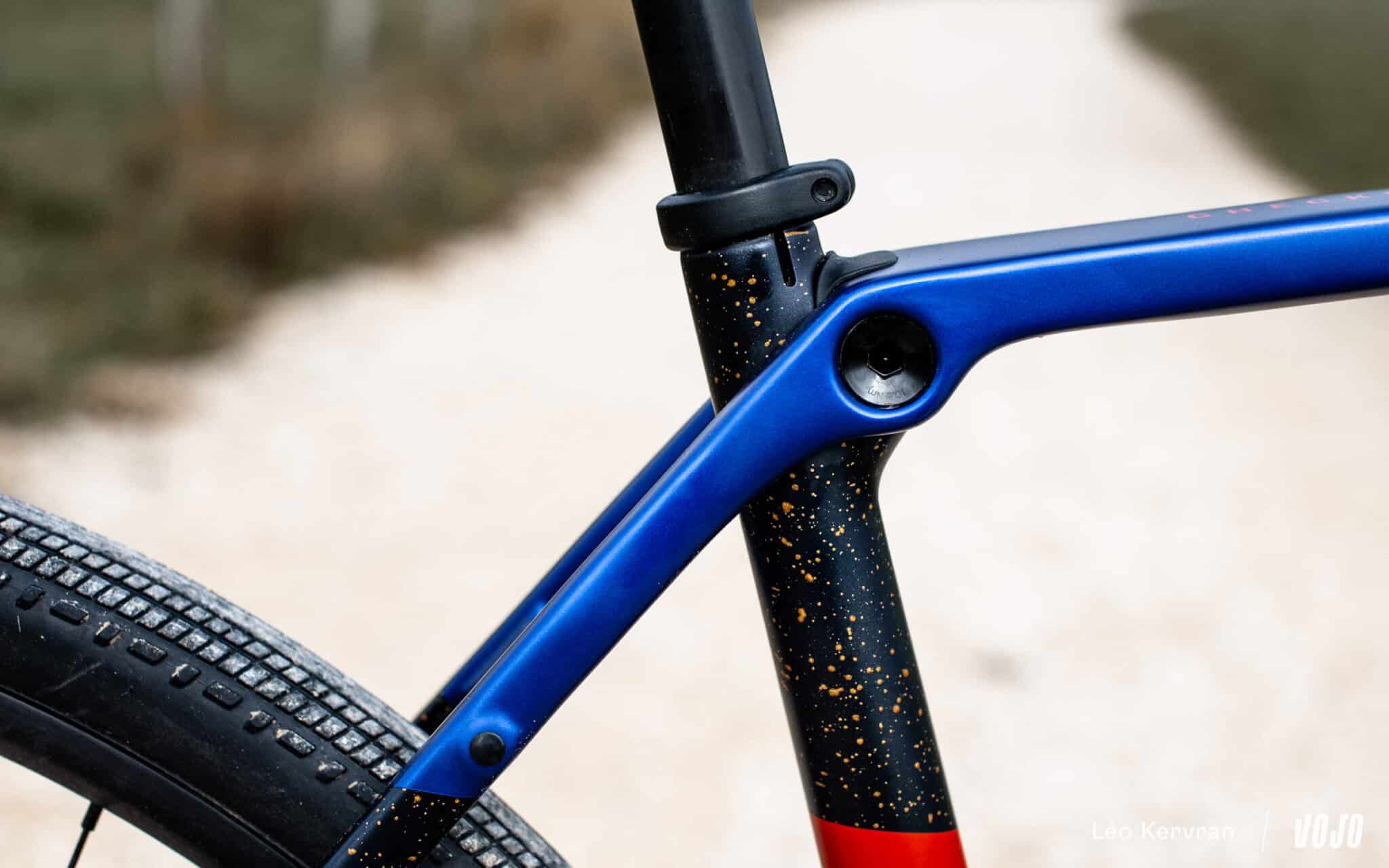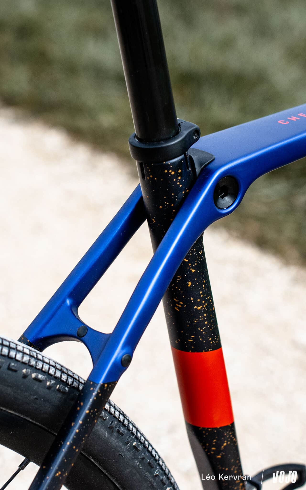 Côté standards, on a des gaines qui passent en interne via le jeu de direction et ne sont pas guidées dans le tube diagonal, des freins en Flatmount 160, un dégagement suffisant pour des pneus en 50 mm (réduit à 42 mm avec le montage de garde-boue), une patte de dérailleur UDH et un boîtier de pédalier T47. On notera aussi que même si le Checkpoint SL n’est vendu qu’en monoplateau, le tube de selle accueille un support pour un guide-chaîne… ou un dérailleur avant (pédalier 46-30 maximum).