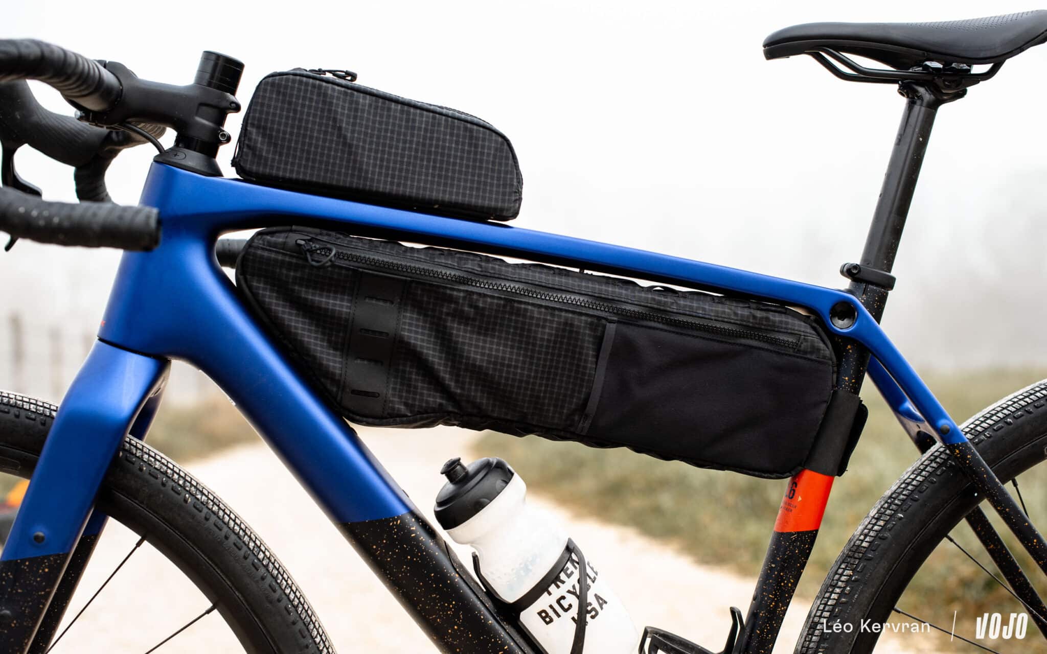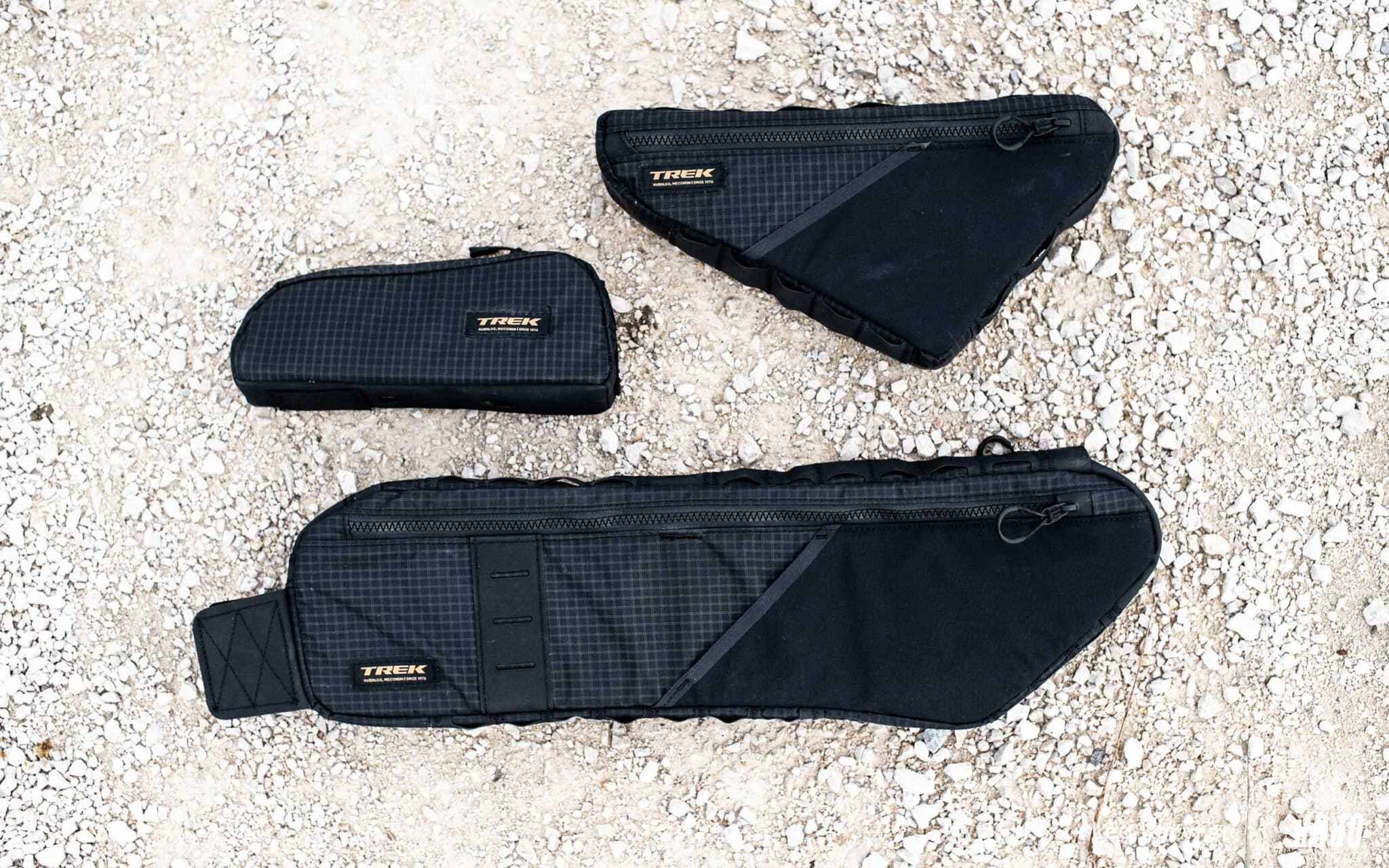 Notez enfin que Trek compte dans son catalogue une gamme de sacoches parfaitement adaptées au vélo : la famille Aventure. Compatibles avec un montage par vis ou par scratchs, elles sont d’excellente facture avec des matériaux et finitions de qualité ainsi qu’une organisation intéressante. Trois produits sont proposés, une sacoche de tube supérieur (42,99 €), une sacoche de triangle avant de taille moyenne (74,99 €) et une grande sacoche de triangle avant (119,99 €), qui laisse tout de même la place pour deux bidons.