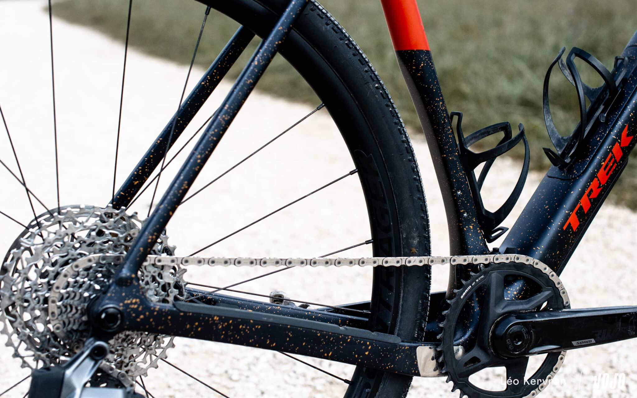En termes de dynamique, on sent clairement le mauvais rendement des pneus freiner le potentiel du vélo. Les roues Bontrager Paradigm Comp 25 ne permettent pas des accélérations foudroyantes mais sur la précédente génération, elles tenaient bien un rythme élevé une fois lancées. Désormais, il faut se battre en permanence si on souhaite aller vite et dans cette configuration, le vélo nous invite de façon insistante à rouler en mode « balade ». Dommage, car à côté de ça la rigidité latérale est flatteuse et on peut monter en danseuse ou mettre de la force sans problème.