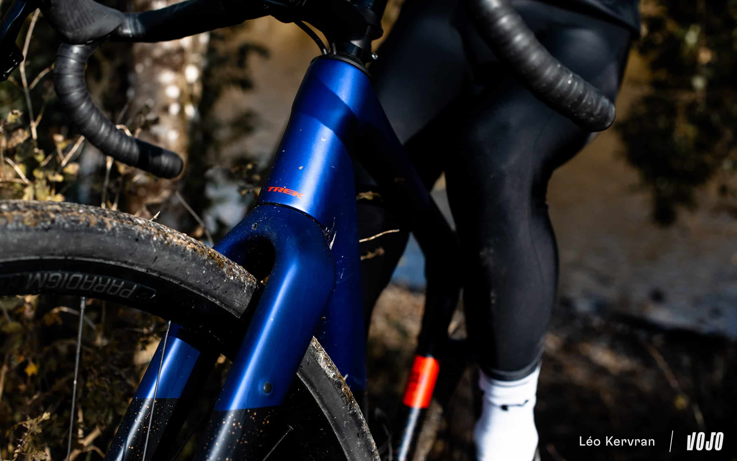 L’un des principaux reproches qu’on faisait au modèle précédent concernait la rigidité. Si vous n’êtes pas familier ou familière de Trek, sachez que ce n’est pas une surprise : en VTT la marque est connue pour faire des vélos très rigide, parfois trop pour nos terrains européens et c’était un peu le cas du précédent Checkpoint SL. Si l’Isospeed offrait un confort intéressant à l’arrière tant qu’on restait assis sur la selle, il en était tout autrement lorsqu’on se mettait debout sur les pédales et à l’avant du vélo, au point que les pistes ou sentiers pas parfaitement lisses pouvaient vite se transformer en calvaire.