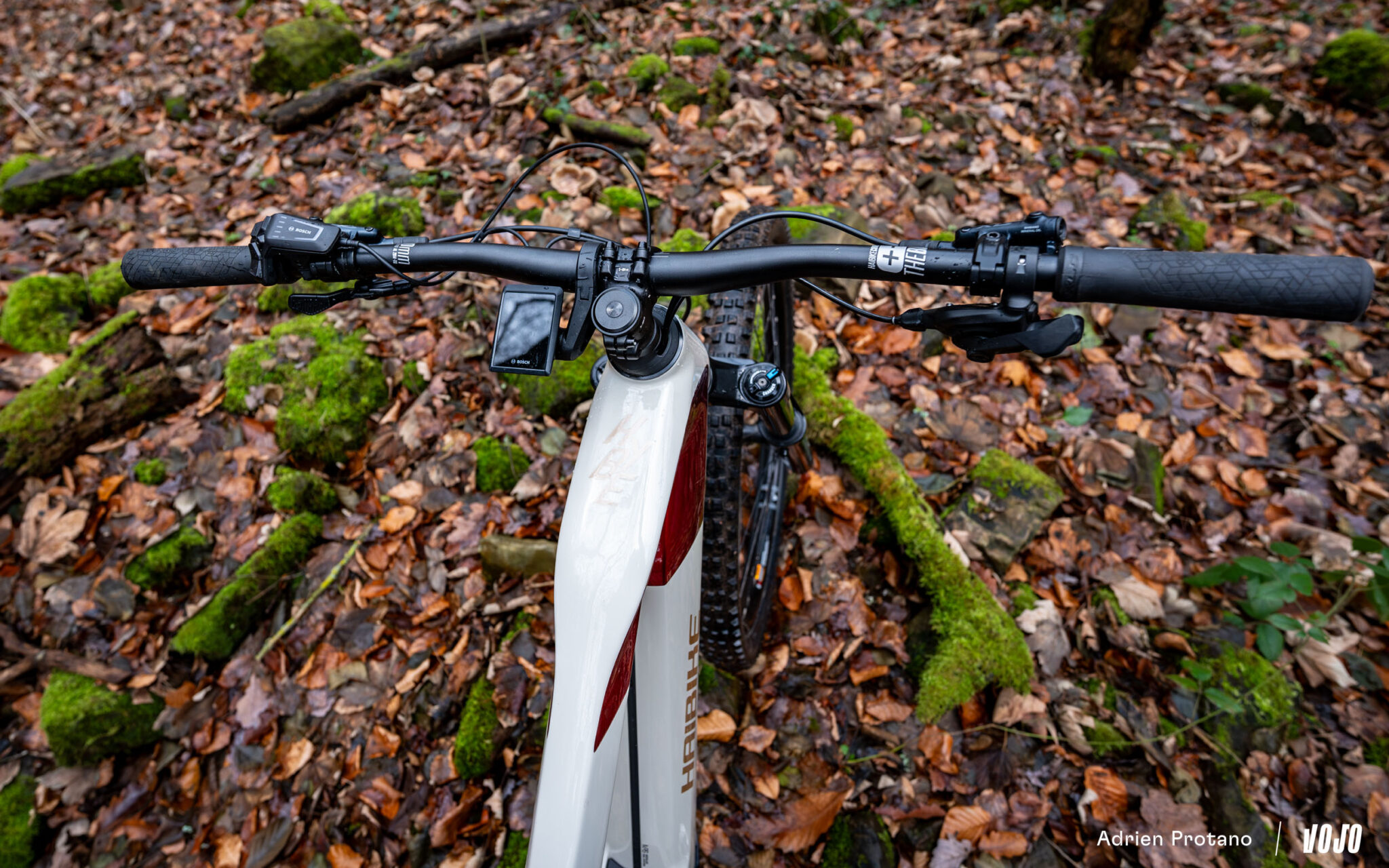 Le contrôle de ce moteur se fait au moyen de la commande LED de chez Bosch, associée à l’élégant écran Kiox 300. Une fois de plus, ce n’est pas l’intégration ou le minimalisme qui a commandé les choix d’Haibike… Même si nous préférons un poste de pilotage plus épuré et qu’une commande plus simple en complément de l’écran aurait fait l’affaire, on ne peut nier que cela apporte un certain confort sur le terrain : impossibilité de se méprendre sur le mode d’assistance utilisé, affichage continu du niveau de la batterie, ou encore lisibilité de l’ensemble des données choisies…