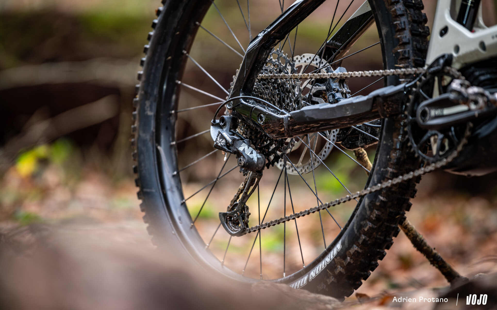 Sram est également aux commandes du côté de la transmission avec un groupe Sram SX/NX Eagle. Le pédalier en aluminium est quant à lui maison. Le freinage est assuré par une paire de Shimano SLX associés à des disques de 203 mm à l’avant comme à l’arrière. Rien de luxueux, mais cela fonctionne bien et, si nous pouvons trouver les suspensions un peu limitées en réglages pour un vélo qui se veut orienté « race », la transmission basique ne nous a pas dérangés et nous avons trouvé les freins SLX très efficaces.