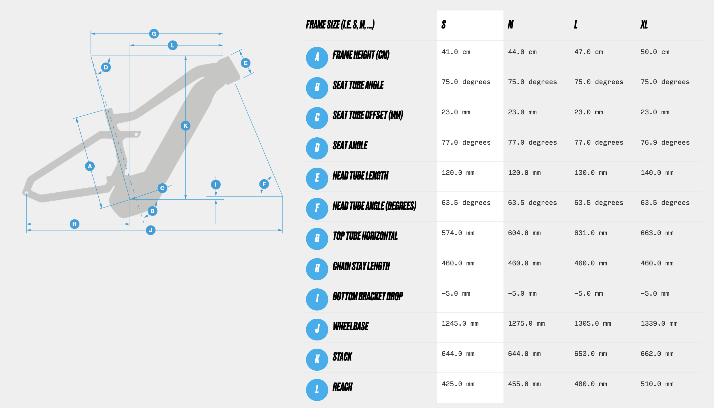 Généreux dans le débattement, le Haibike Nduro l’est aussi dans la géométrie comme en témoignent l’angle de direction de 63,5° et les longues bases (460 mm). Conséquence de cela, le vélo tout entier est particulièrement long et l’empattement dépasse les 1300 mm dès la taille L. C’est rare ! En dehors de ça, on a des cotes relativement classiques, modernes et passe-partout à l’image de l’angle de tube de selle de 77° ou du reach de 455 mm en taille M.