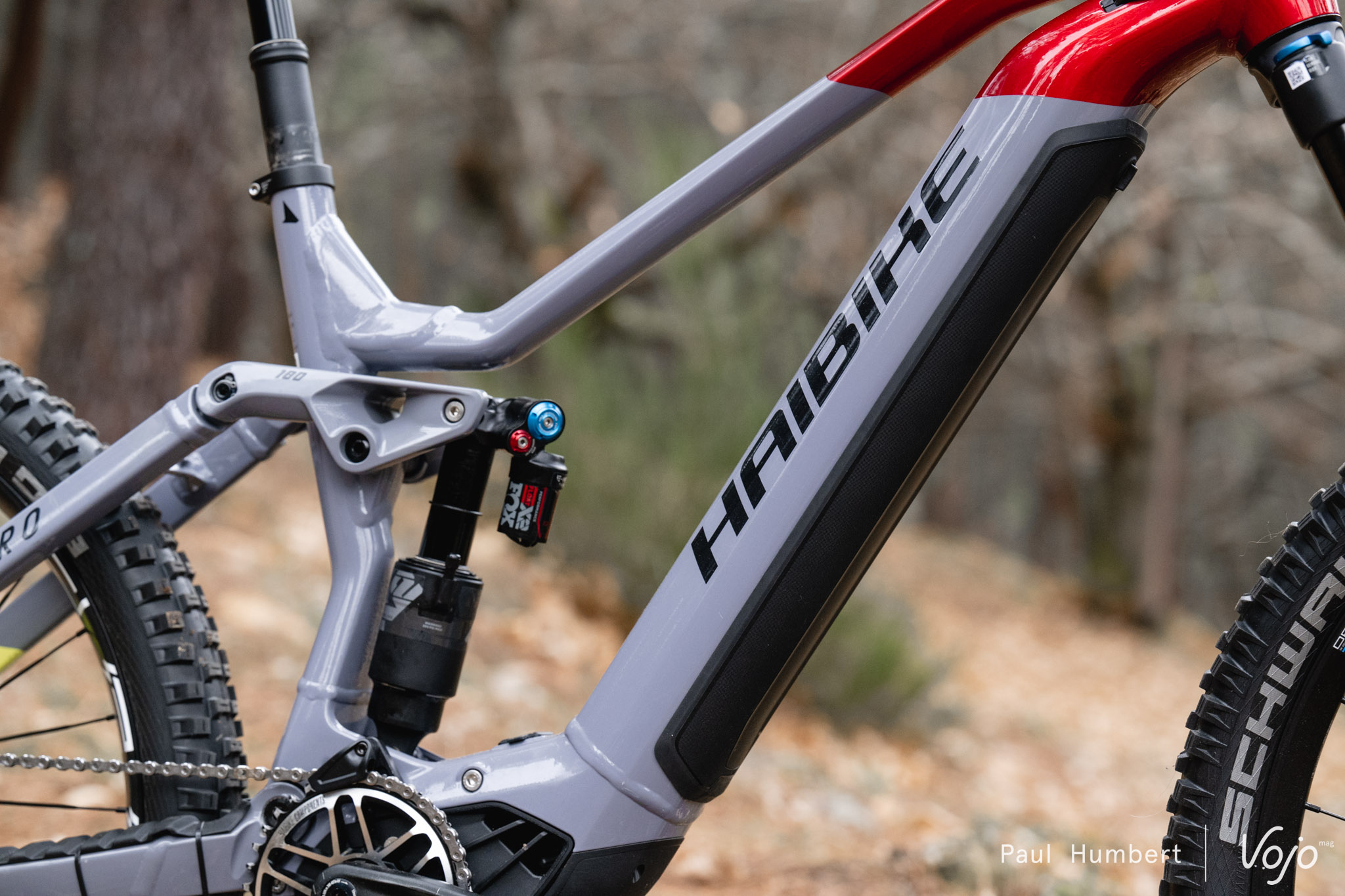 On l’évoquait en début d’article, le Nduro développe 180 mm de débattement à l’avant comme à l’arrière. Un débattement important mais obtenu par le biais de l’habituel 4 bar linkage de Haibike, reconnaissable à son point de pivot arrière placé bas et très loin de l’axe de roue.