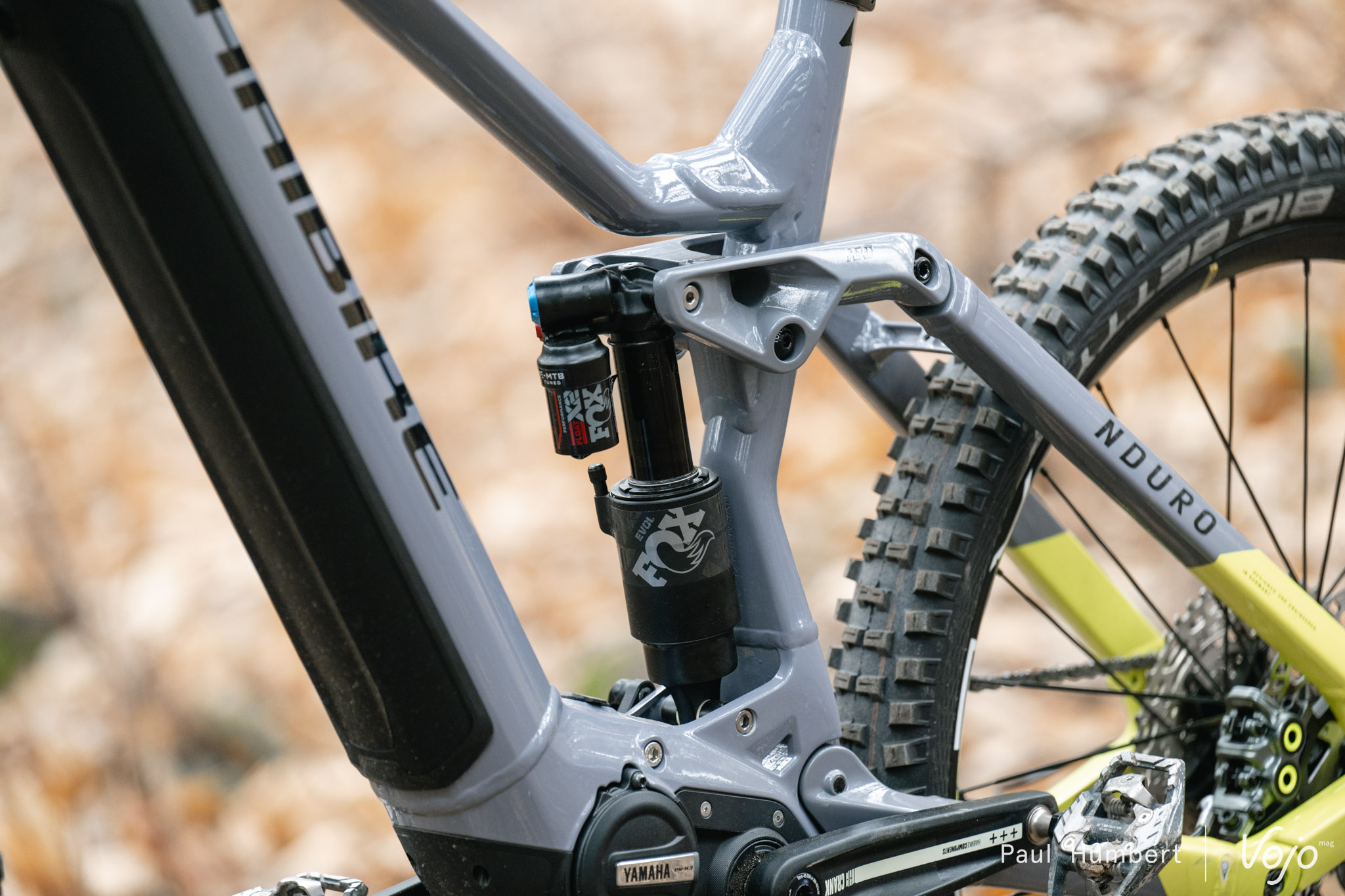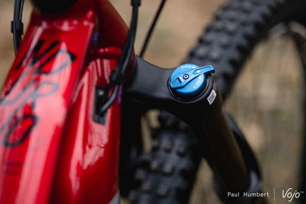 Sur notre Nduro 7, c’est Fox qui s’occupe de contrôler tout ça avec une 38 Performance à l’avant (cartouche Grip) et un Float X2 Performance à l’arrière. Leurs possibilités de réglages sont plus limitées que sur les gammes Performance Elite ou Factory ce qui peut être une bonne chose… ou rendre les choses délicates, si le vélo demande beaucoup de travail au niveau des réglages.
