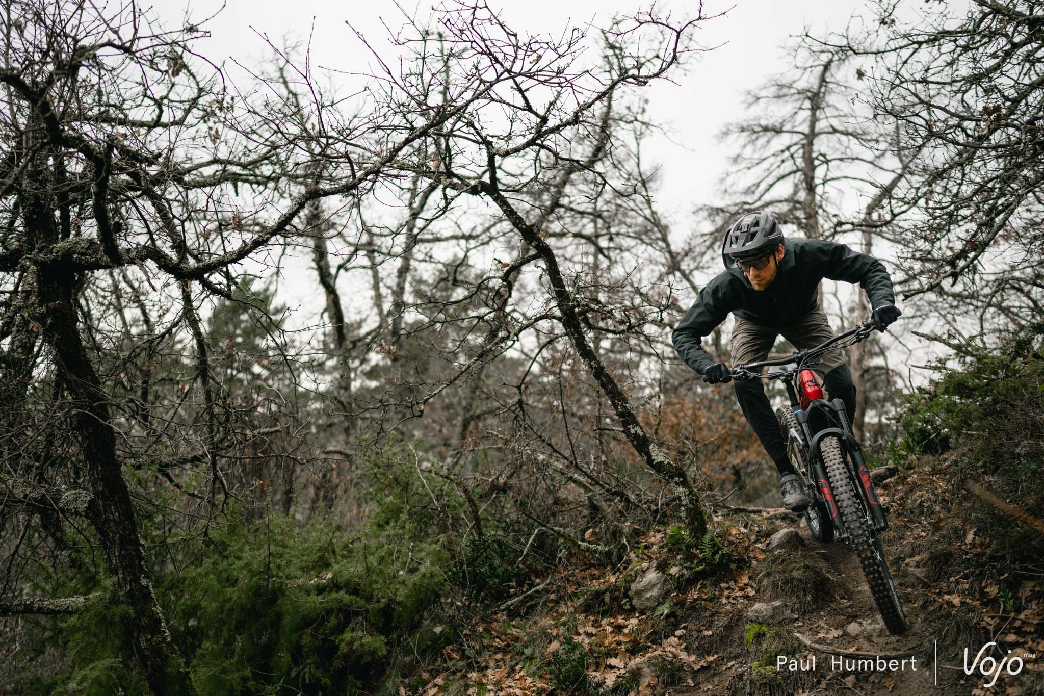 Bien sûr, la puissance est suffisante pour avaler les murs les plus raides mais on n’a pas cette accélération qu’on peut trouver sur des VTTAE plus légers. Qui plus est, l’autonomie fait grise mine à force de n’utiliser que les trois niveaux les plus élevés. Cinq modes d’assistance c’est beaucoup et ce n’est pas forcément adapté à une pratique VTT sportive. Trois niveaux bien répartis et tous utilisables offriraient probablement une meilleur autonomie que ces cinq modes, qui ne font que restreindre le champ d’action dans la réalité.