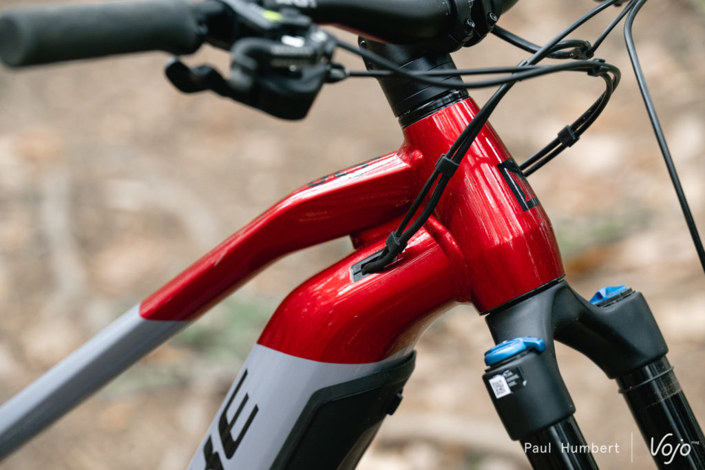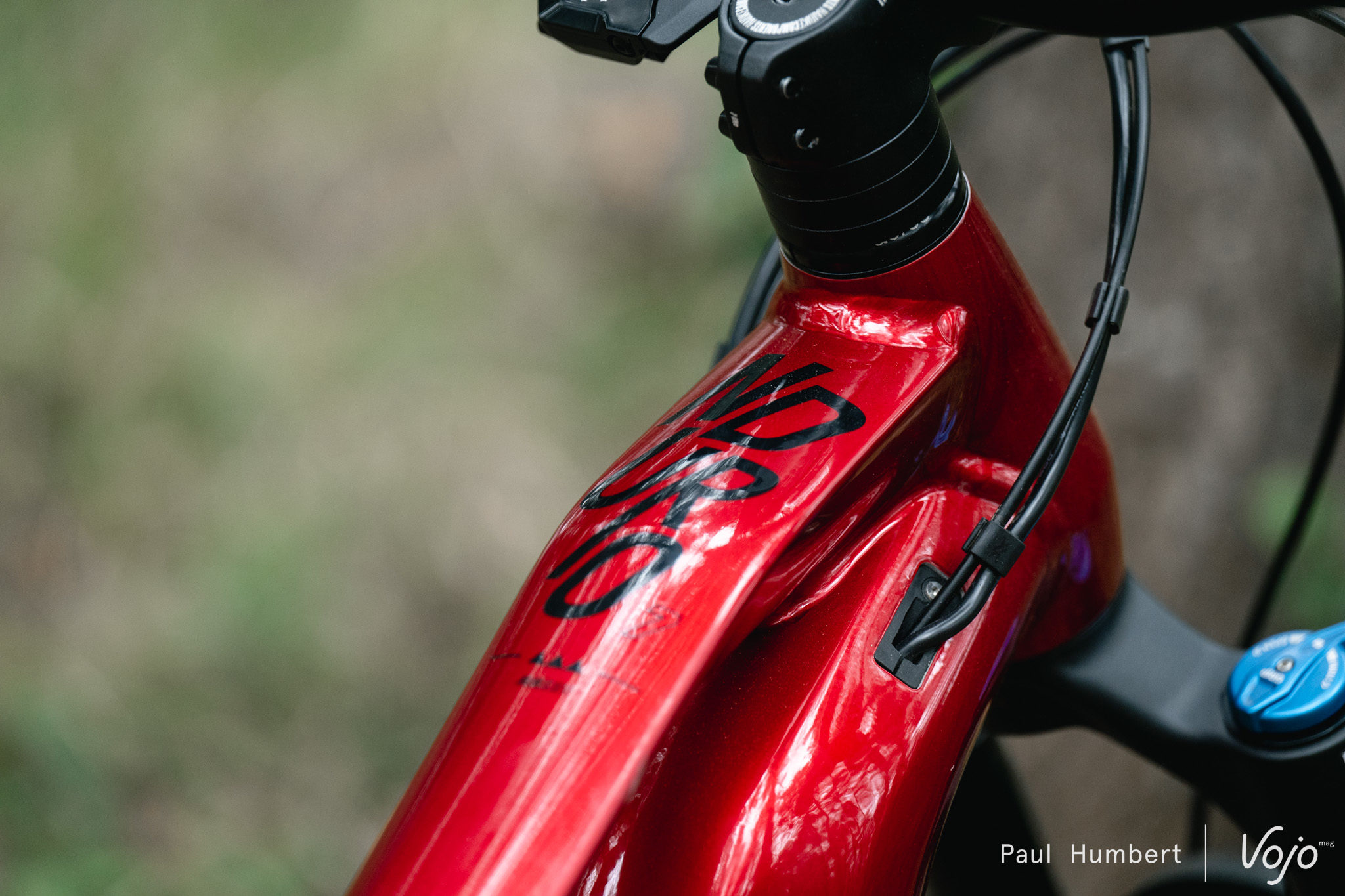 En dehors de ça, on a des passages de câbles classiques, en interne avec entrées sur les côtés de la douille de direction et des protections solides aux endroits les plus exposés, même si celle des bases mériterait d’être plus longue. On note également la présence, bien pensée, d’une petite lame de caoutchouc à la liaison des bases et du triangle arrière et qui permet d’éviter l’accumulation de terre ou de cailloux. Malheureusement, la colle utilisée pour la fixer n’a pas résisté à plus de deux lavages au jet.