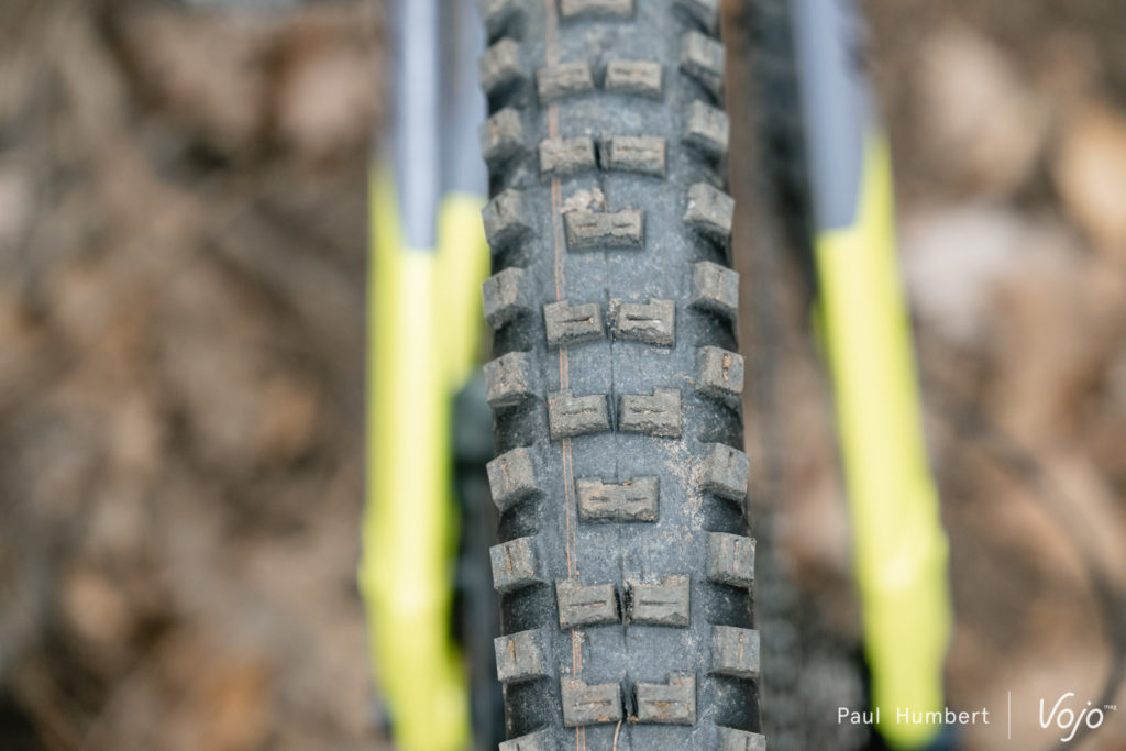 Pour compléter le tableau, le Schwalbe Big Betty en 27,5×2.6 monté à l’arrière s’est révélé décevant sur le gras. Ce n’est qu’une demi-surprise, on avait déjà eu de mauvaises expériences avec cette combinaison de roue-pneu et le constat est le même ici : les crampons ne sont pas assez agressif, le profil trop rond et on perd vite l’adhérence. Sur le sec c’est mieux.