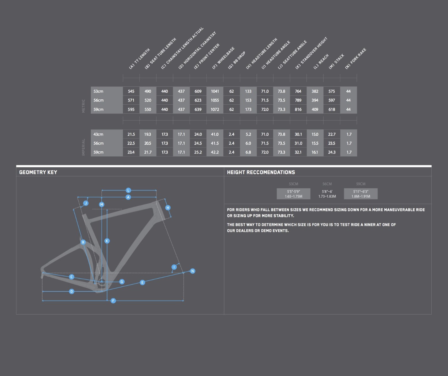 En regardant le tableau des géométries, on constate que le MCR 9 RDO est disponible en trois tailles (53-56-59 cm) et que les cotes telles que la longueur du tube supérieur, la longueur du tube de selle, le stack et le reach ne diffèrent pas beaucoup par rapport à la version rigide en carbone (à peine 10 mm). Seule la hauteur du pédalier est un peu plus basse sur le tout-suspendu, ce qui doit offrir un peu plus de stabilité.