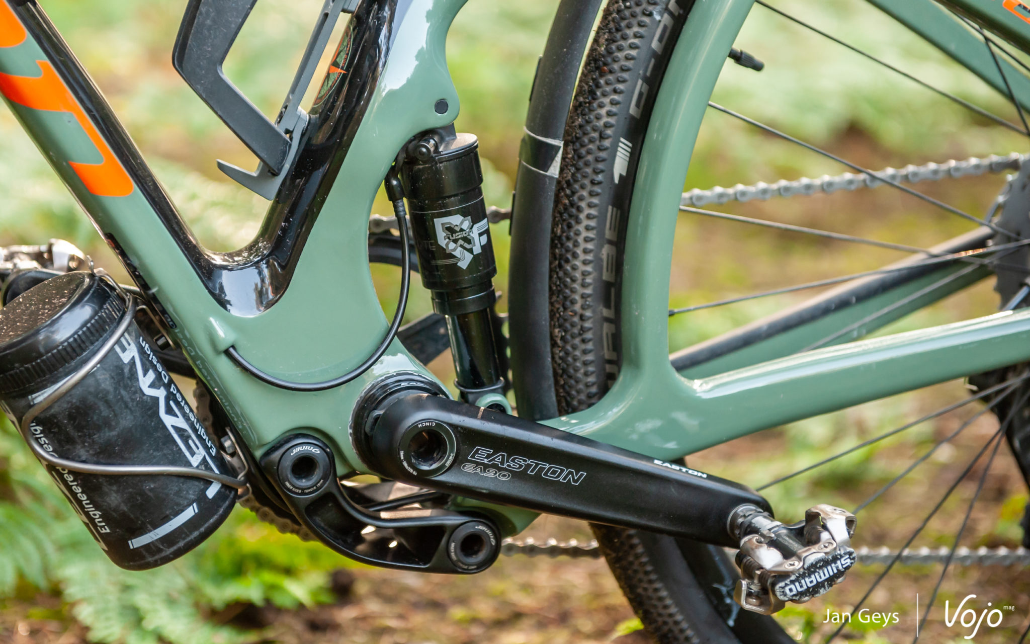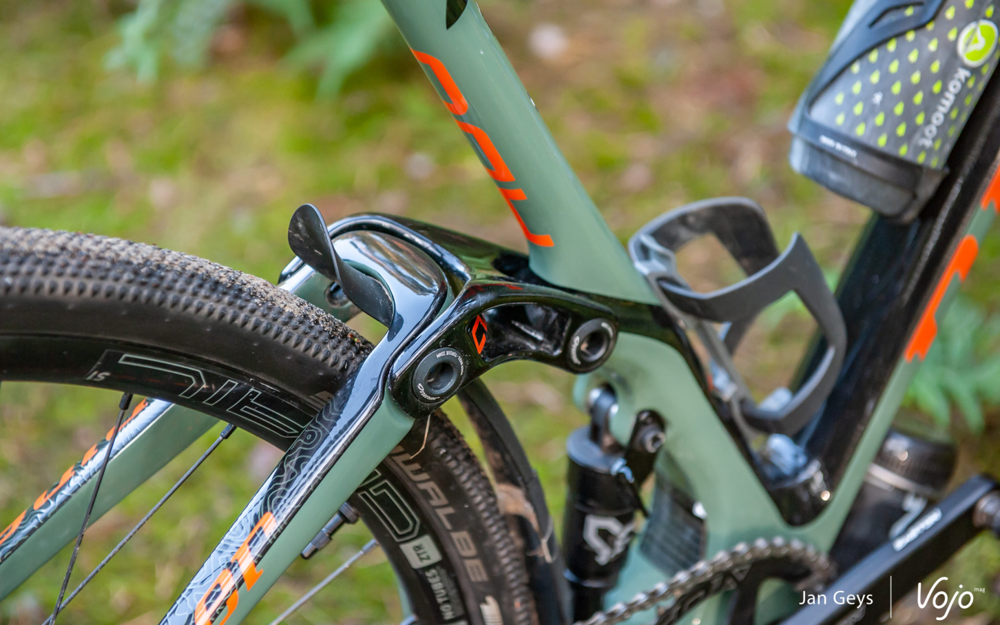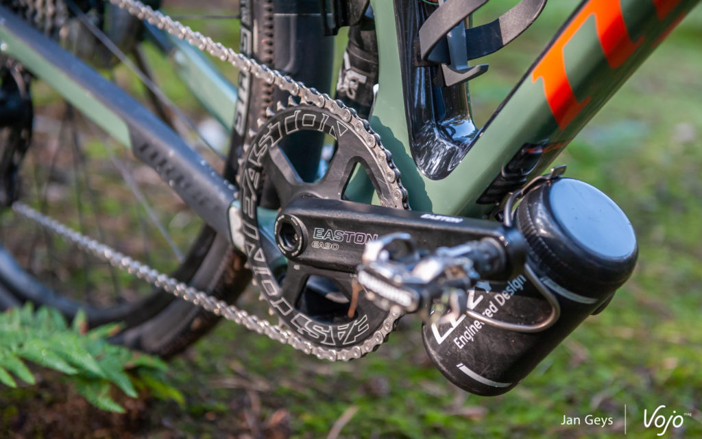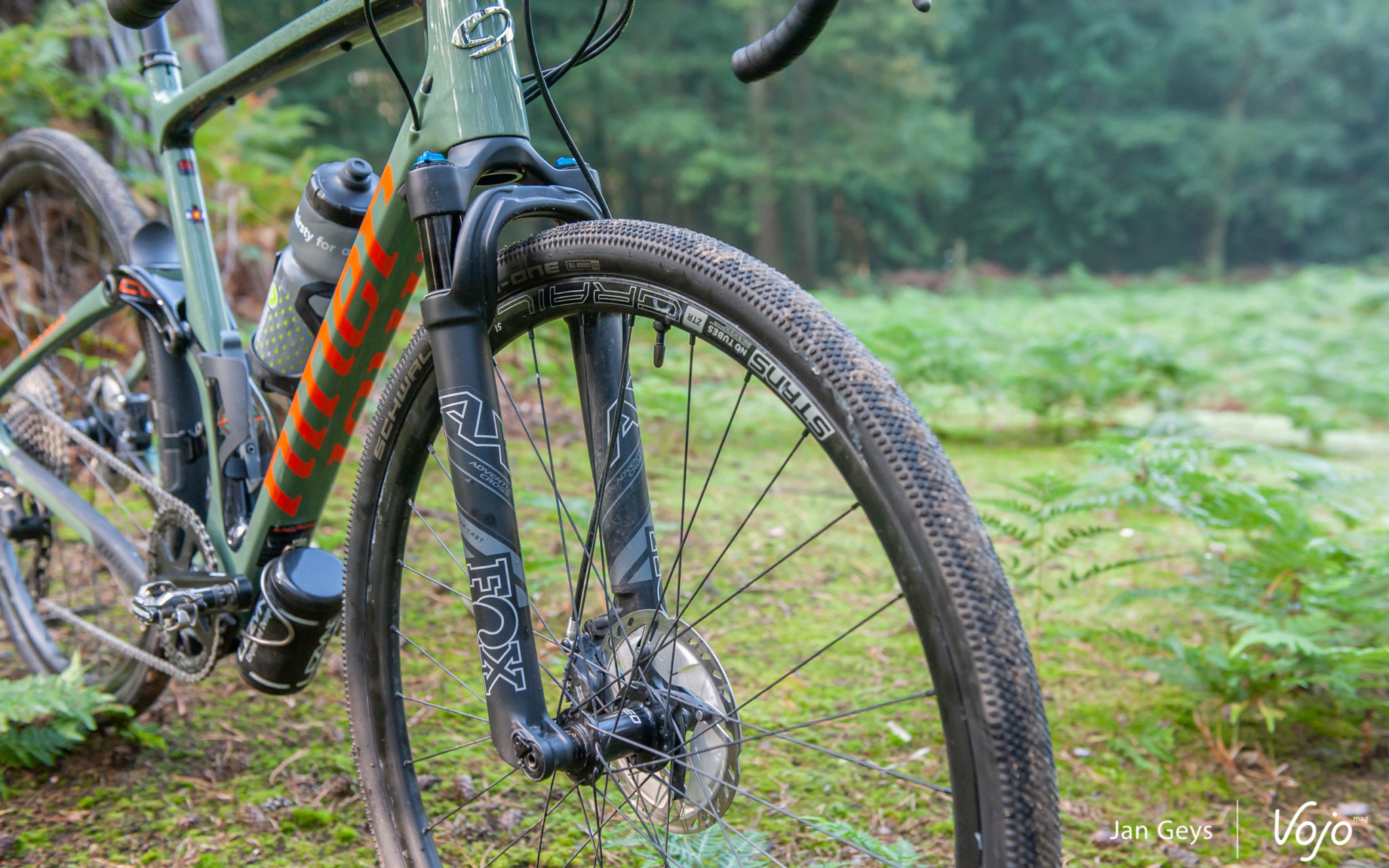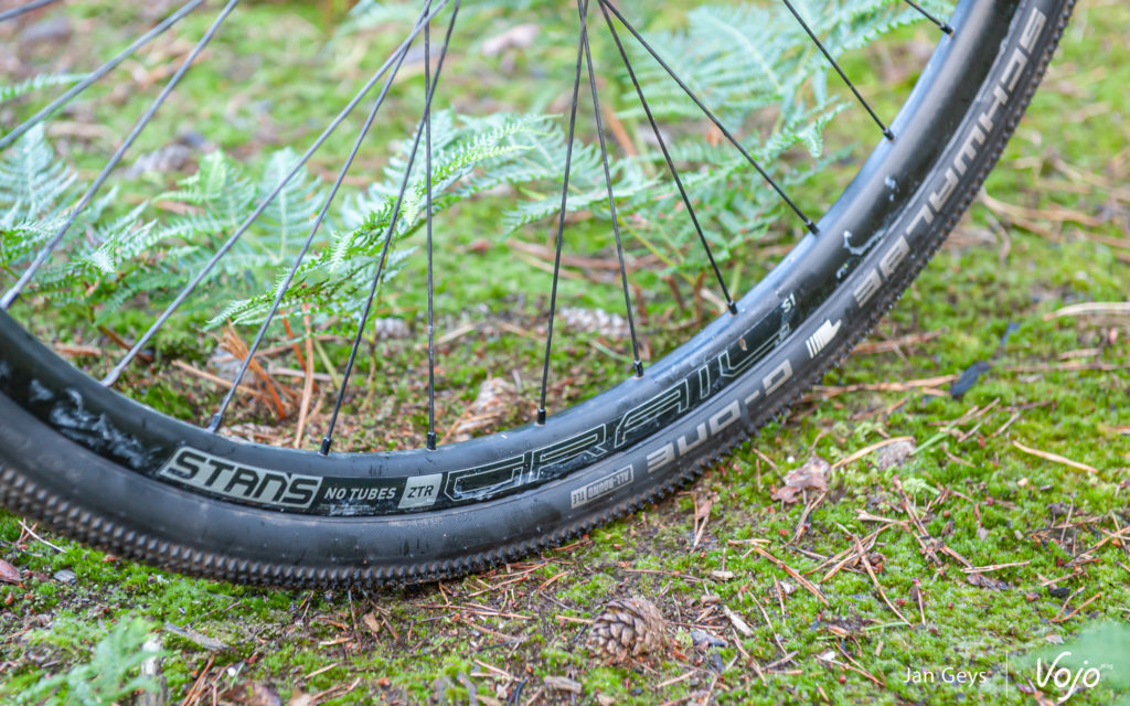 40 millimètres ? Seulement ? Face à une fourche en carbone avec 0 mm de débattement, elle vaut néanmoins la peine d’être considérée. Cela apporte beaucoup de confort, surtout lorsque les choses deviennent cahoteuses ou quand les vibrations sont telles qu’elles en arrivent à vous pourrir la sortie. Pensez à un enchaînement de racines, à des routes aux pavés disjoints et irréguliers, ou à de vieilles routes de campagne pleines de nids de poule et de bosses. La fourche Fox n’est pas l’élément le plus  » choquant  » de ce vélo, mais elle offre un énorme gain de confort et permet d’attaquer les sentiers plus techniques en toute confiance et de rouler plus longtemps avec plus de confort.