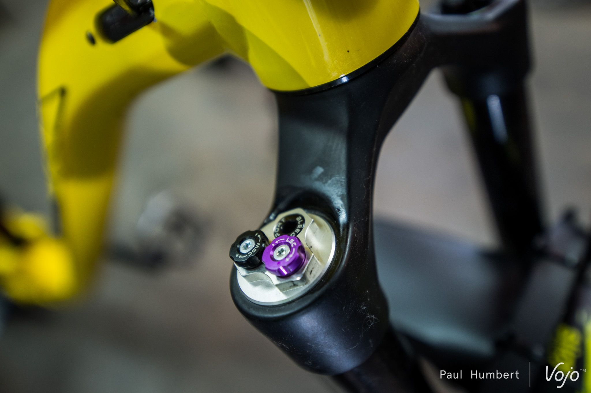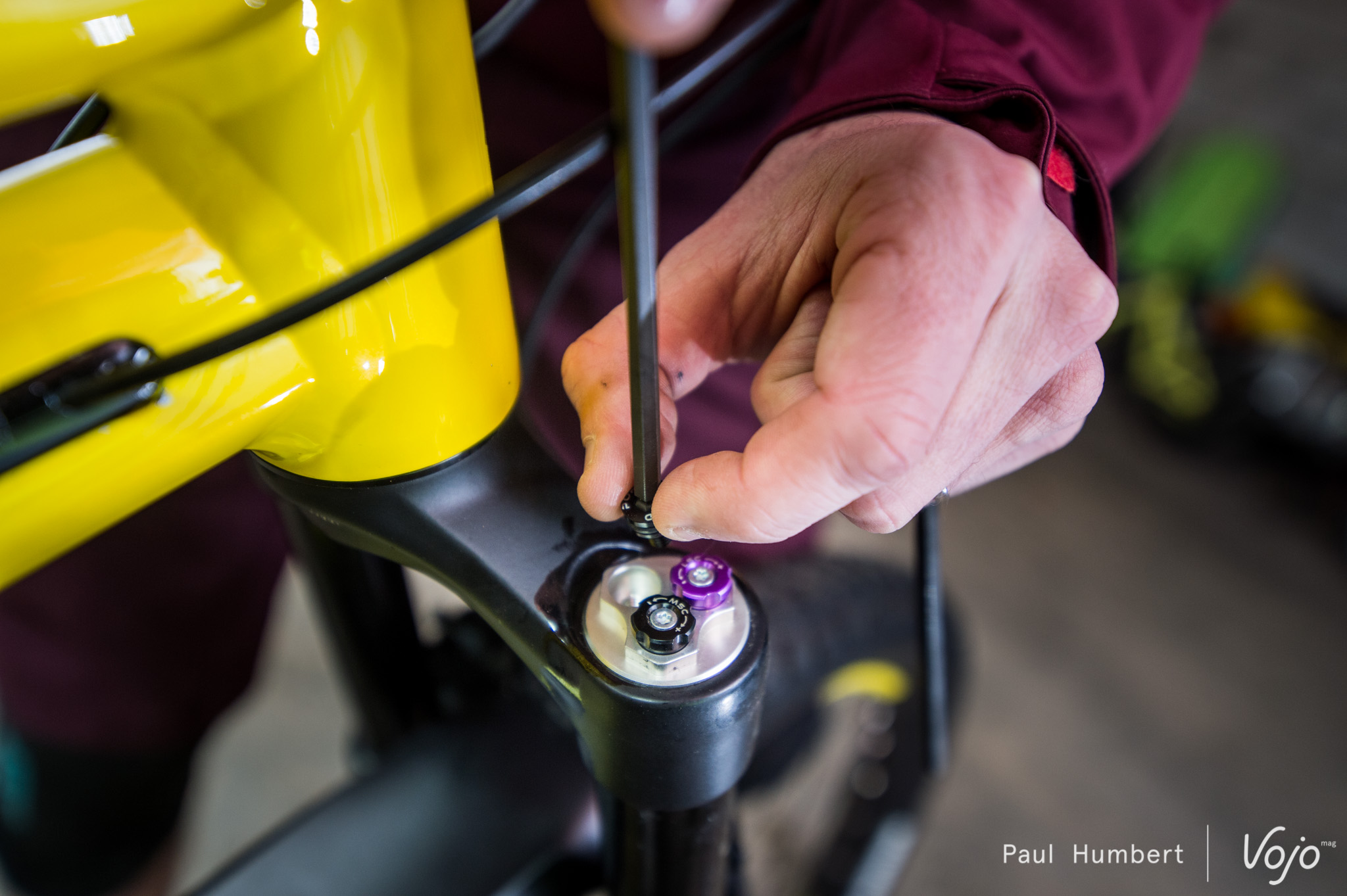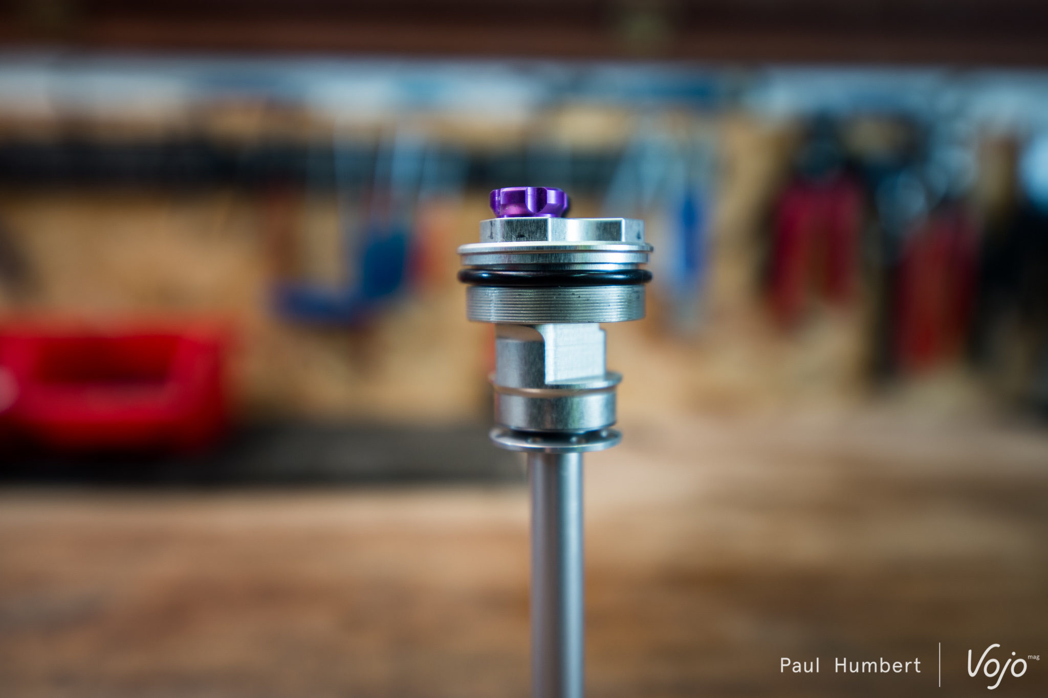 La vis de purge d’air est bien pratique. Elle permet de libérer la surpression d’air dans la fourche par le volume crée par la cartouche au montage. Elle aide également à chasser l’air créé par l’émulsion d’huile (cavitation) après roulage, le système étant de type semi ouvert non pressurisé.