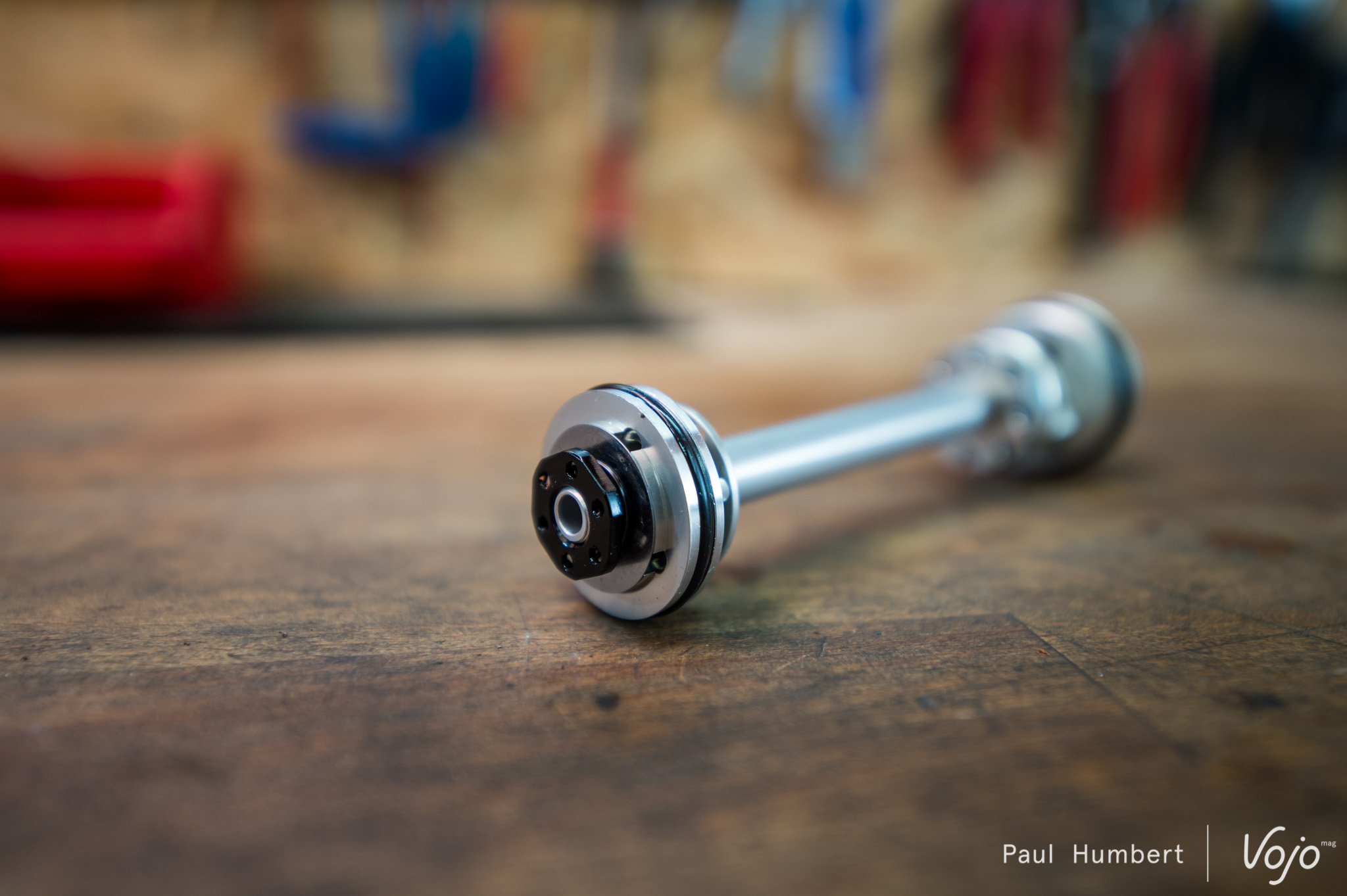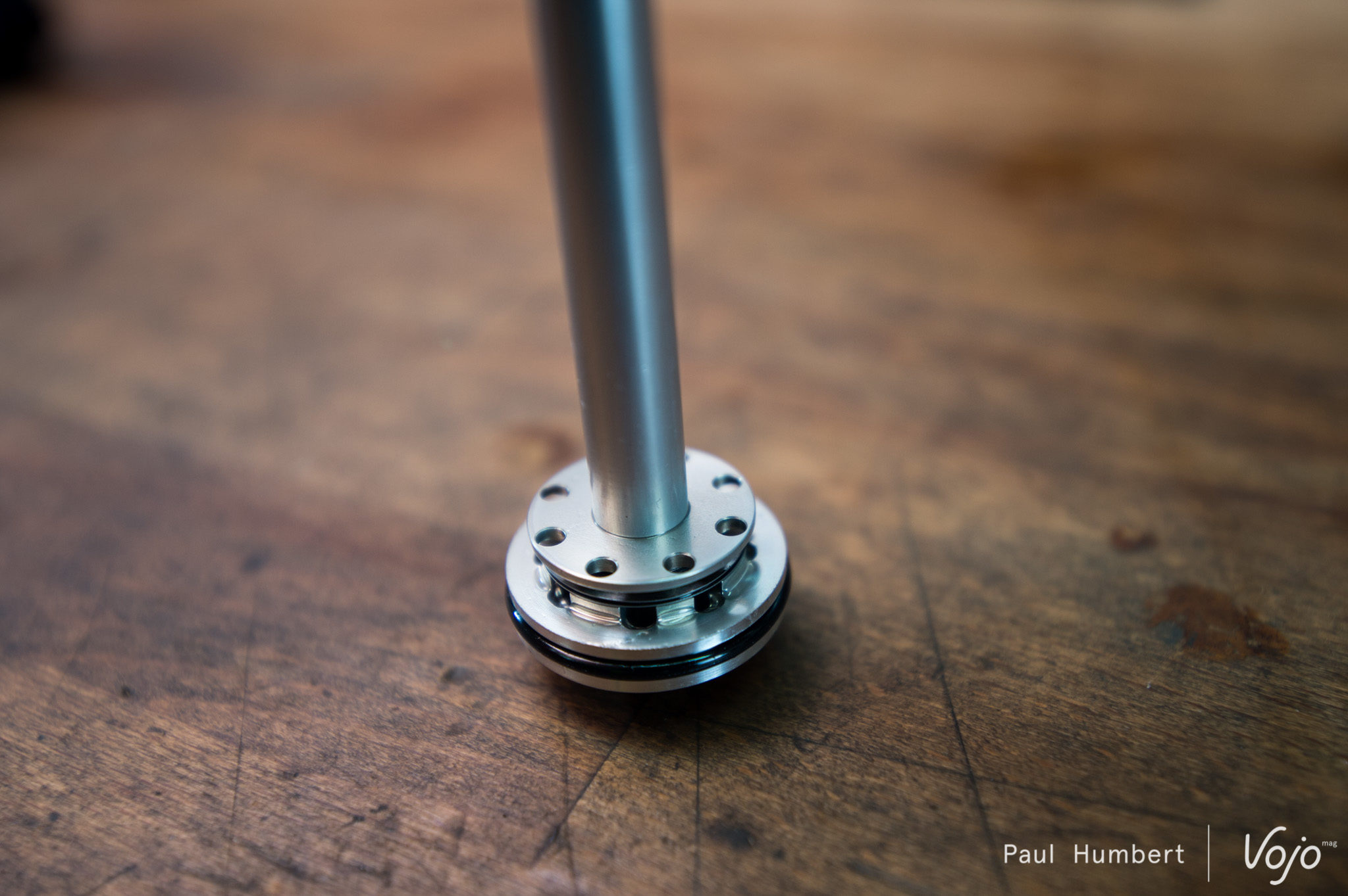 On n’ose imaginer le casse-tête et les heures de CAO, FAO, et autres tests (mesures et terrain) pour arriver au résultat final… Plus classiquement, on retrouve au pied de la cartouche UP le piston que Fast supension a développé depuis des années et qui fait déjà le bonheur de beaucoup d’utilisateurs. Il est associé à une clapeterie sur mesure en fonction du gabarit et de la pratique du pilote. Il suffit de demander, mais préférez plutôt un réglage moyen ! Pour info la cartouche Rockshox Motion control ne possède aucun circuit réel de compression en hydraulique. On trouve juste un passage d’huile plus ou moins réglable par l’intermédiaire d’une guillotine qui permet d’aller jusqu’à un verrouillage complet. Le Kit Up ne possède quand à lui pas de blocage.