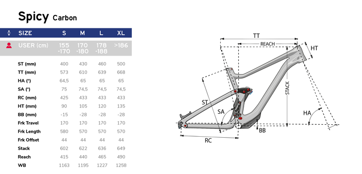 Malgré ses 170 mm de débattement, le Spicy va beaucoup moins chercher dans les extrêmes en matière de géométrie que de nombreux modèles lancés ces deux voire trois dernières années. On pourrait presque le qualifier de « sage », avec son angle de direction à 65° ou son reach de 465 mm sur notre modèle d’essai en taille L (une valeur de taille M chez d’autres marques) !