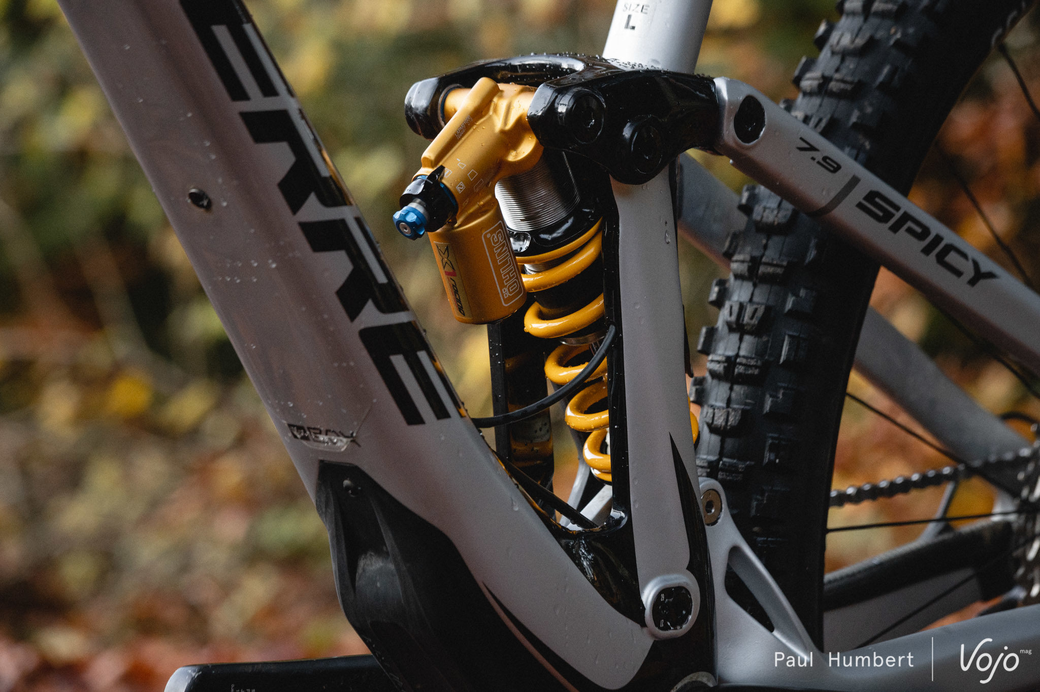 On l’évoquait en introduction, ce Spicy CF 7.9 est équipé de suspensions Öhlins. Le spécialiste suédois se fait rare en première monte, c’est donc un joli coup de Lapierre qui permet d’attirer encore un peu plus (s’il était besoin) les regards sur cette jolie machine. On profite ainsi d’une RXF36 R à l’avant et d’un TTX 22M Coil à l’arrière, avec bien sûr un ressort au tarage différent pour chaque taille de cadre.