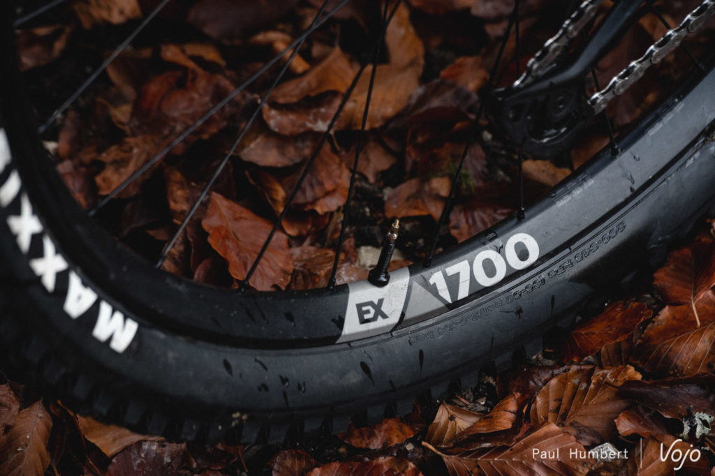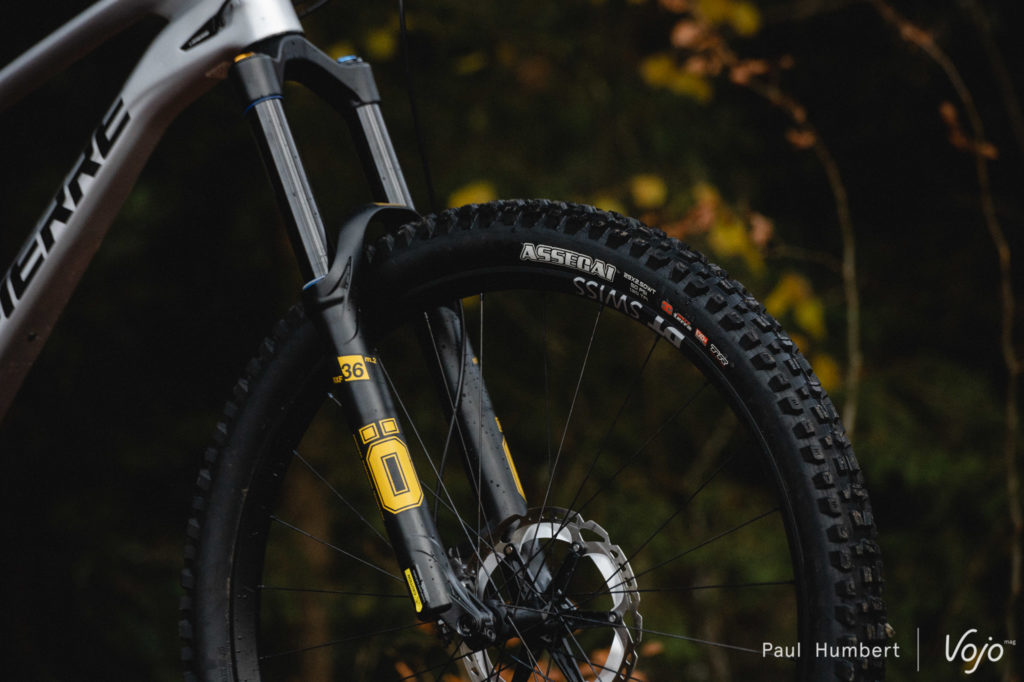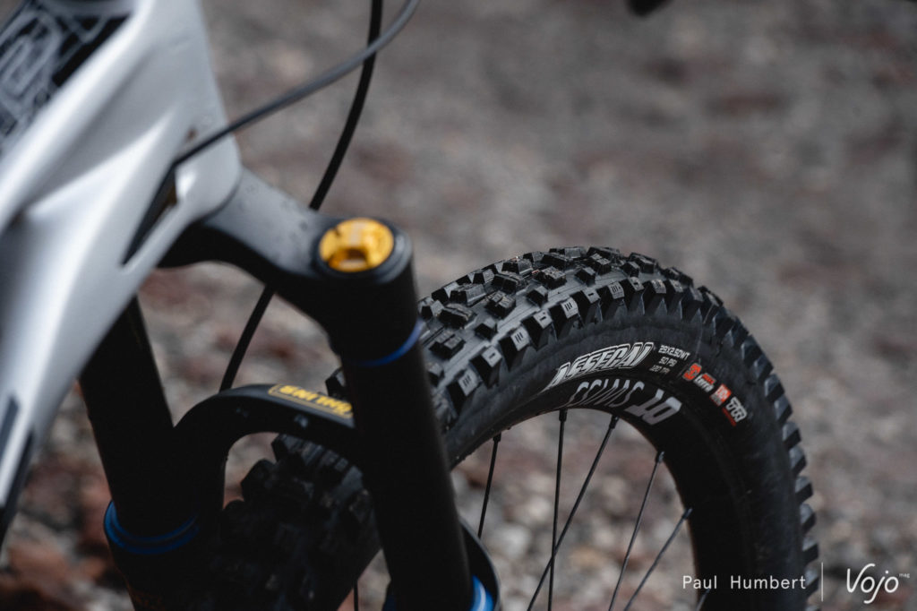 Sans être exceptionnel, le train roulant est également à la hauteur : de fiables roues DT Swiss E1700 (30 mm de largeur interne) chaussées de pneus Maxxis, avec un Assegai 2.5 WT devant et un DHR II 2.4 WT derrière. Seul le choix de la carcasse interpelle, puisque l’Assegai est en DoubleDown, très solide et adapté à l’enduro, mais le DHR II est en Exo, un peu léger à notre goût. A défaut de monter deux DoubleDown ou deux Exo+, inverser au moins les deux carcasses (Exo à l’avant et DD à l’arrière) aurait eu un peu plus de sens car la roue arrière est plus exposée aux crevaisons.