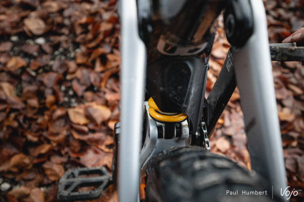 A défaut d’être un espace de stockage efficace, cette LP Box fait néanmoins office de bonne protection contre les impacts pour le tube diagonal et ne montre aucun signe de fatigue, alors que nous l’avons roulée vide la plus grande partie du test. De manière générale, les éléments de protection sont de bonne facture et couvrent suffisamment les zones exposées. Seul le bas de l’amortisseur n’est pas complètement protégé, sûrement pour ménager suffisamment d’espace à la roue arrière.