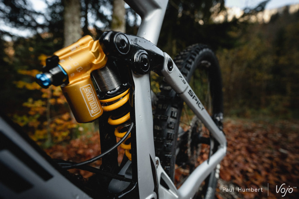 Comme de coutume, on commence par pédaler et dans ce domaine, force est de constater que le Spicy s’en sort (très) bien. L’absence de levier de blocage sur l’amortisseur Ohlins ne se fait pas sentir au train et le vélo garde du répondant sous la pédale. Avec le Spicy, les montées sont loin d’être un calvaire et peuvent même se montrer agréables… tant que la pente n’est pas trop raide. La faute à l’angle du tube de selle, qui place vite le pilote dans une position inconfortable lorsque les pourcentages augmentent.