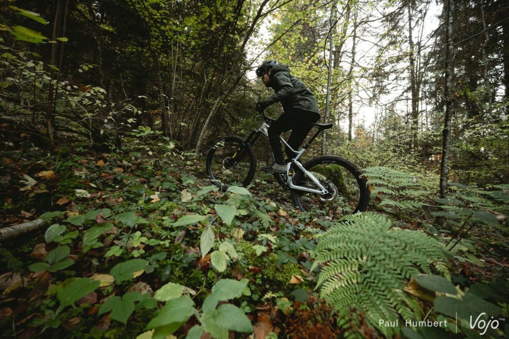 On bascule dans la descente et on se sent immédiatement à l’aise au guidon du Spicy. A titre personnel, le reach de 465 mm me convient parfaitement (je mesure 1m79) et la géométrie est bien équilibrée. Face à d’autres enduros modernes, le Spicy est plus vif, plus maniable grâce à ses bases courtes et son angle de direction pas trop couché, mais ce n’est pas pour me déplaire.