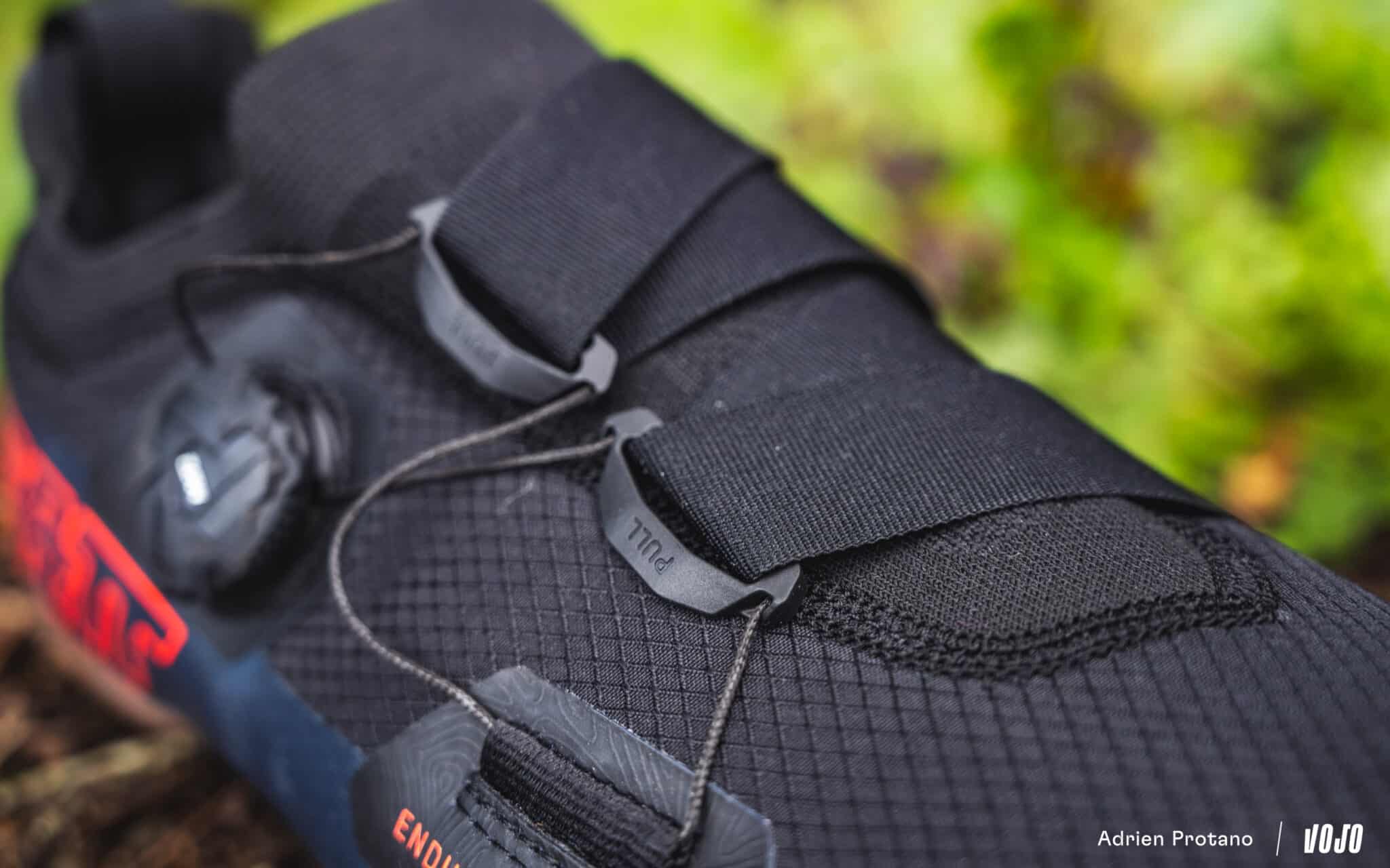 Le système de fermeture repose sur une molette MOZ (similaire à du BOA) associée à des sangles élastiques et des D-rings, permettant un ajustement précis et rapide.