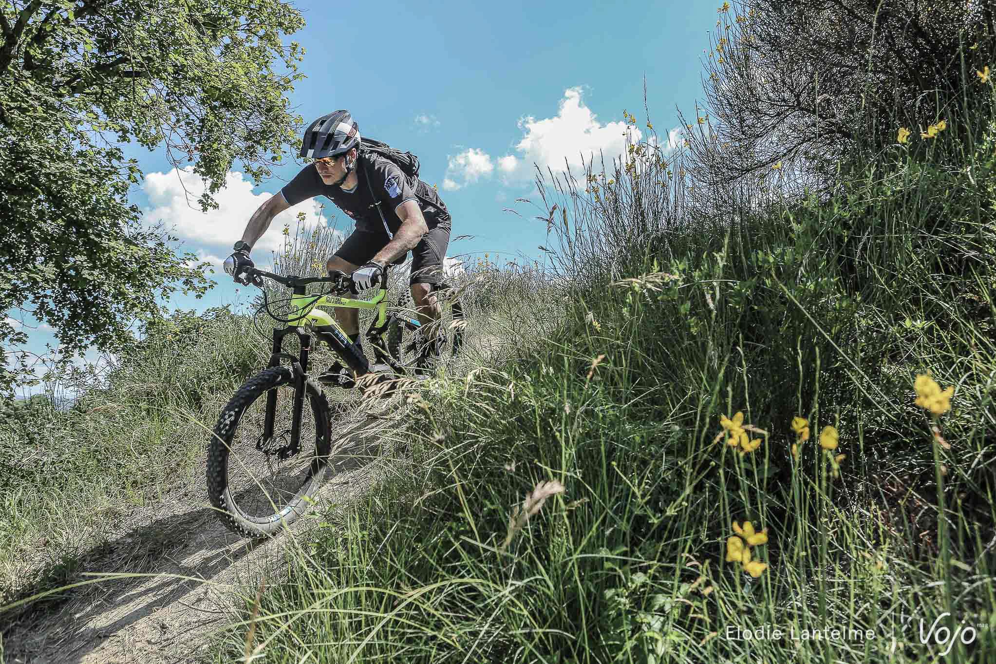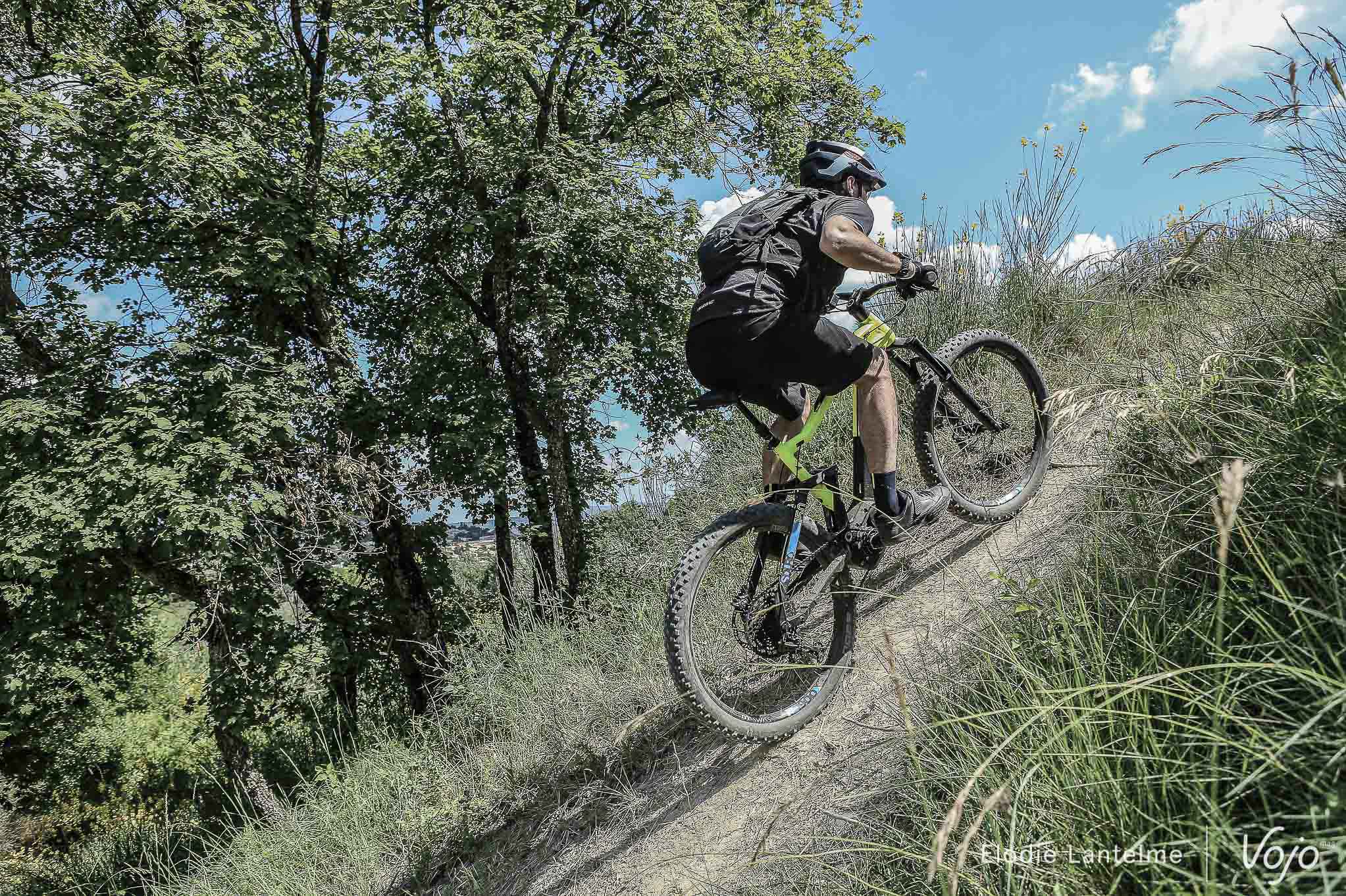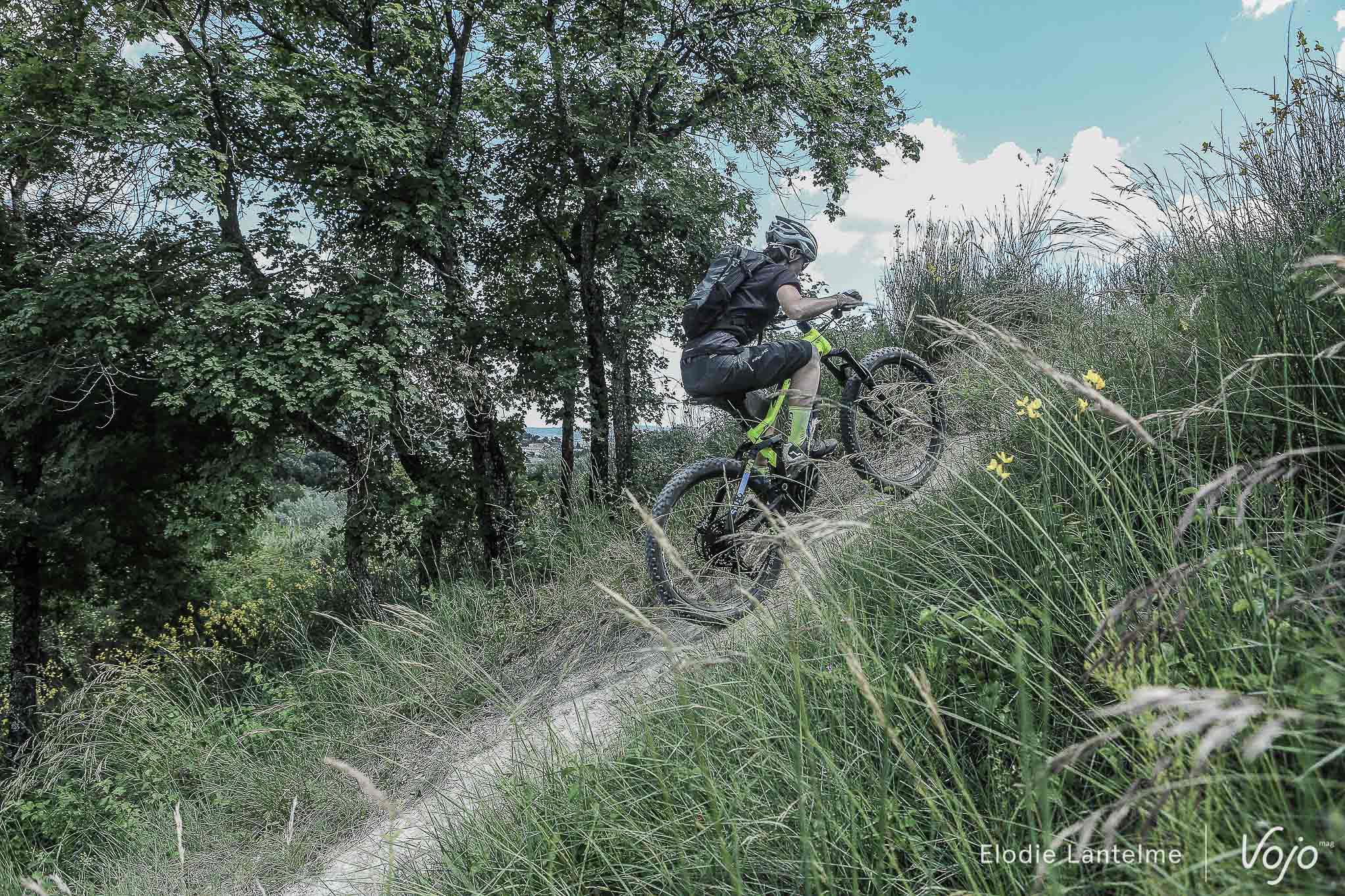 Un peu plus habitués aux rudiments du pilotage spécifique au VTT électrique – et aidée par un guidon recoupé de 6 cm pour Nathalie –, nos trois testeurs poursuivent leur découverte du Full Seven LT sur les singles autour de Volx.
