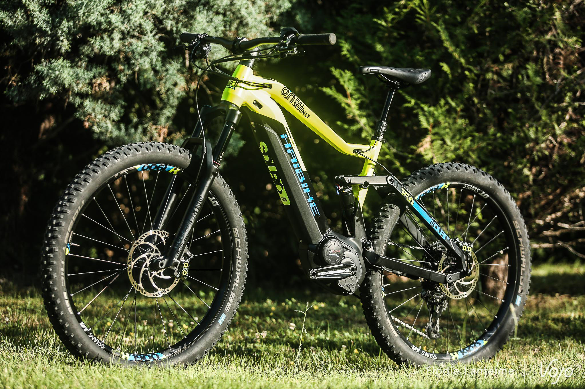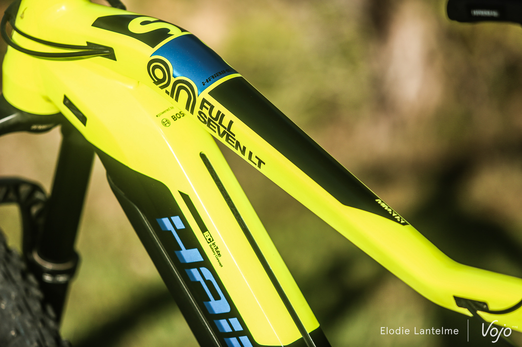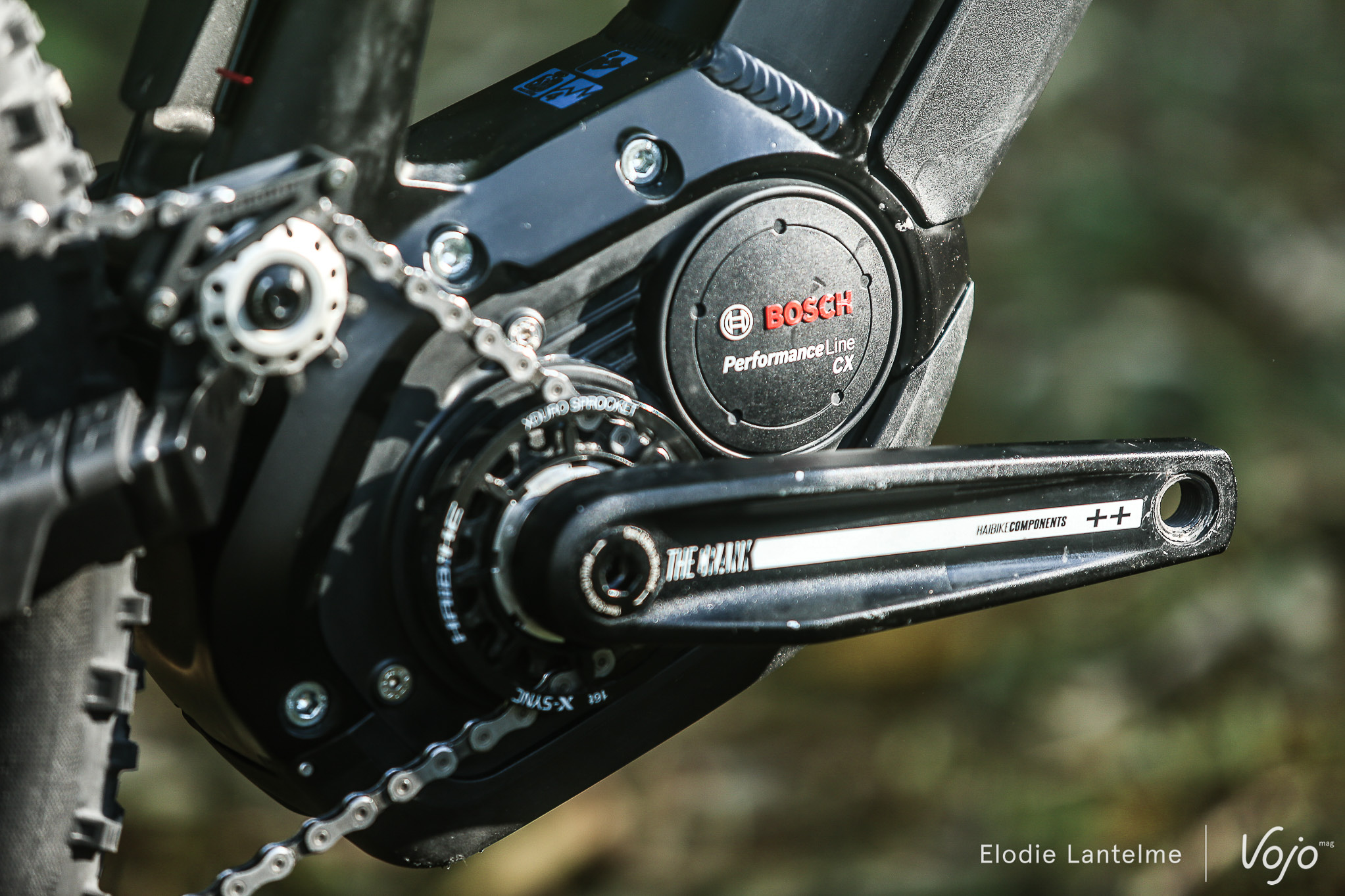 Tout comme le train roulant, qui mêle la version Hybrid des roues DT Swiss (compatibles tubeless d’origine, en 35 mm, et réputées pour leur efficacité en termes de comportement) et les pneus Schwalbe 27,5+ en section 2,8 à carcasse Apex renforcée, spécifique électrique.
