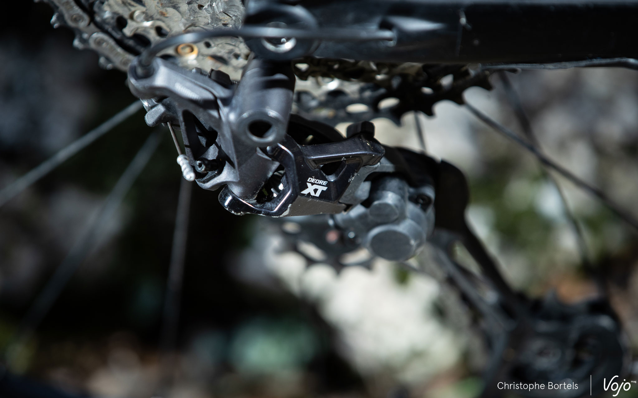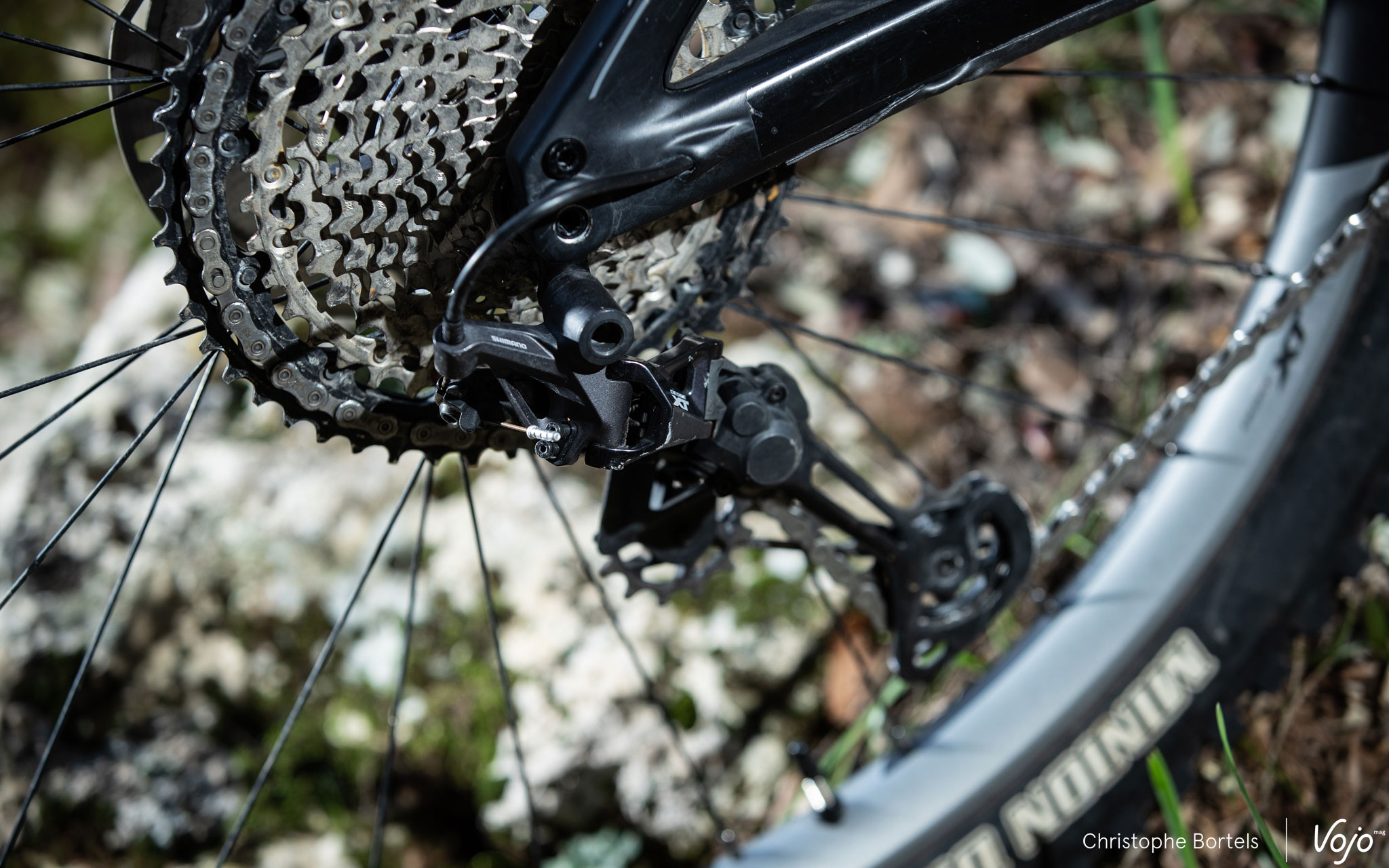Sur le terrain, le XT 12 aime être malmené. C’est d’ailleurs exactement pour ça que l’Hyperglide+ a été conçu : supporter les passages de vitesse en charge, sans marquer de temps mort pour permettre à la transmission de digérer les contraintes, ce qu’il fait à merveille, sans broncher. On peut donc improviser sans trop réfléchir et sans avoir l’impression de tout casser. En rando comme en XC ou en enduro, c’est appréciable ! A la descente sur la cassette aussi le XT 12 se montre excellent, sans claquement excessif. Bref, du tout bon au niveau du dérailleur, ou presque…