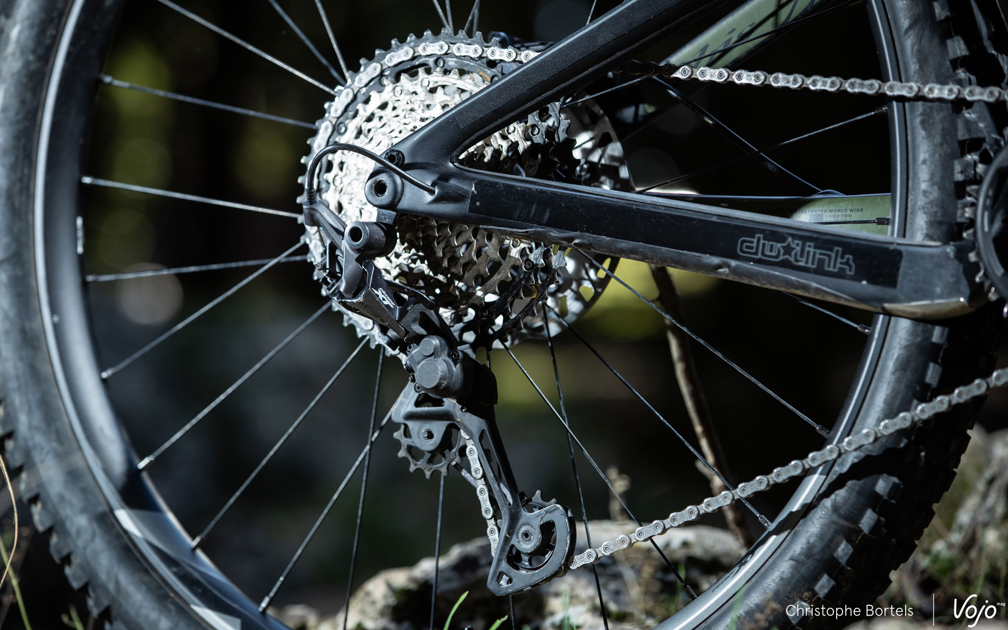 Le Shimano 12 vitesses est clairement très facile à régler. La tension ne doit pas être d’une précision chirurgicale pour que la transmission se montre efficace et, du coup, elle ne se dérègle pas facilement non plus, une fois le petit ajustement inévitable après une ou deux sorties effectué. A l’arrière de la chape, comme sur le XTR, on retrouve un petit témoin qui indique à quelle hauteur doivent se trouver les dents du plus grand pignon, ce qui permet de régler facilement et avec précision la fameuse petite vis d’englobé qui joue sur la distance galet supérieur/cassette.