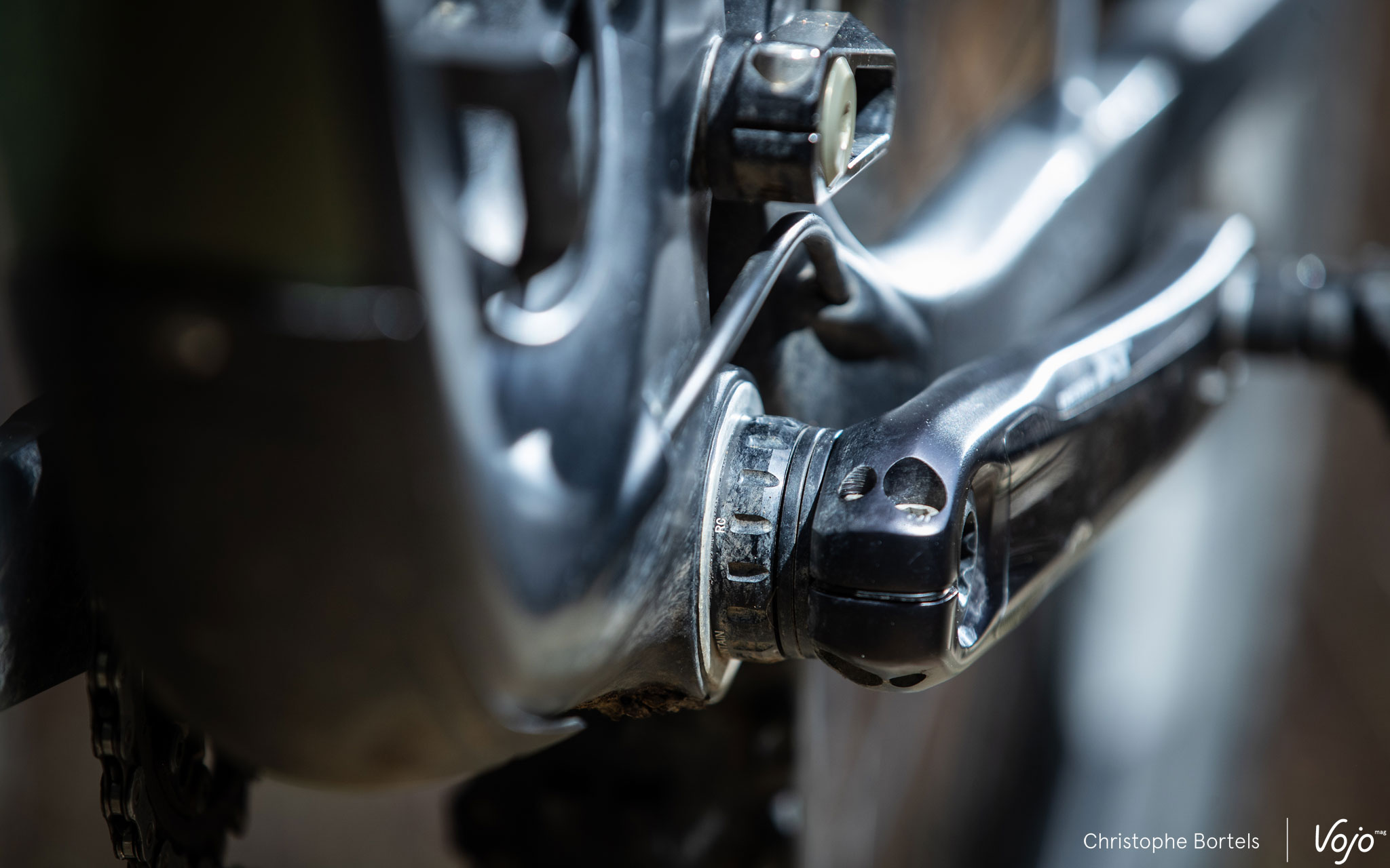 Après investigation, il s’avère que le souci est à la fois très simple mais malgré tout embêtant. Il suffit en effet que le petit rouleau situé dans le mécanisme de friction de la chape (celui qui sert à éviter que la chape bouge trop sur les gros chocs et entraîne un déraillement au niveau du plateau) ne soit plus assez graissé pour qu’il y ait… trop de friction. Le mécanisme en question se coince alors et la chape ne bouge plus ou très difficilement. Heureusement, il est très facile d’accéder au petit module de friction pour le regraisser ou tout simplement le remplacer entièrement s’il est trop corrodé. Attention, il est absolument indispensable d’utiliser une graisse spécifique (référence : Y04121000, et pas la Y04120800 comme nous l’indiquions initialement, celle-ci étant prévue pour les transmissions 11v), nous avons testé avec de la graisse standard et ça ne fonctionne pas… Quoi qu’il en soit, nous vous conseillons vivement de surveiller ce petit mécanisme et de le graisser préventivement pour éviter tout désagrément sur le terrain.