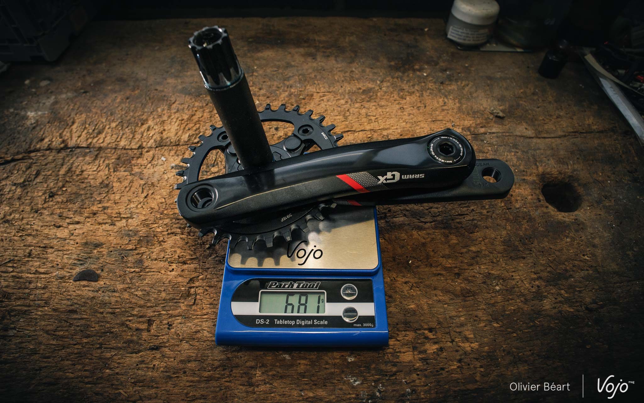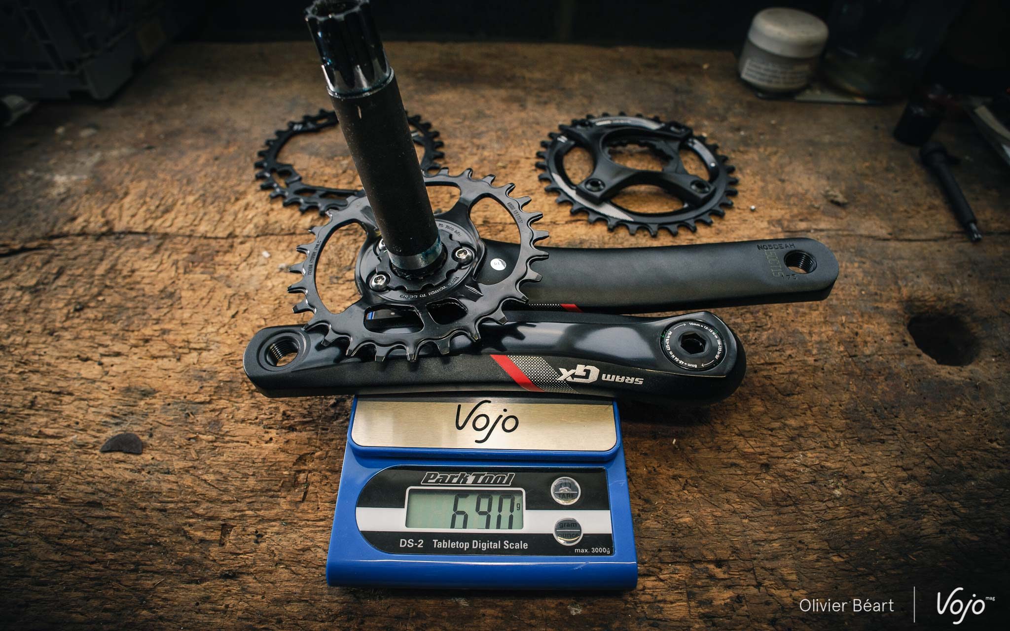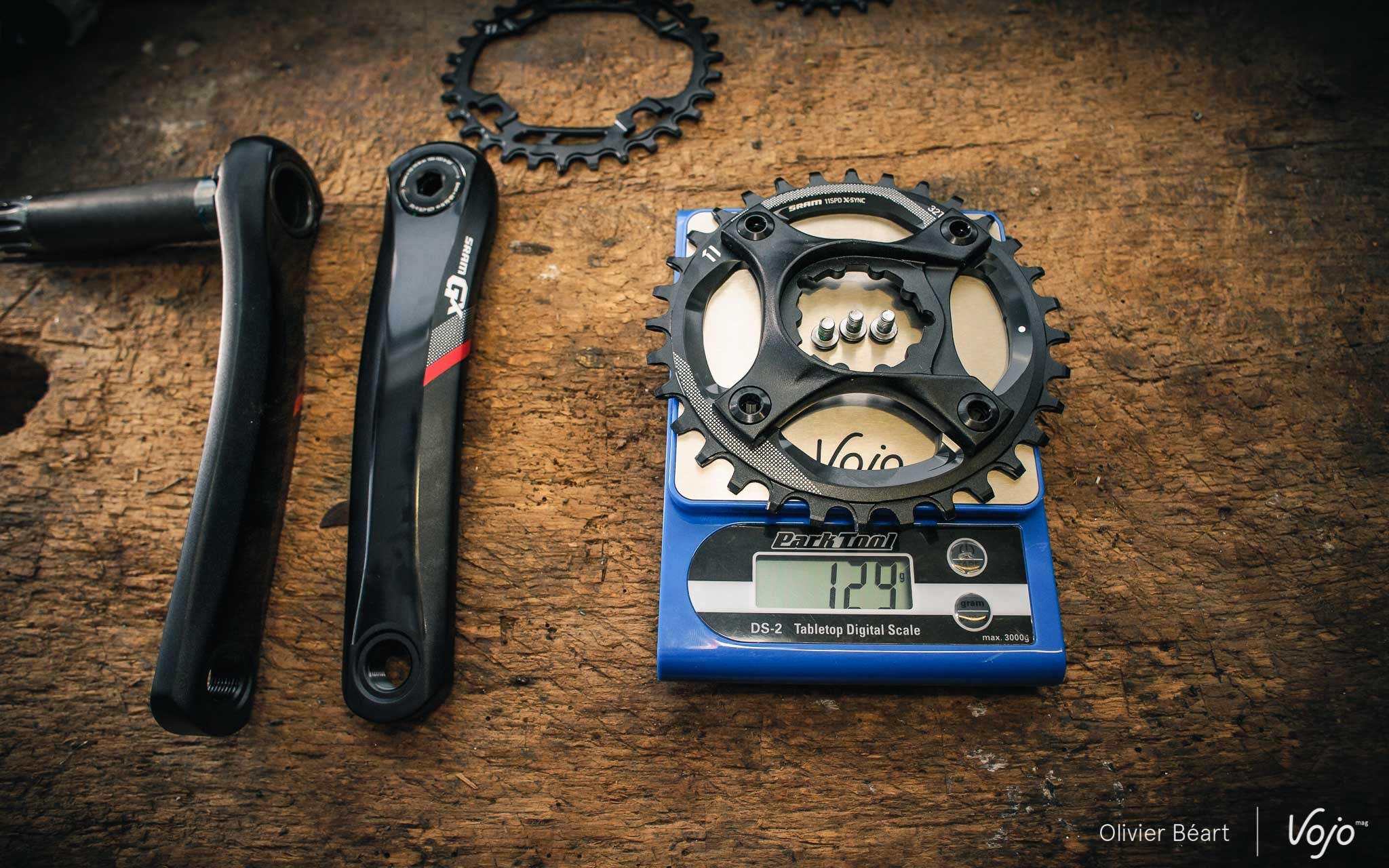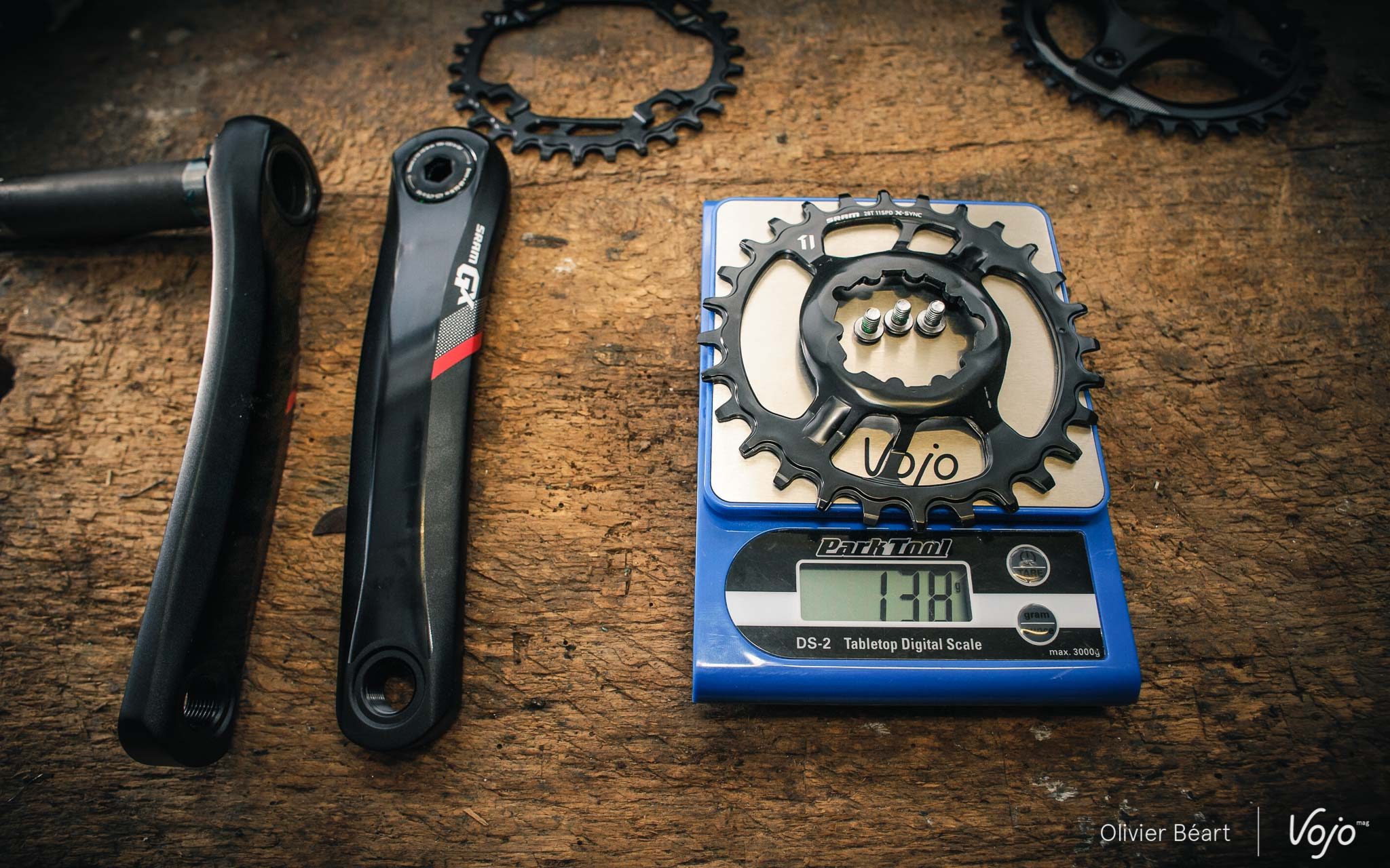 Et puis, tant qu’on parle de poids, il y a une astuce ! En passant sur le 28 dents qui est proposé en Direct Mount (ce qui n’est hélas pas le cas des 30 et 32 dents), on ne prend quasiment pas de poids par rapport à un ensemble étoile + plateau classique en alu. Par contre, à 138g, le plateau 28 DM acier est plus de deux fois plus lourd que le 28 DM alu qui ne pèse que 66g. Cerise sur le gâteau, les plateaux acier coûtent moins de 20€, soit deux à quatre fois moins que les plateaux en alu 4 trous ou Direct Mount. Si leur montage sur un pédalier XX1 carbone n’est pas très cohérent, sur du GX c’est par contre une excellente option.