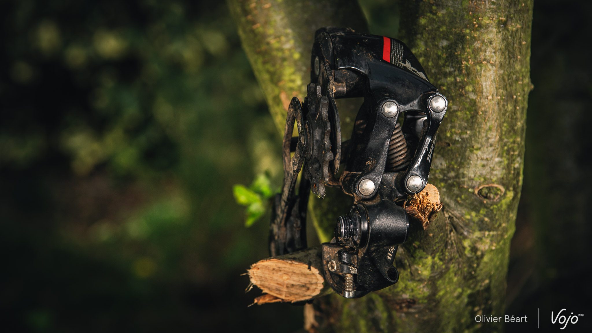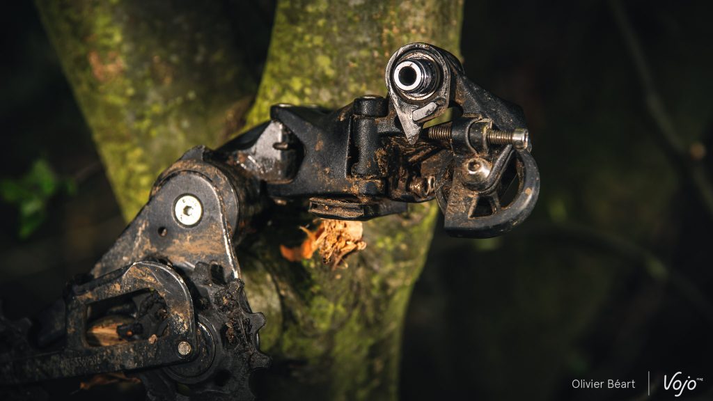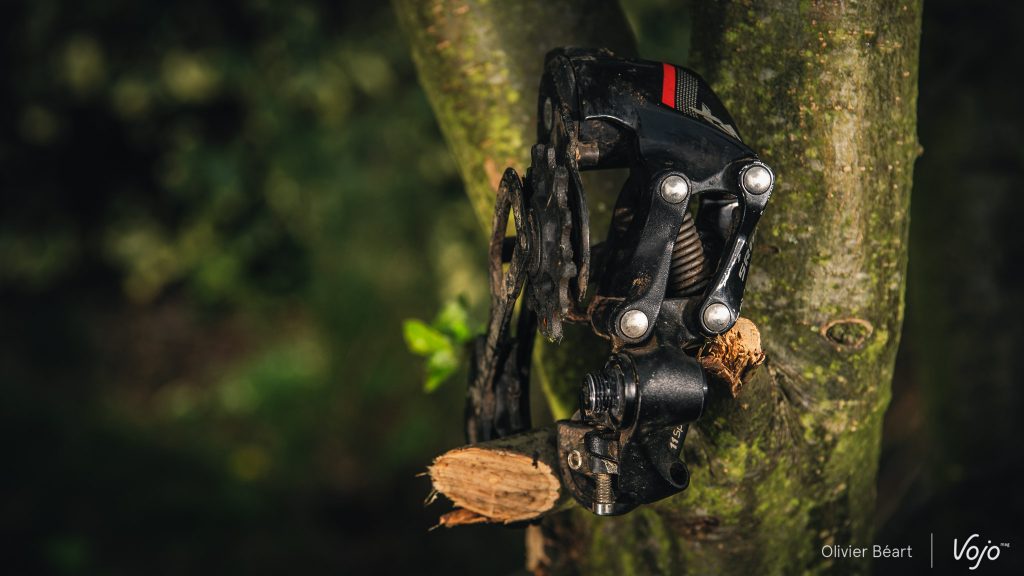 Ce qu’il y a de bien quand on équipe son vélo d’un groupe Sram GX, c’est qu’on le pilote sans trop d’arrière-pensées. Quand vous avez un dérailleur à plusieurs centaines d’euros derrière, quand ça tape, vous avez des frissons. Ici, c’est moins le cas car on sait qu’il ne faudra pas revendre un rein pour s’offrir une nouvelle pièce en cas de casse. Même si on respecte son matériel, inconsciemment, ça joue… et la tête de notre dérailleur de test montre bien qu’on ne lui a pas épargné grand chose. Et pourtant, il a très bien résisté !