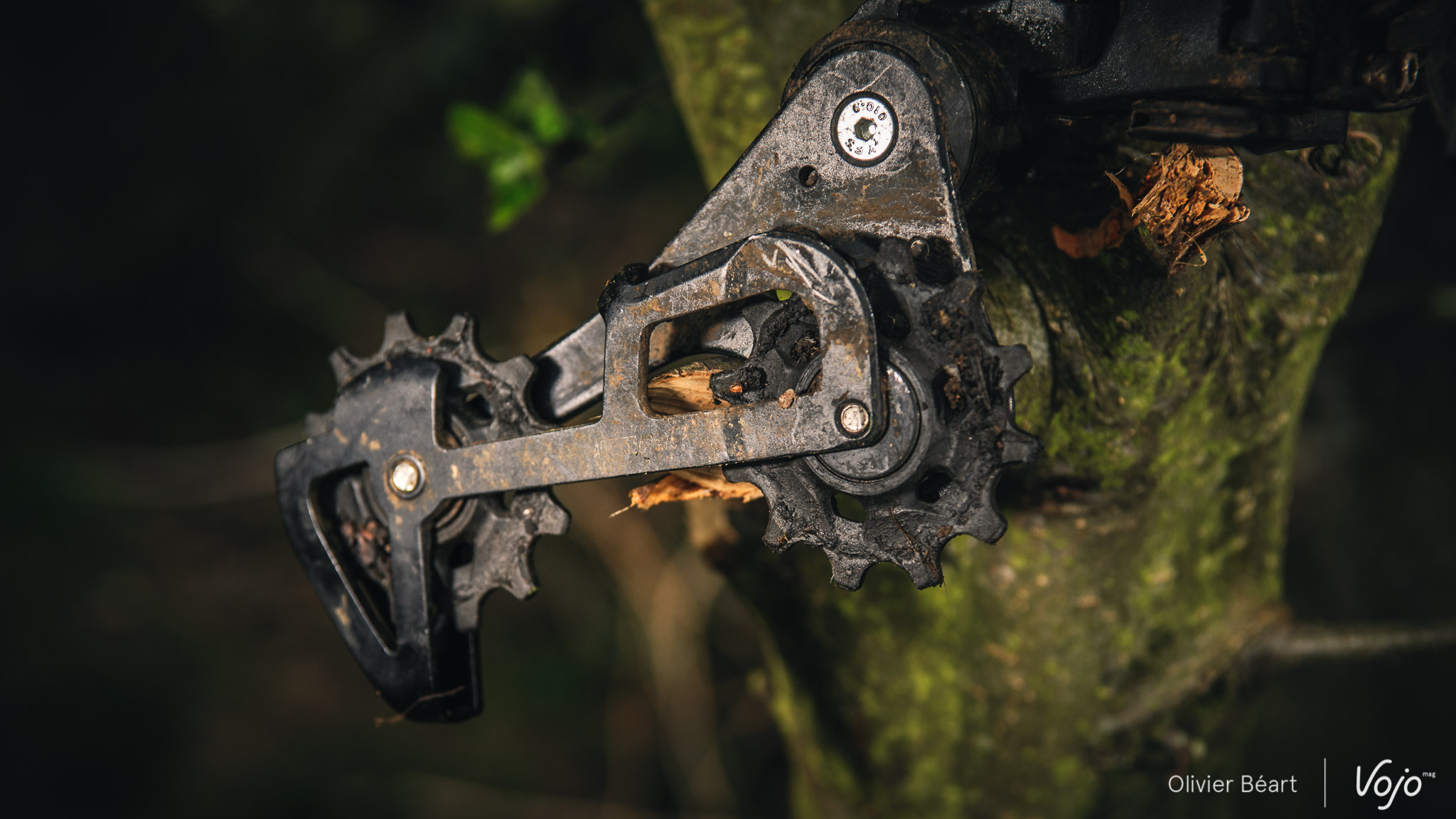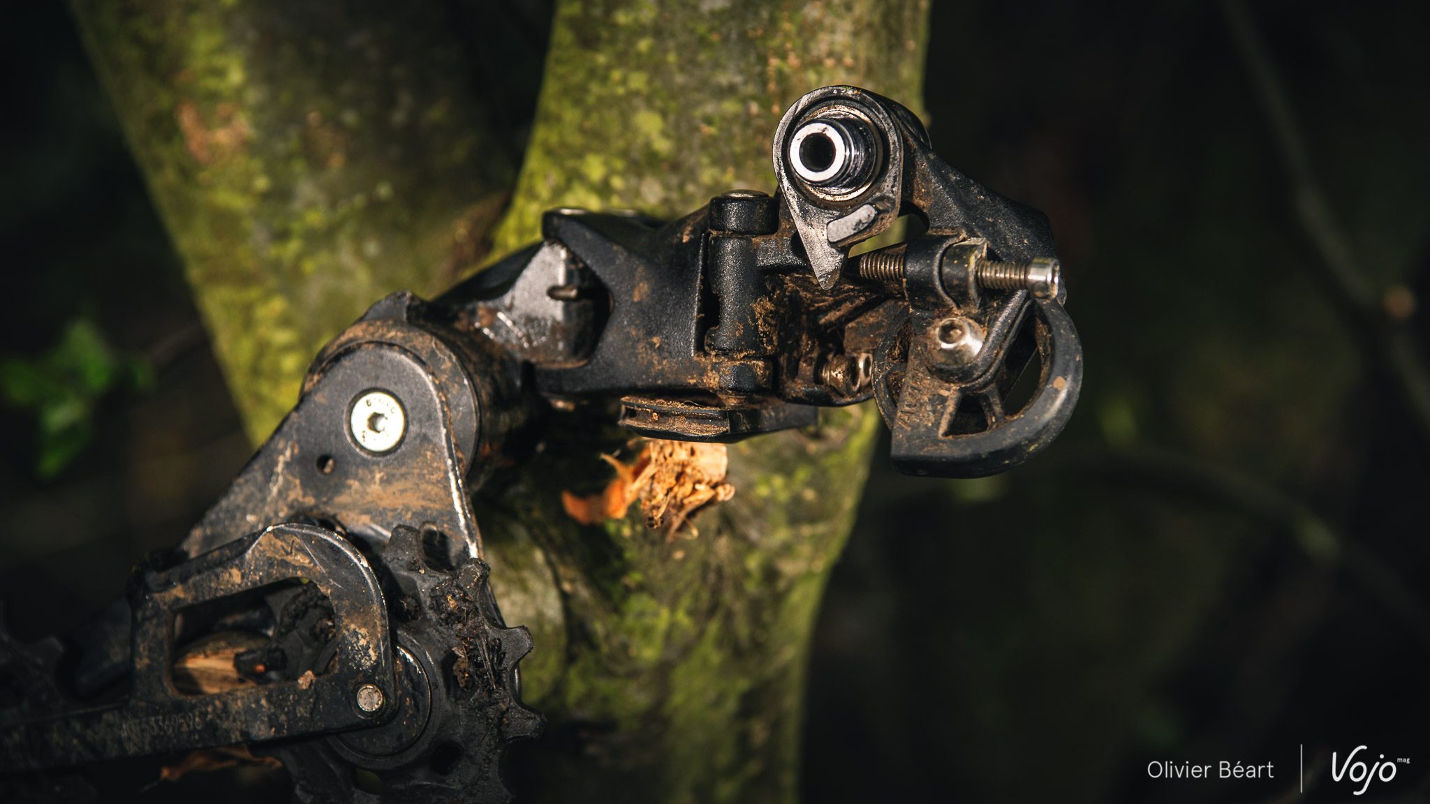 Par rapport à ses aînés plus haut de gamme, l’inspection finale a révélé la présence d’un très léger jeu dans les articulations du parallélogramme. Mais rien de décelable sur le terrain et le fonctionnement est resté absolument irréprochable du premier au dernier jour. Le dérailleur est d’ailleurs encore bon pour le service et il va continuer à rouler après publication de cet article. Il a pris de chocs et il n’est plus neuf visuellement, mais la précision des changements de vitesse reste excellente et il n’a jamais fallu toucher aux réglages initiaux.